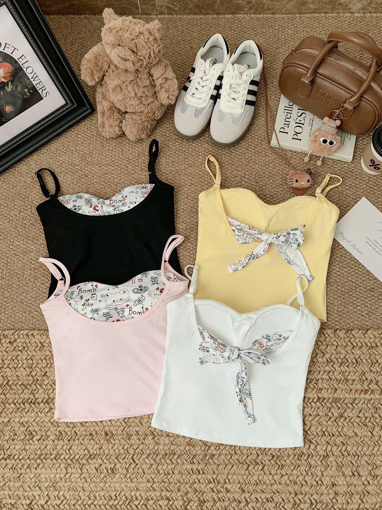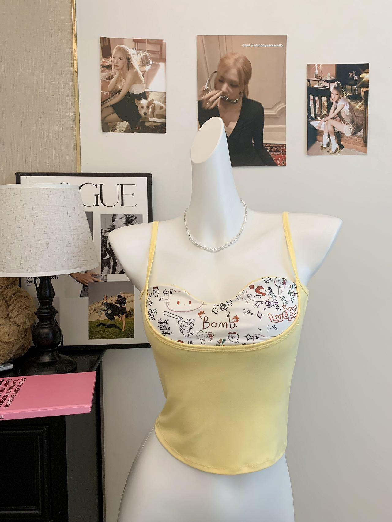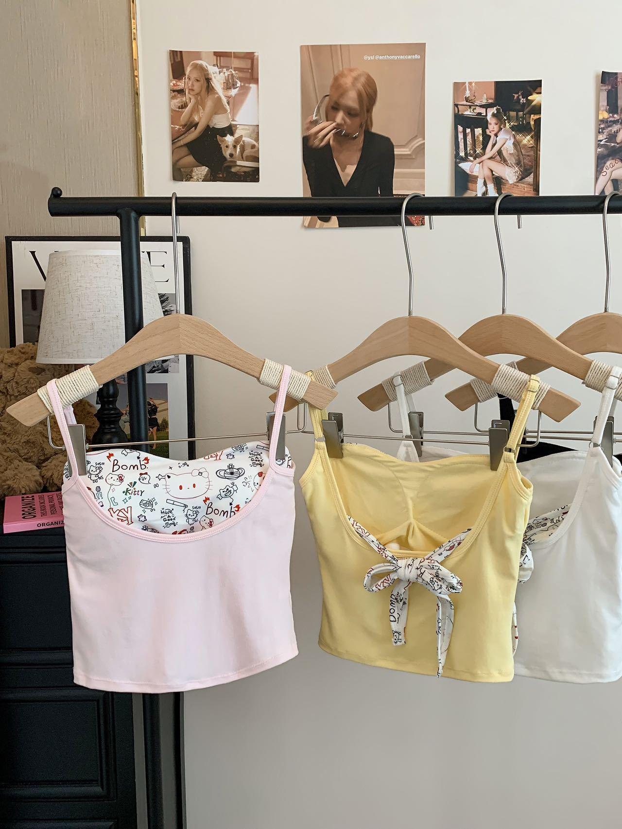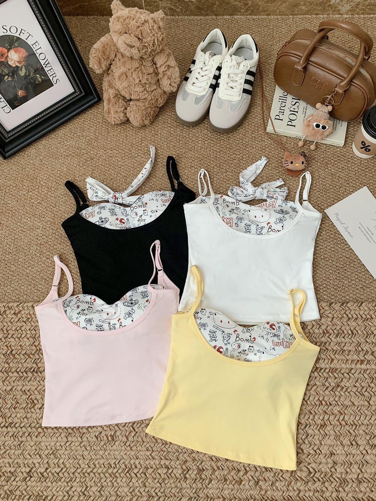 66007 # Rayón Falso Dos Piezas Floral Tirantes Chaleco Dulce de Verano para Mujer Top Básico de Deseo Puro con Almohadillas en el Busto