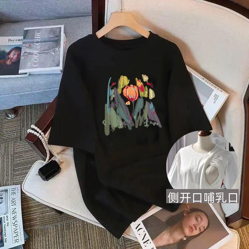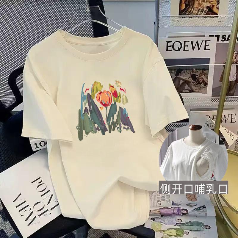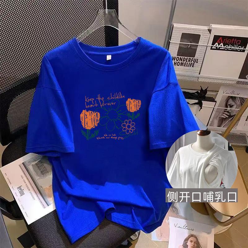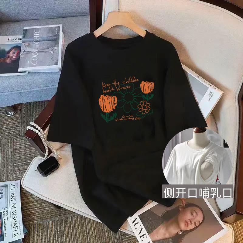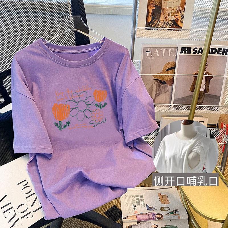 Top de Lactancia Casual de Estilo Coreano con Cuello Redondo Ropa Exterior Primavera Otoño Abertura Lateral Camiseta Manga Corta Trendy Mamá Ropa para Amamantar Corte Holgado
