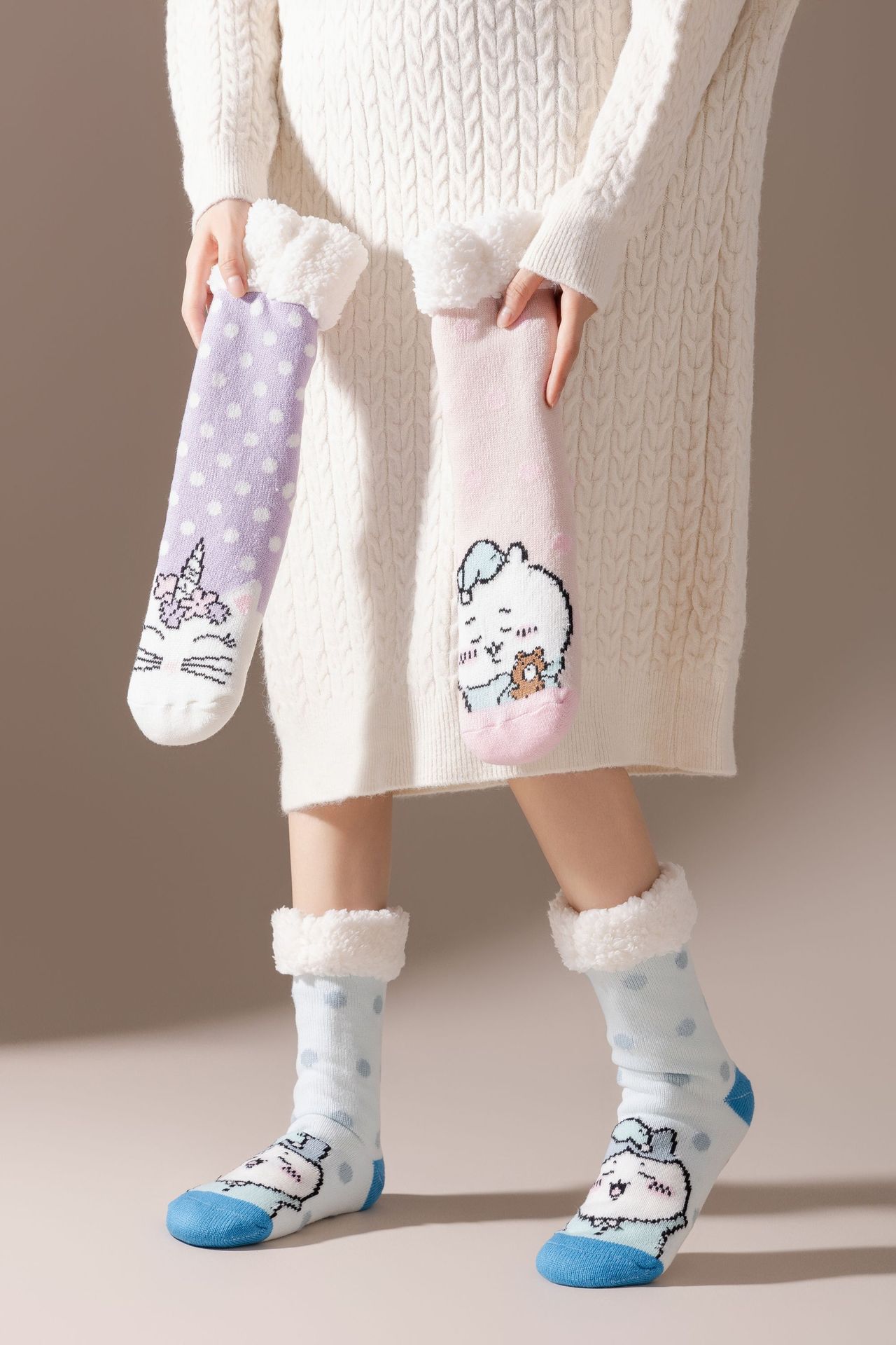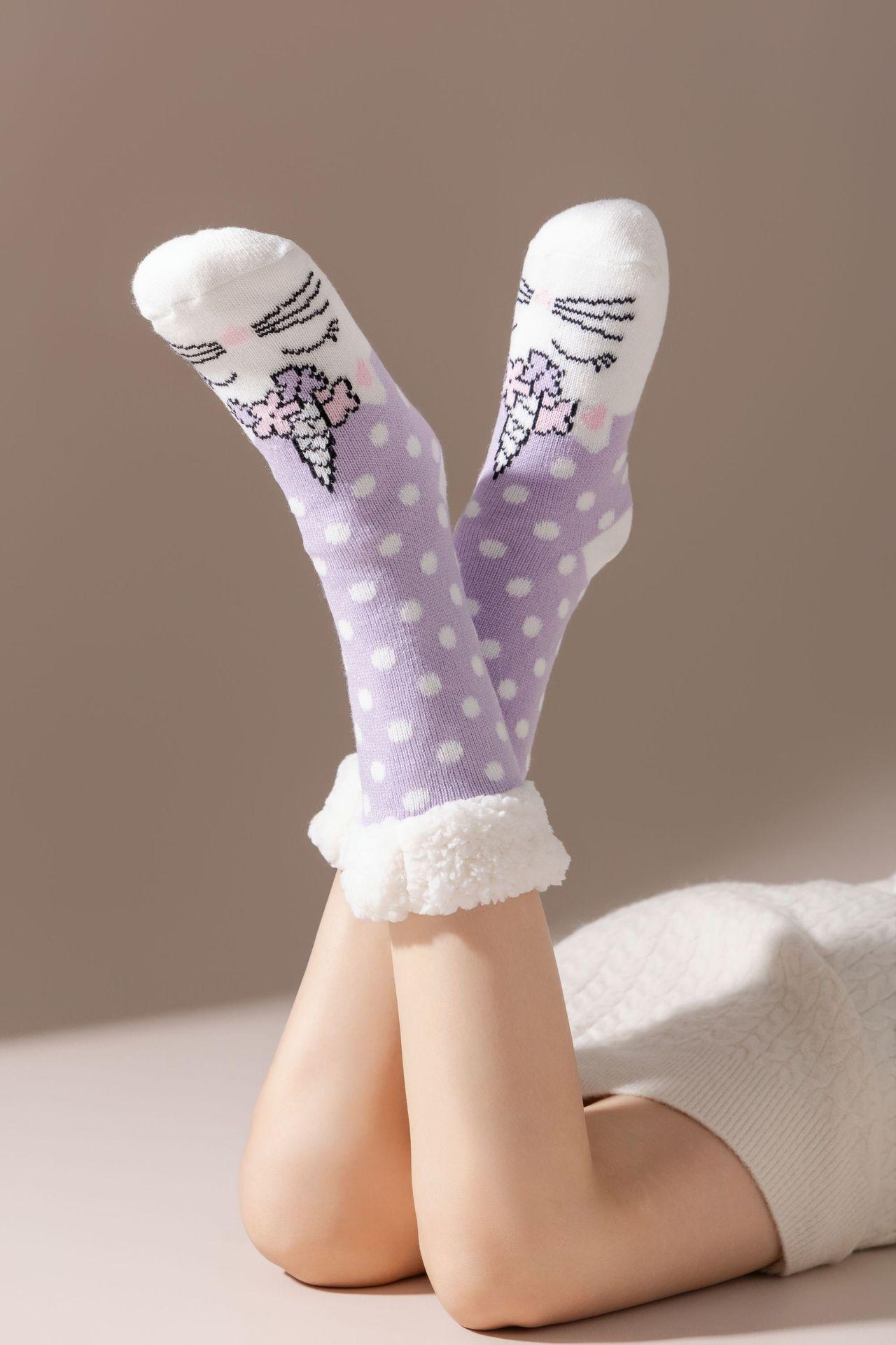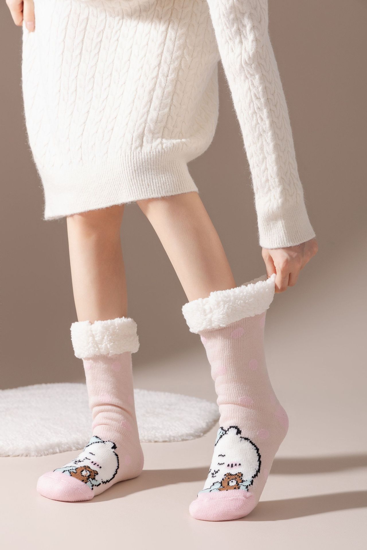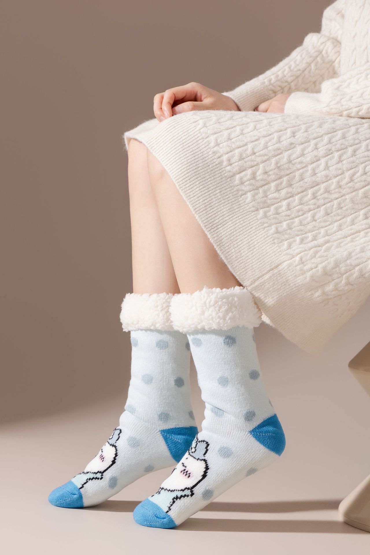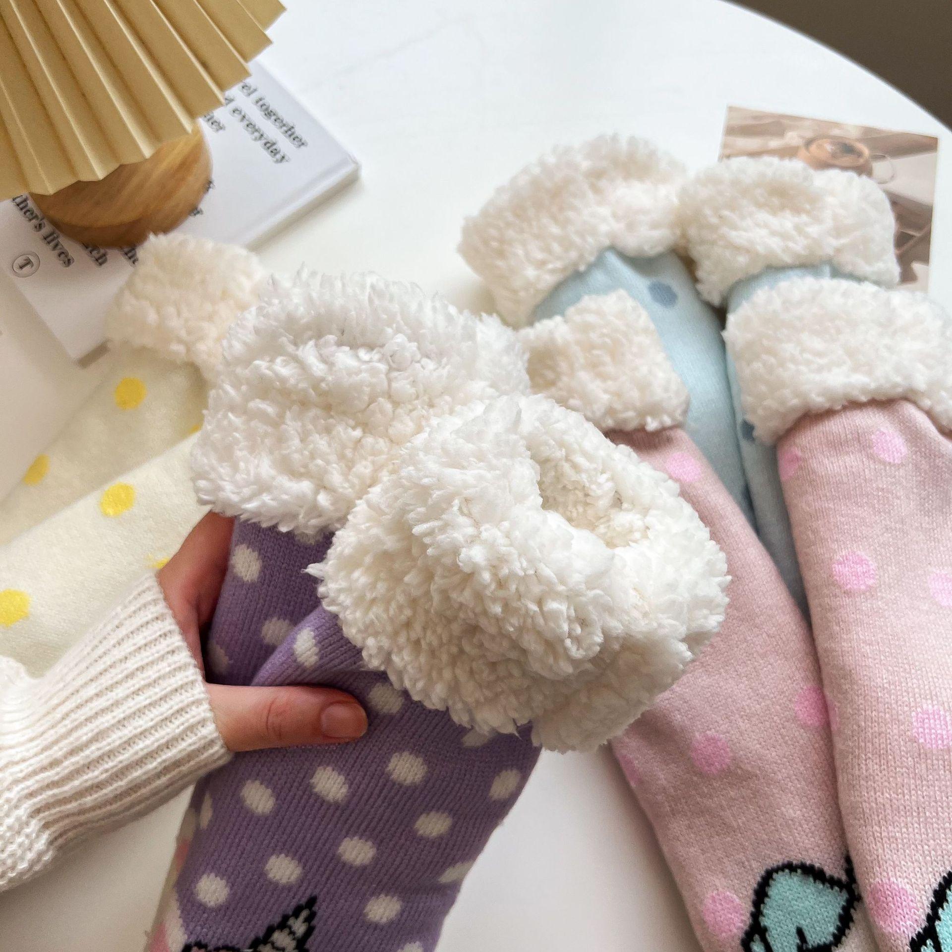 Calcetines de forro polar de coral de otoño e invierno para mujer, nuevos calcetines de felpa gruesos y lindos de dibujos animados hasta la mitad de la pantorrilla para mujer, calcetines para dormir en casa