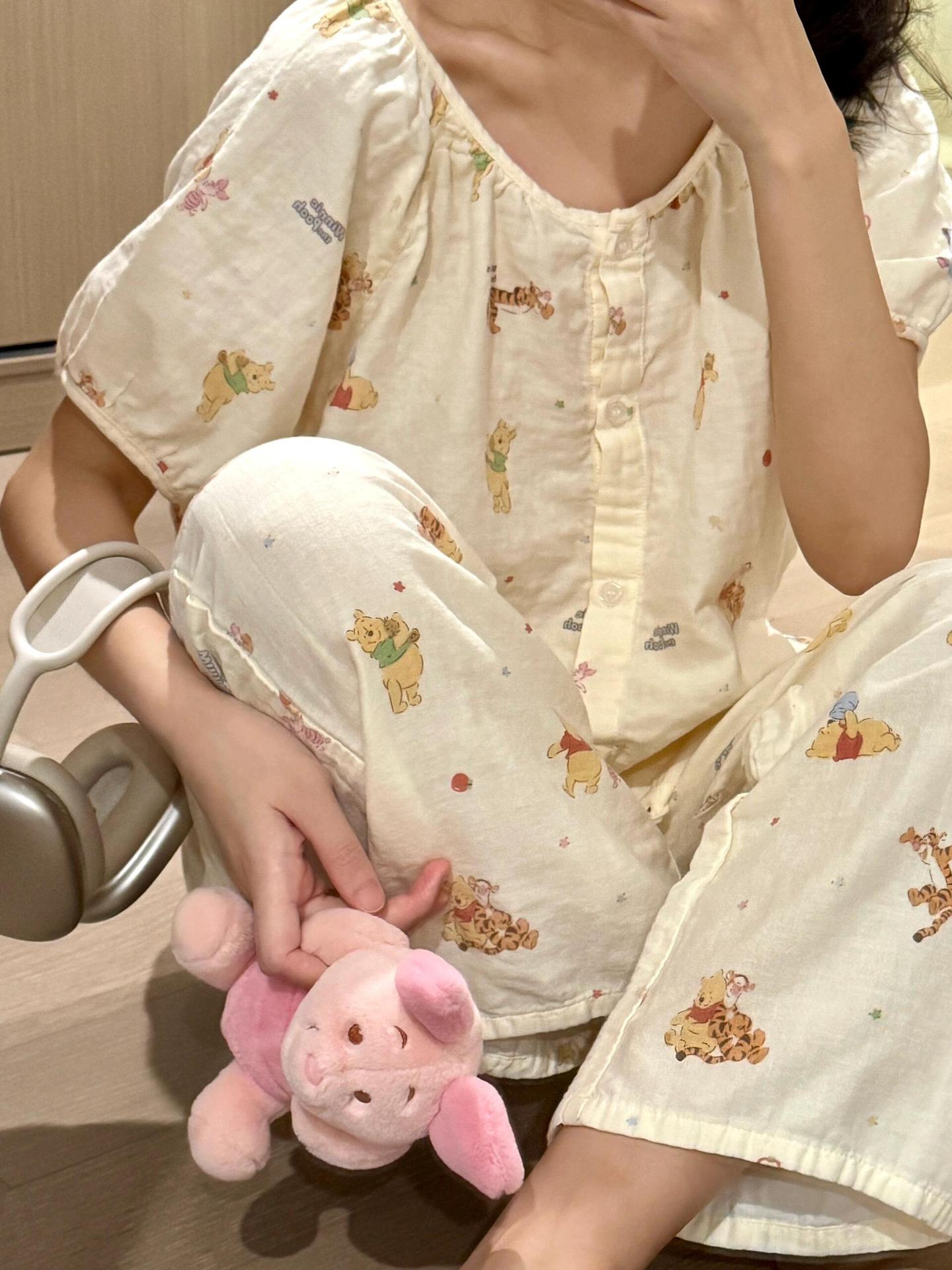Pijama de Manga Corta de Winnie the Pooh para Niña Bonita para Mujer Verano Nuevo Talla Grande Holgado Dulce Pantalón Largo Conjunto Ropa de Casa