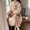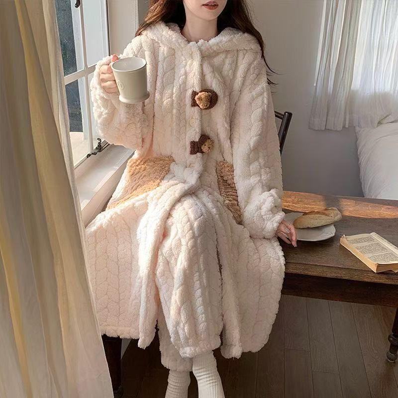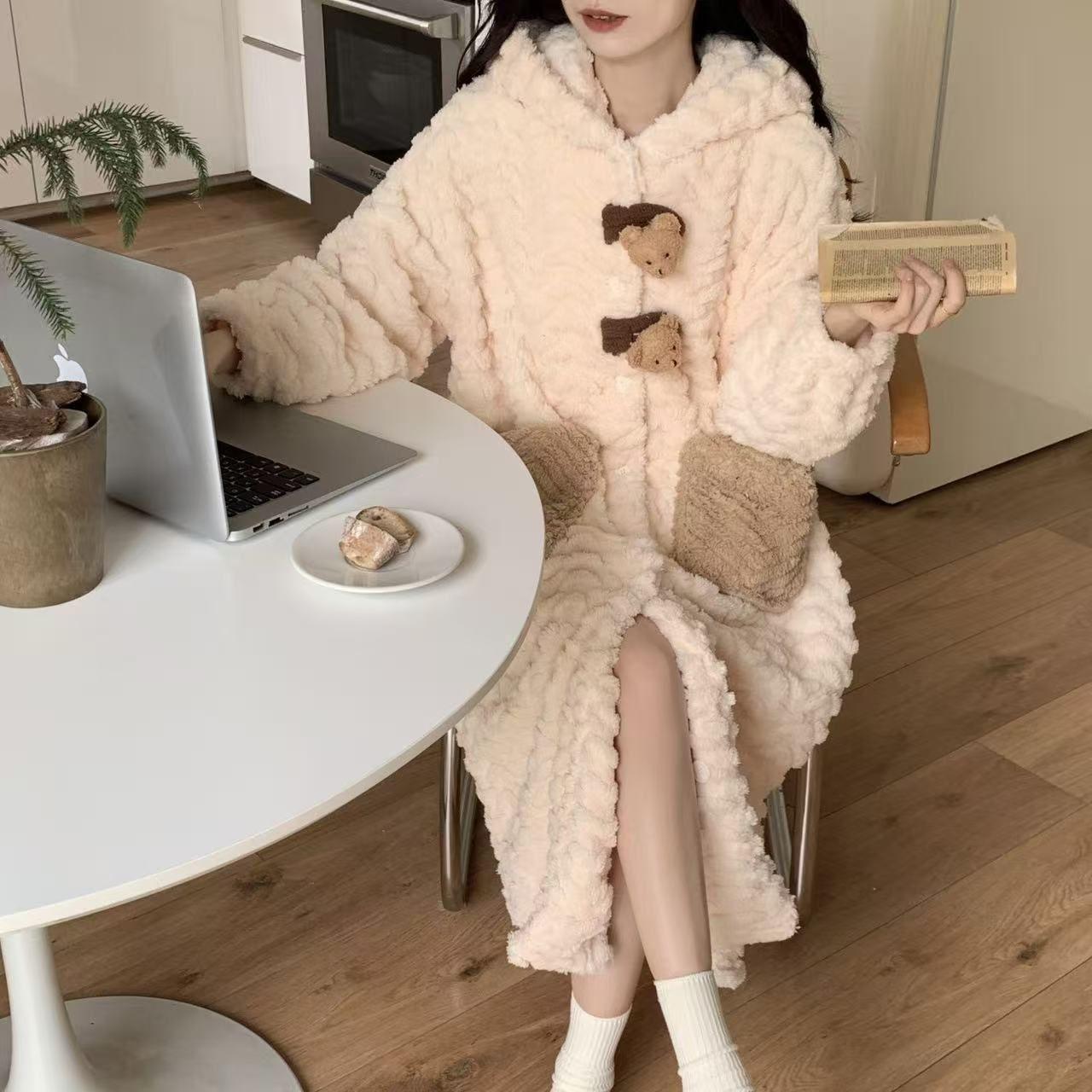 Camisón estilo coreano de osito para mujer 2025 Otoño e Invierno Nuevo Bata con capucha gruesa de terciopelo coral Camisón largo