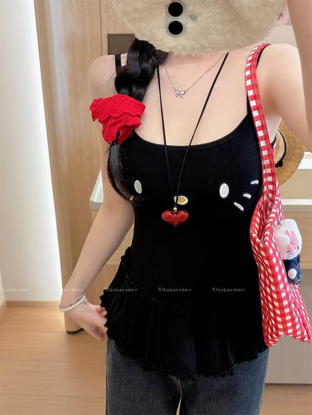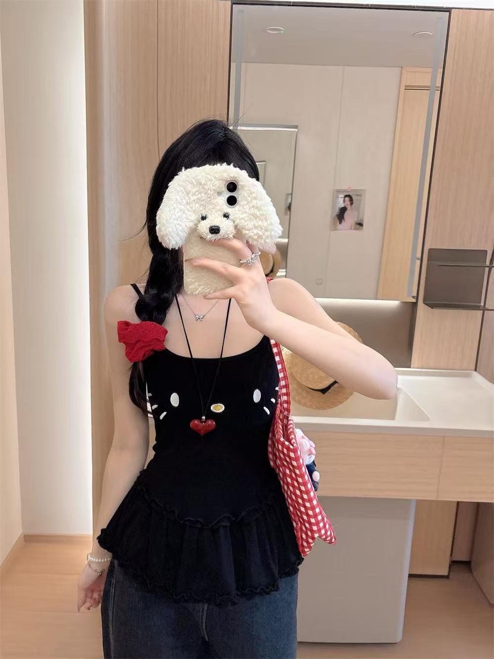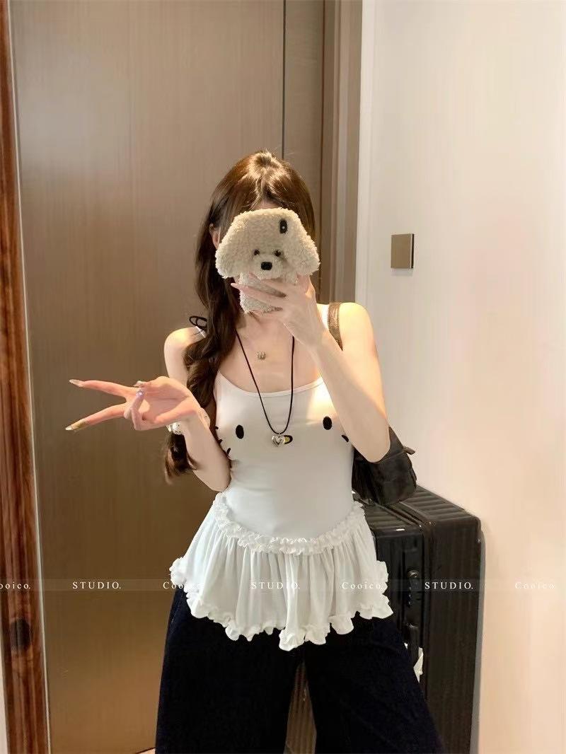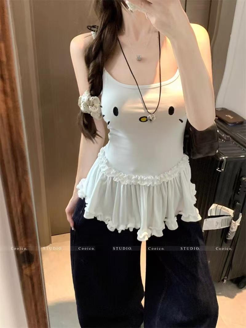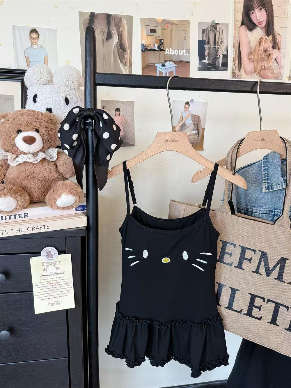 Lindo Top Cami Bordado de Gatito para Mujer Verano Volante Ajustado Ropa Interior Sentido del Diseño Sin Mangas Ropa Exterior Top Marea