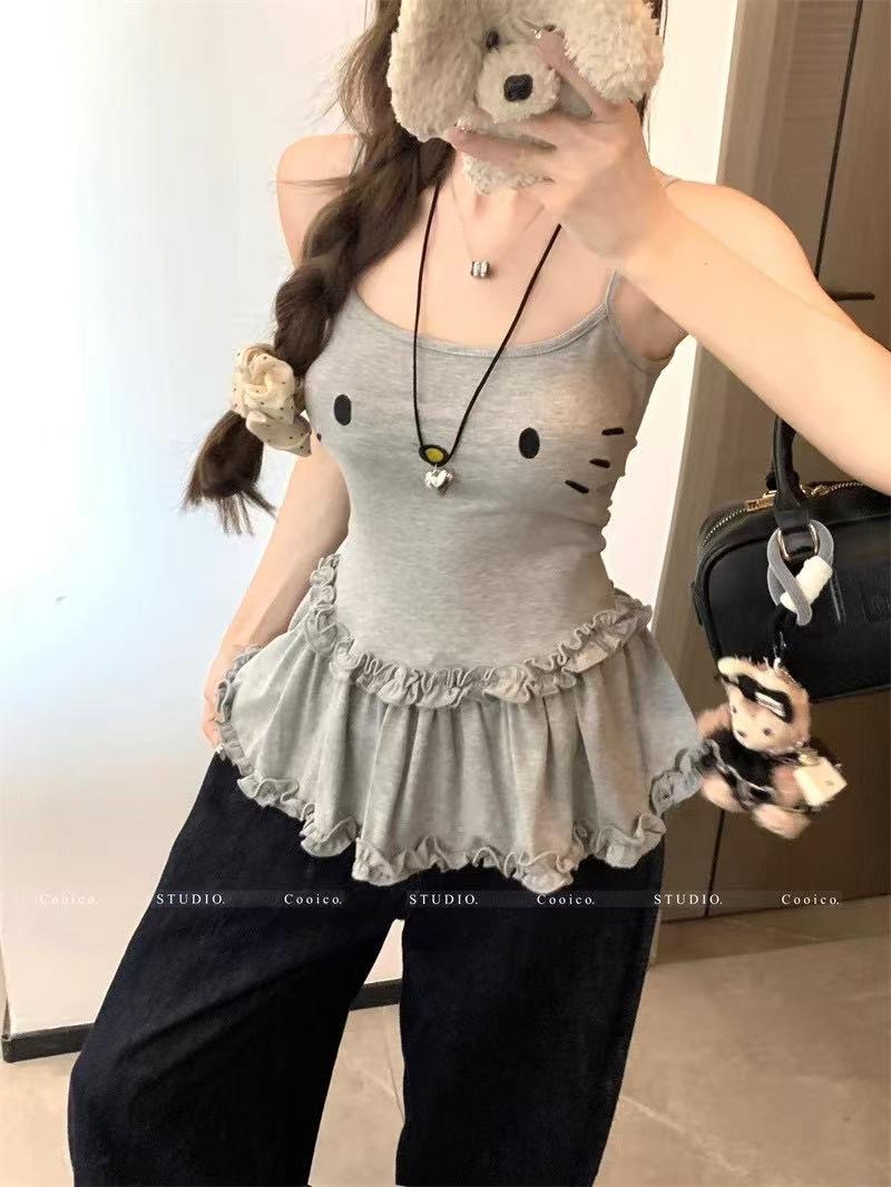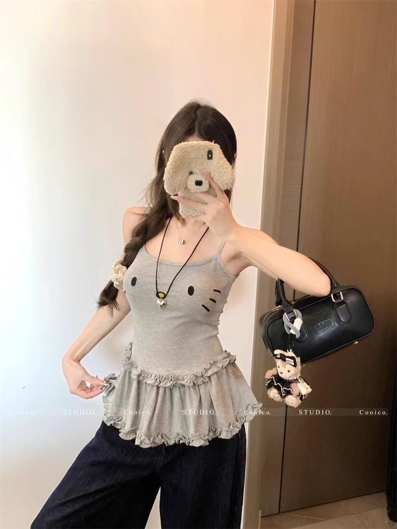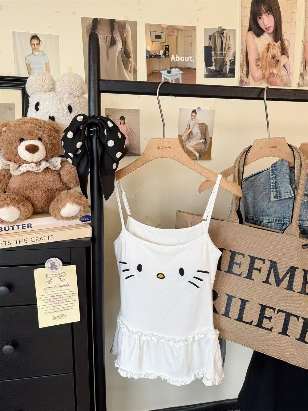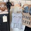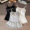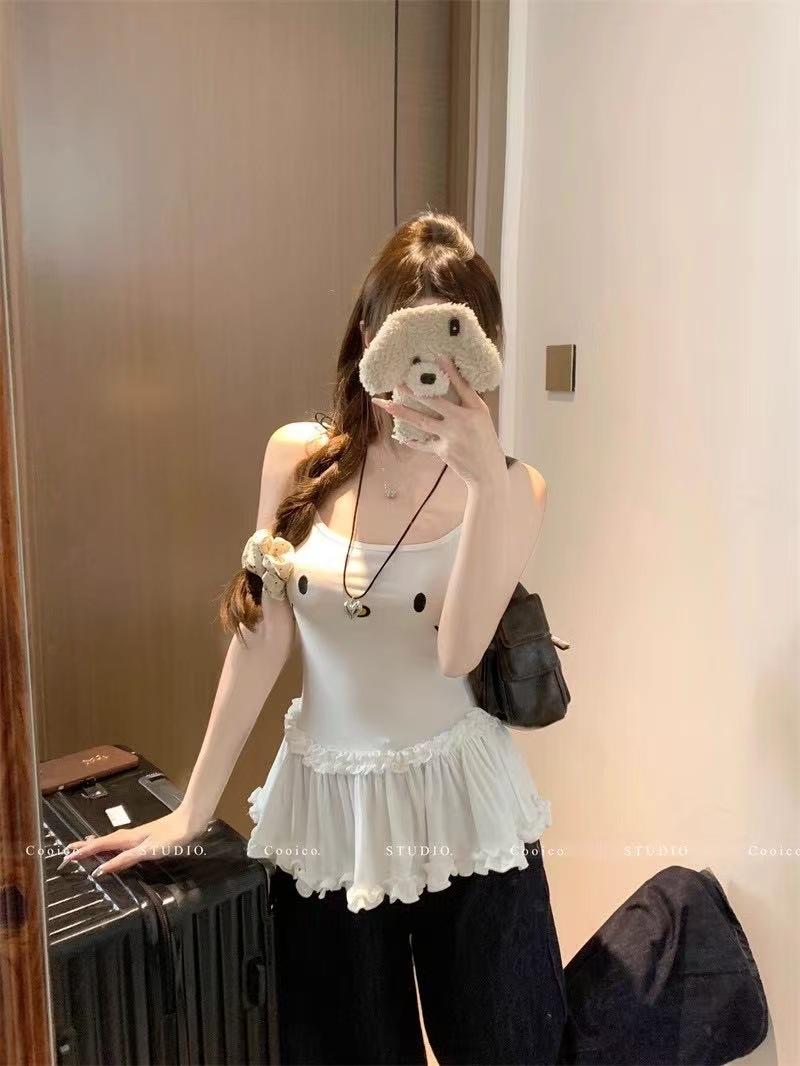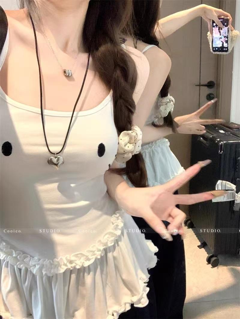 Lindo Top Cami Bordado de Gatito para Mujer Verano Volante Ajustado Ropa Interior Sentido del Diseño Sin Mangas Ropa Exterior Top Marea