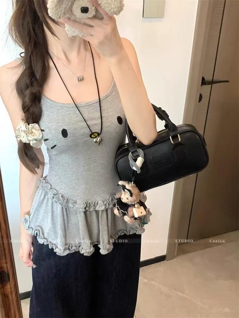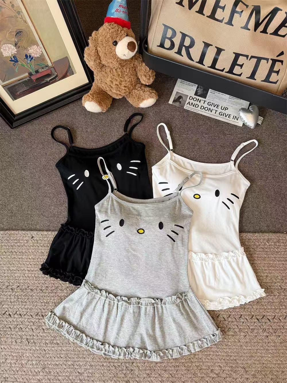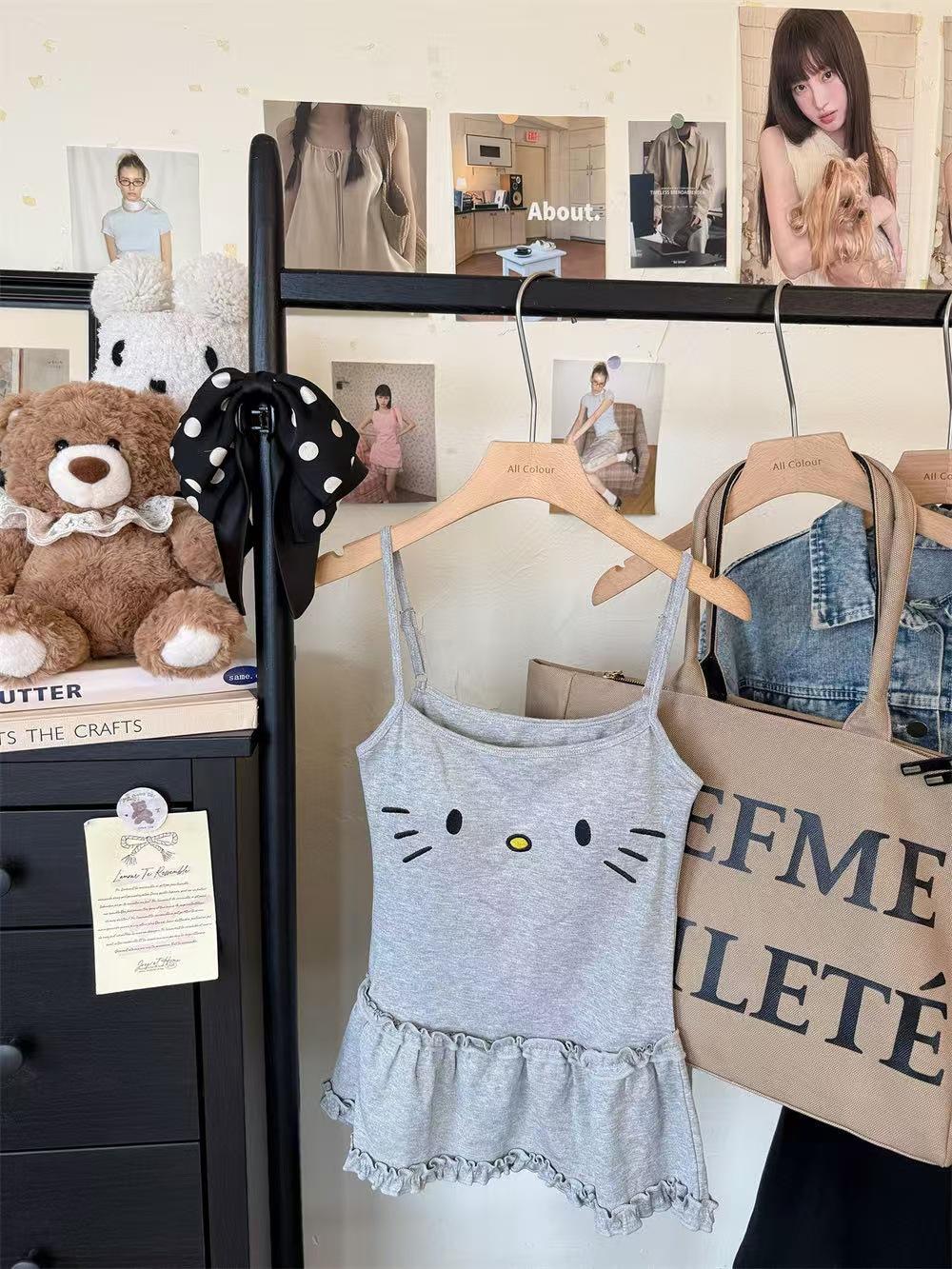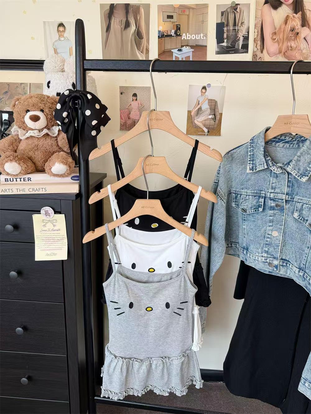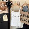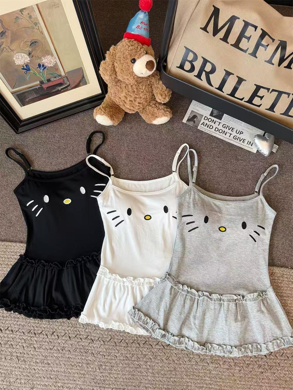 Lindo Top Cami Bordado de Gatito para Mujer Verano Volante Ajustado Ropa Interior Sentido del Diseño Sin Mangas Ropa Exterior Top Marea