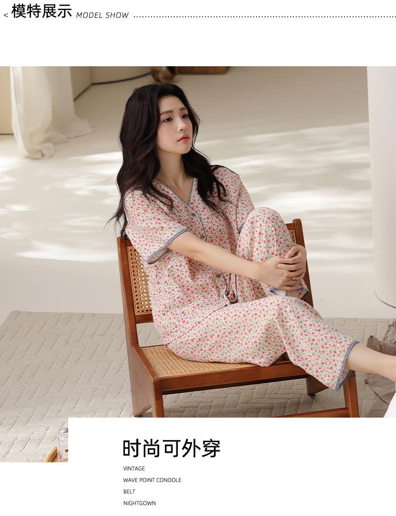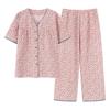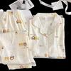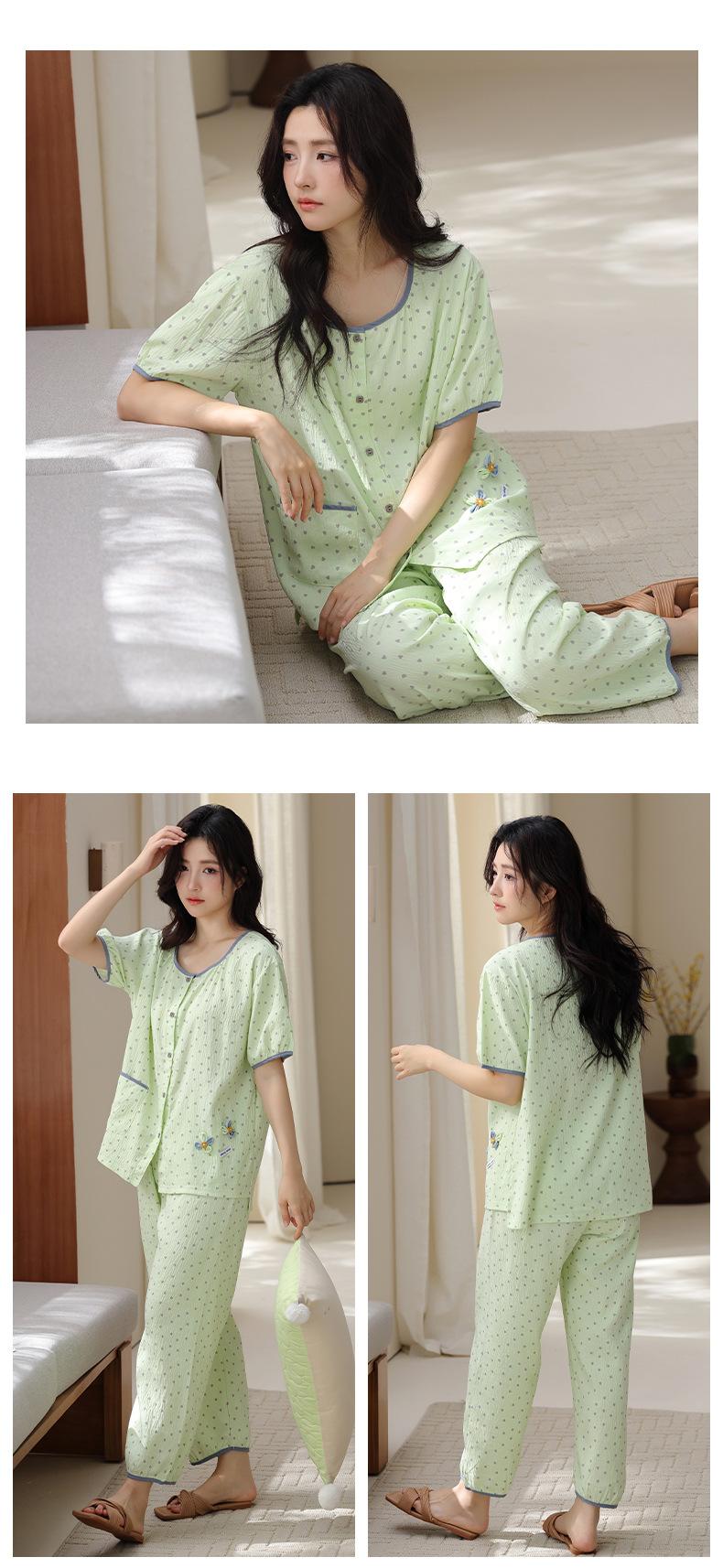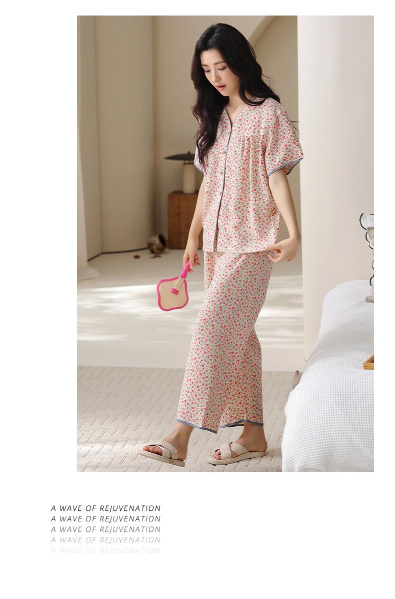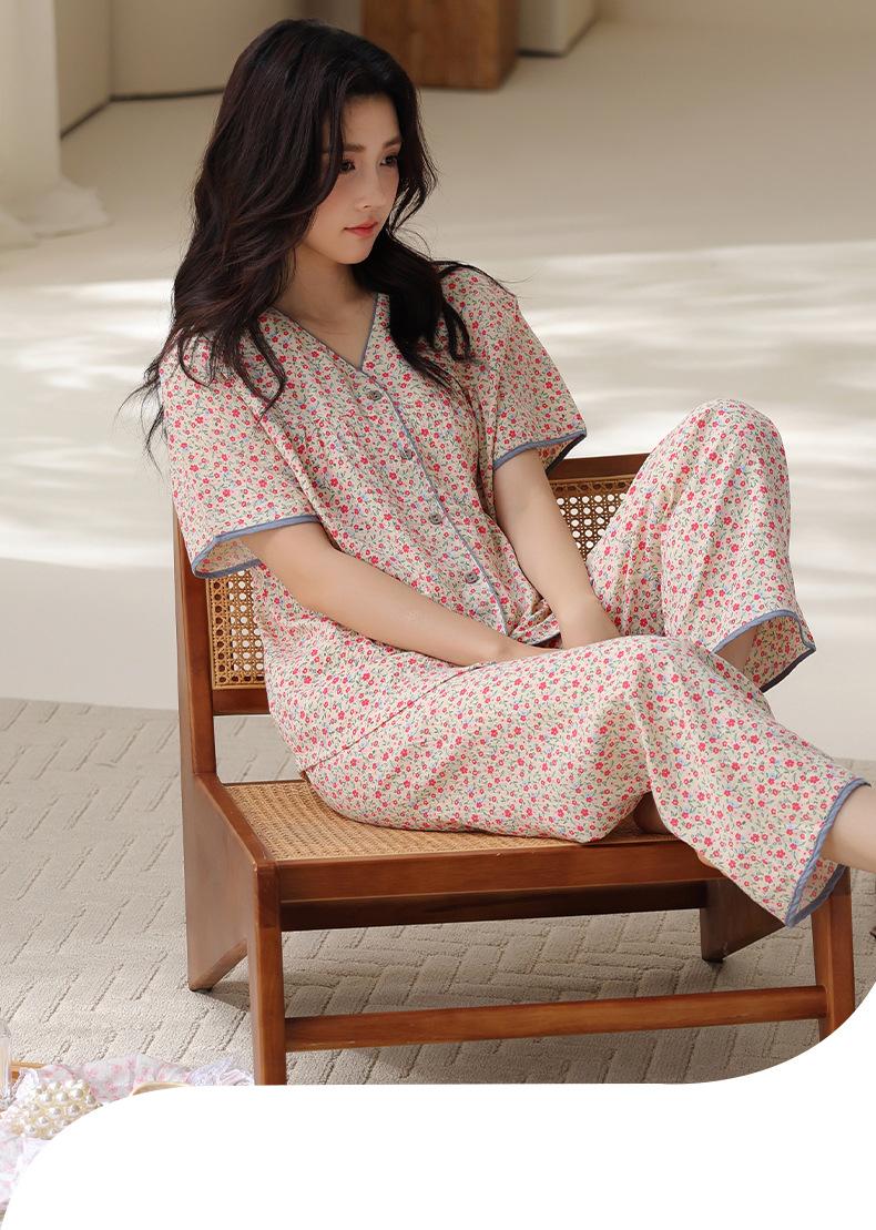 Verano Nuevo Algodón Nube Manga Corta Pijama de Mujer Pantalón Largo Cárdigan Suelto Fresco Cómodo Estampado Conjunto de Ropa de Hogar