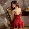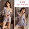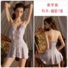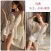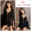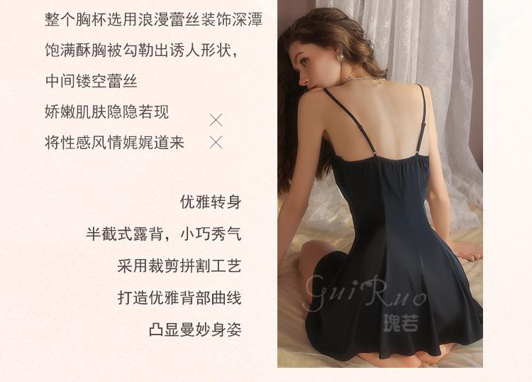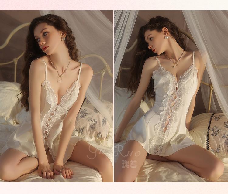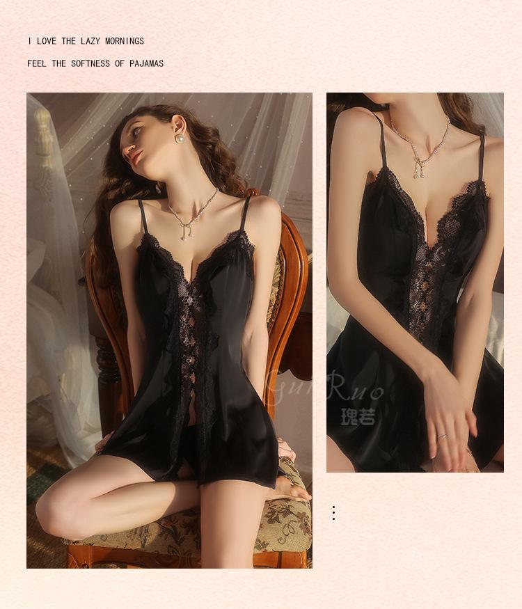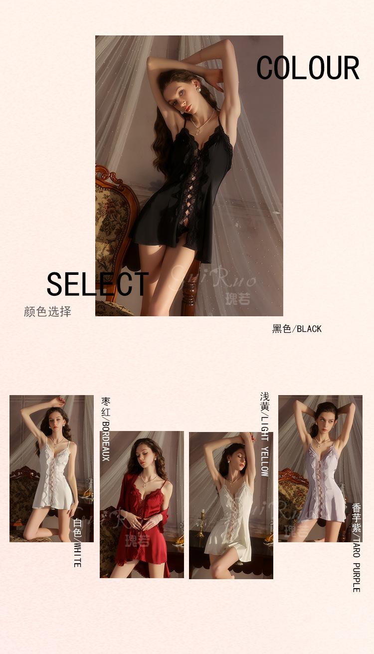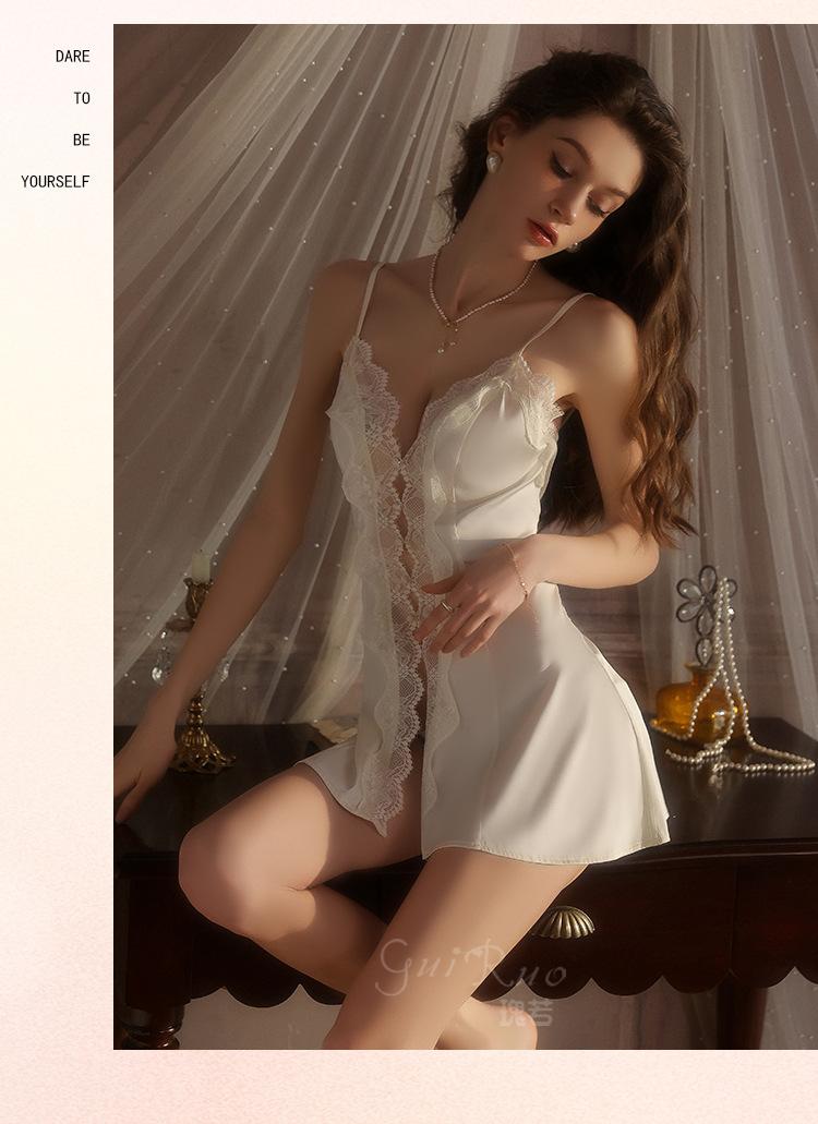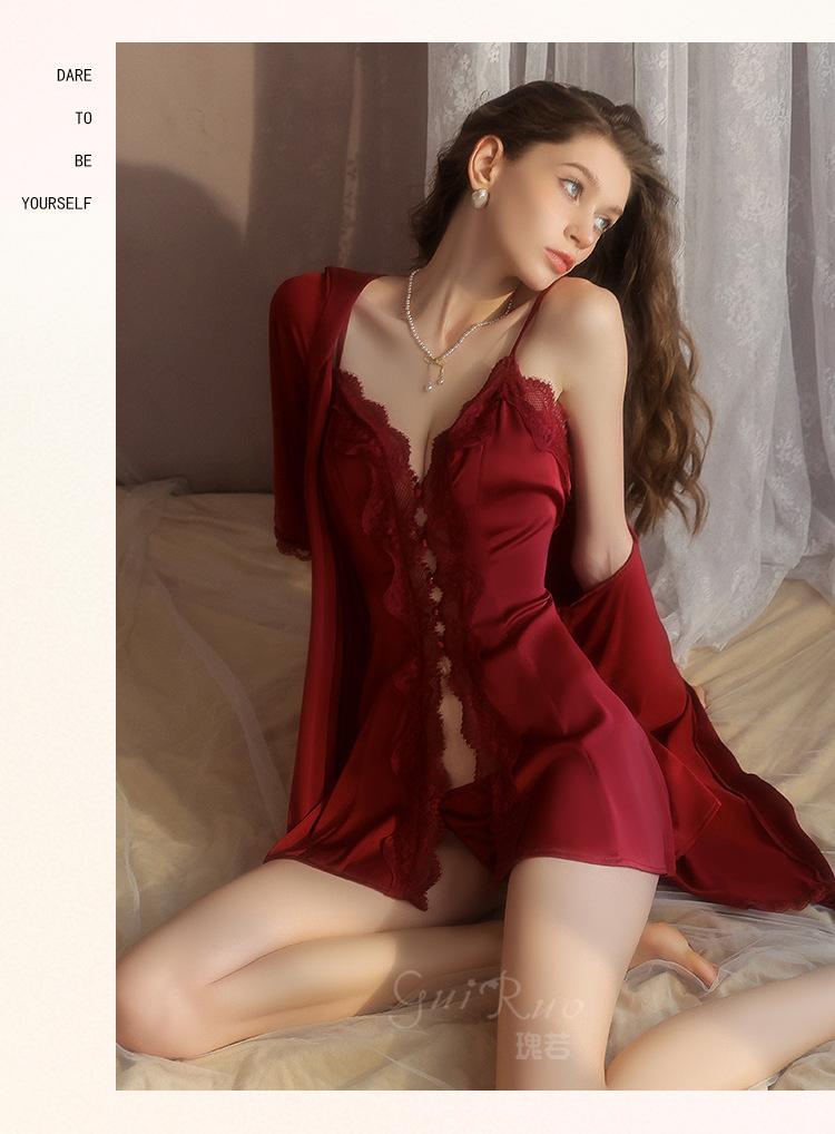 Ropa Interior Guiruo Tentación Apasionada Satén Suave Encaje Deseo Puro Escote en V Profundo Bata Exterior Camisón de Corte Bajo Set para el Hogar 5219