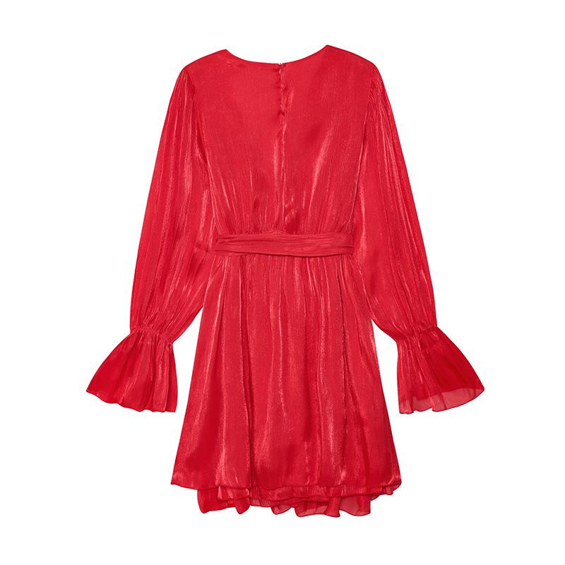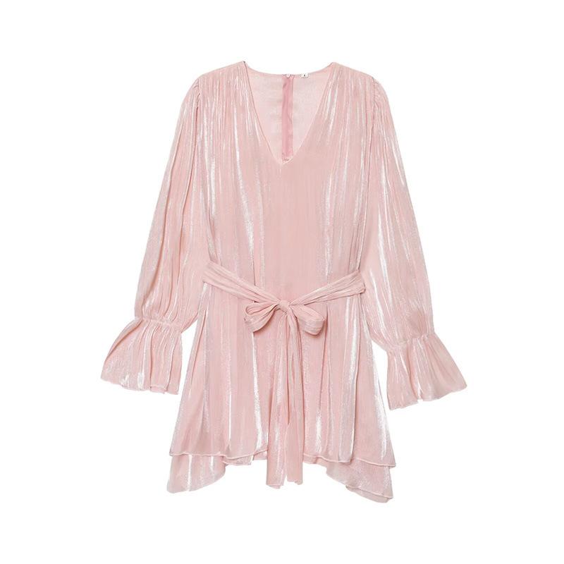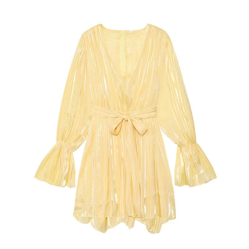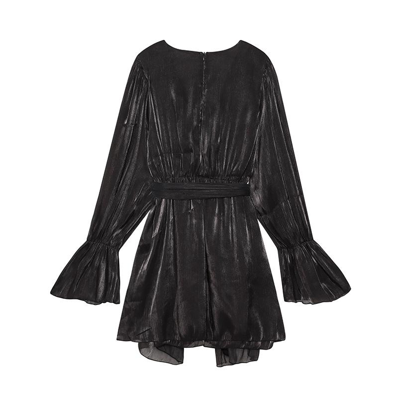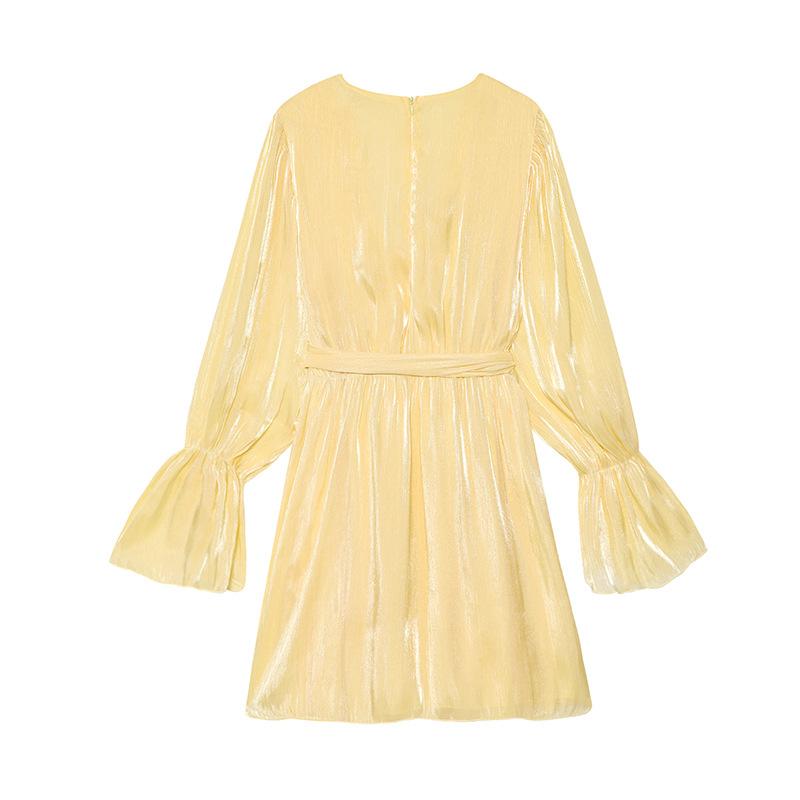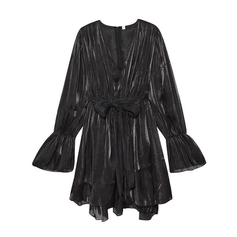 Vestido nuevo de otoño para mujer con cuello en V, hilo brillante, manga acampanada, lazo para atar, nuevo de personalidad transfronterizo estilo europeo y americano
