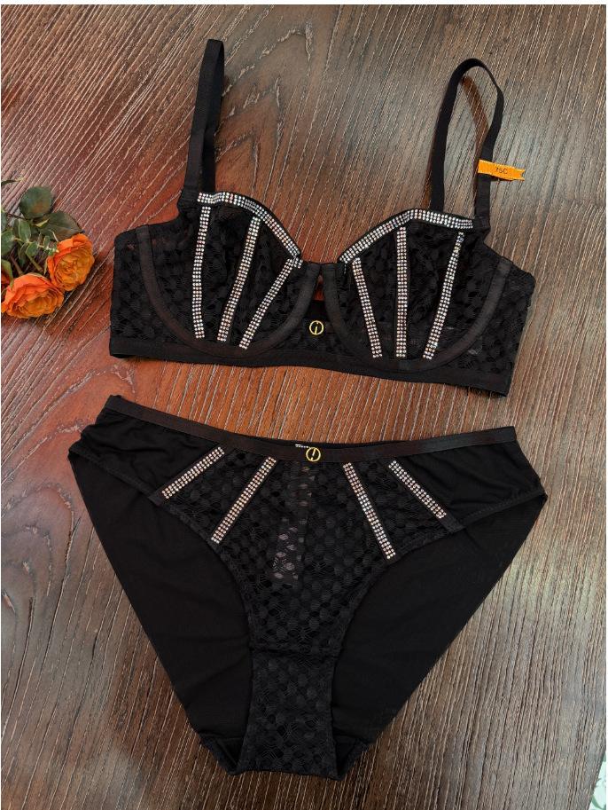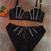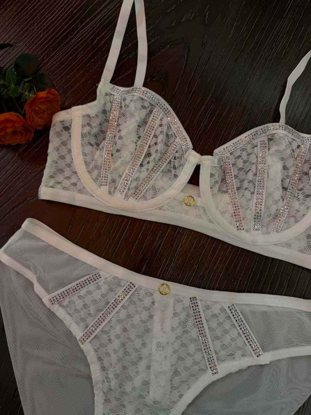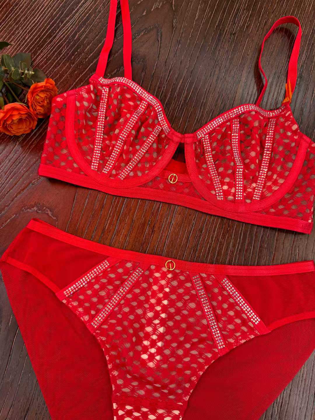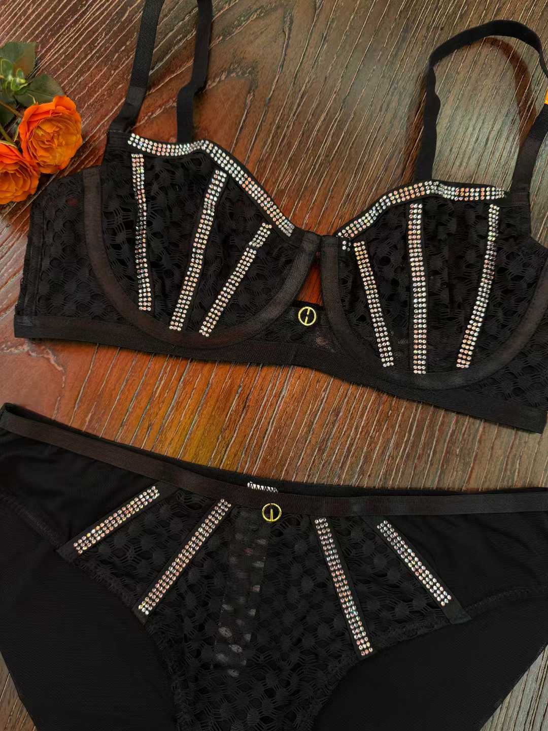 Sexy ultrafino transfronterizo pecho grande encaje pequeño ropa interior para mujer soporte de aro de acero flacidez color de contraste pedrería conjunto de sujetador