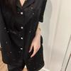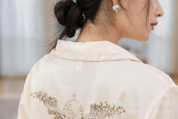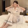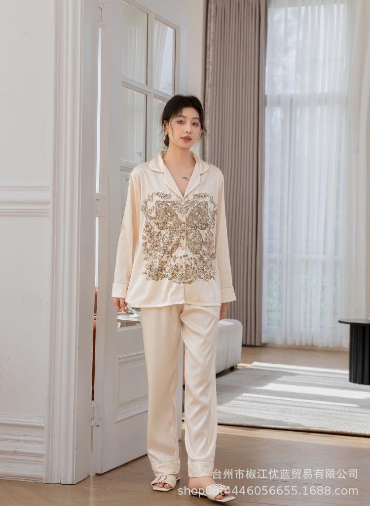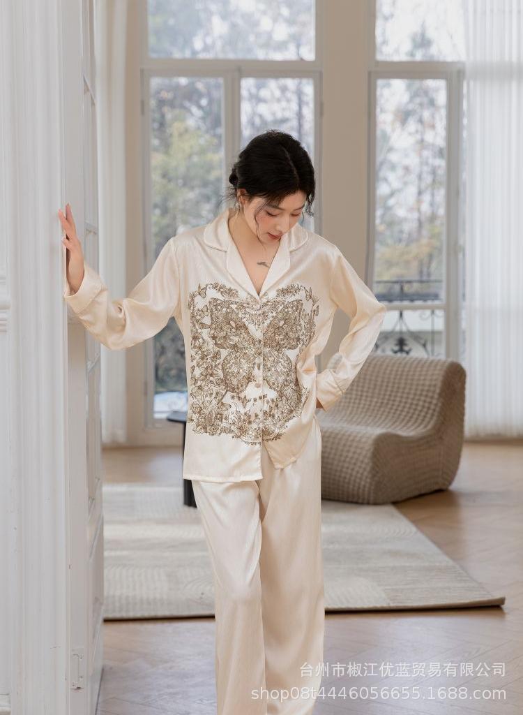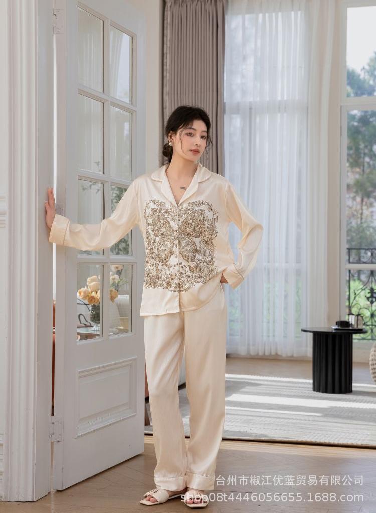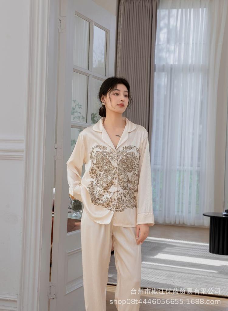 Conjunto de pijama para mujer de seda de hielo de alta gama de lujo ligero de gran venta patrón estampado de mariposas doradas conjunto de ropa para el hogar