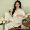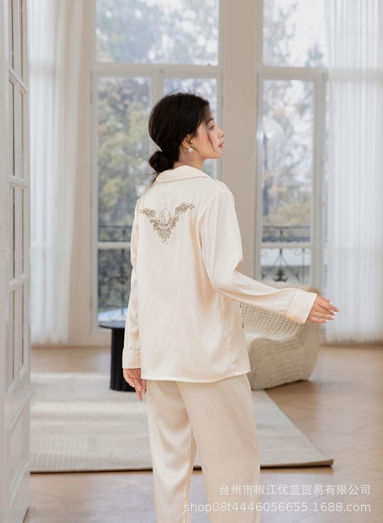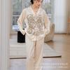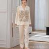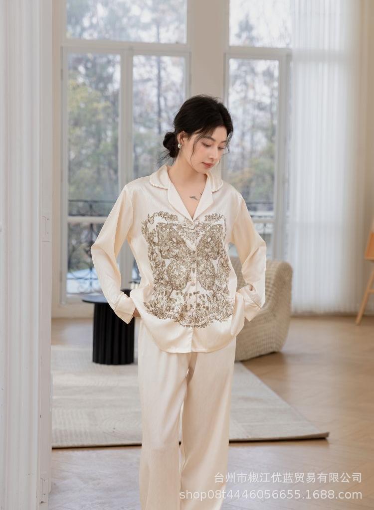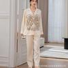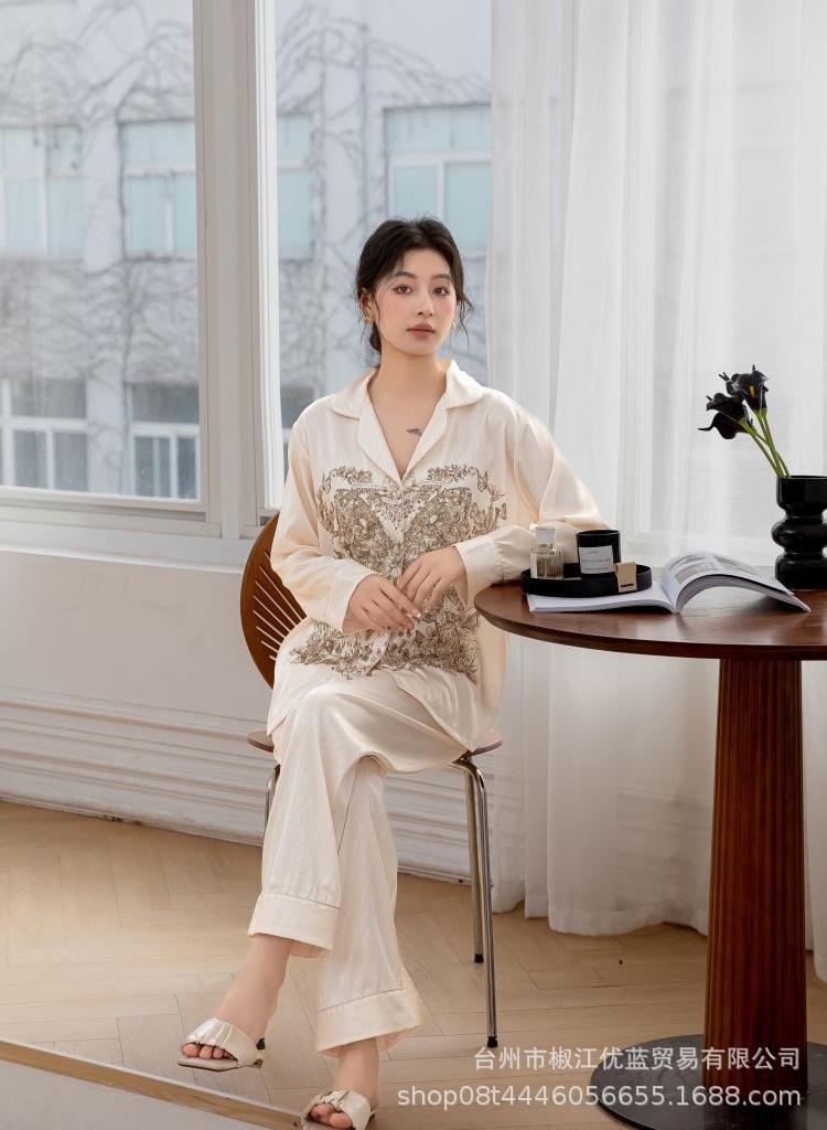Pijama de Seda de Hielo para Mujer Primavera y Otoño Nuevo Set de Manga Larga con Borde de Hoja de Loto Temperamento de Lujo Ligero Sensación de Alta Gama Set de Ropa para el Hogar
