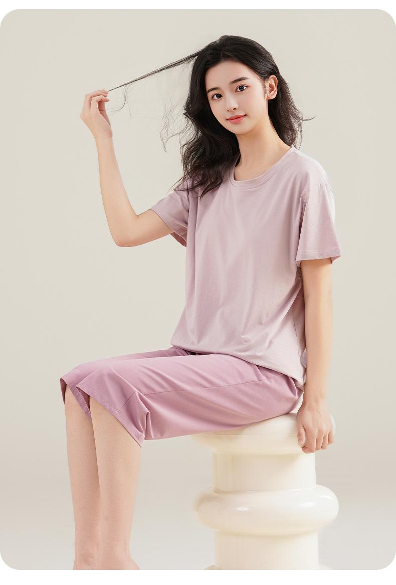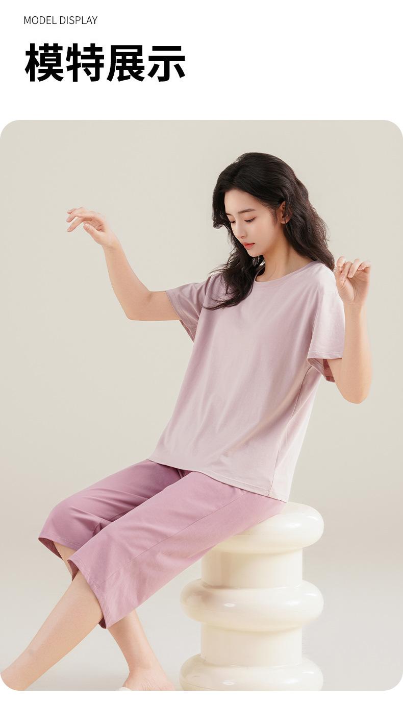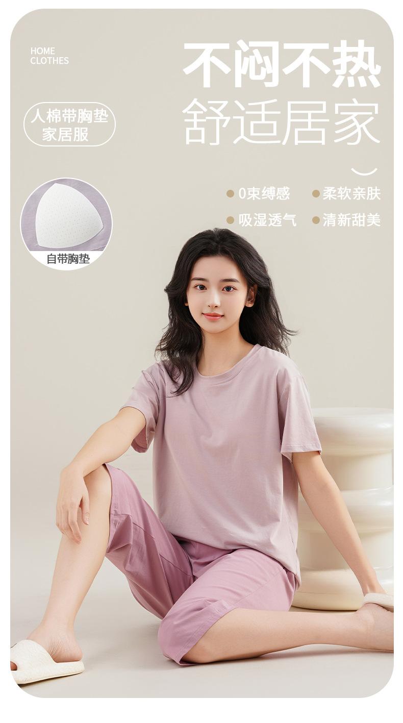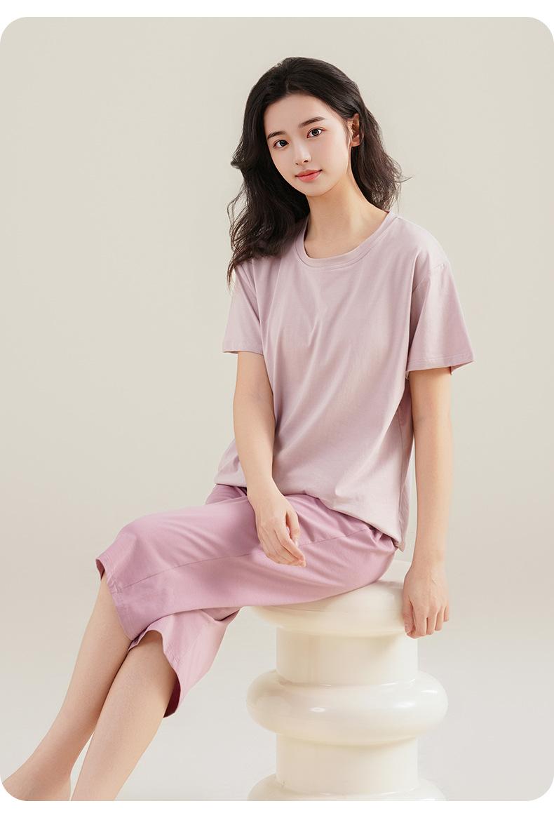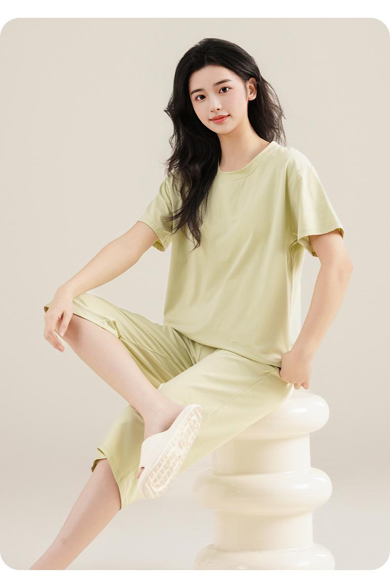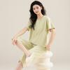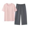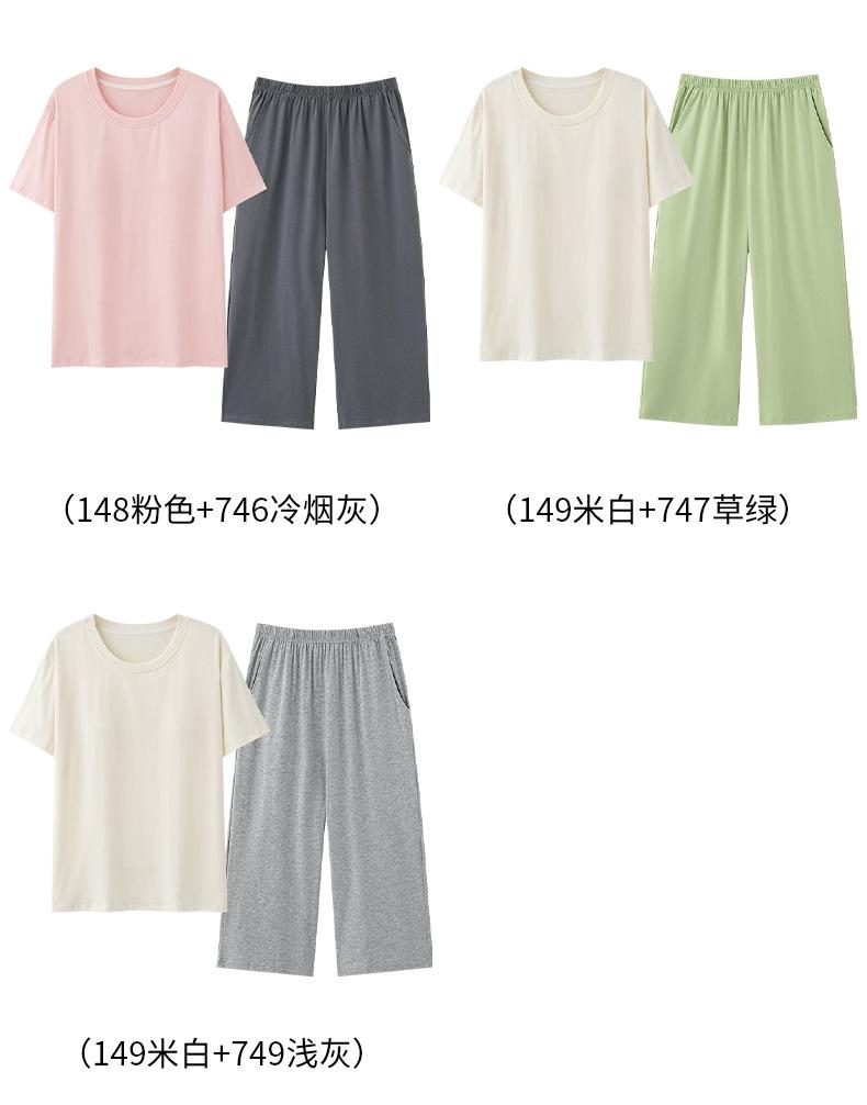 Pijama de Verano para Mujer, Fresco Modal de Manga Corta y Pantalón Capri, Cuello Redondo Holgado, Ropa de Casa Sencilla con Set de Almohadilla para el Pecho
