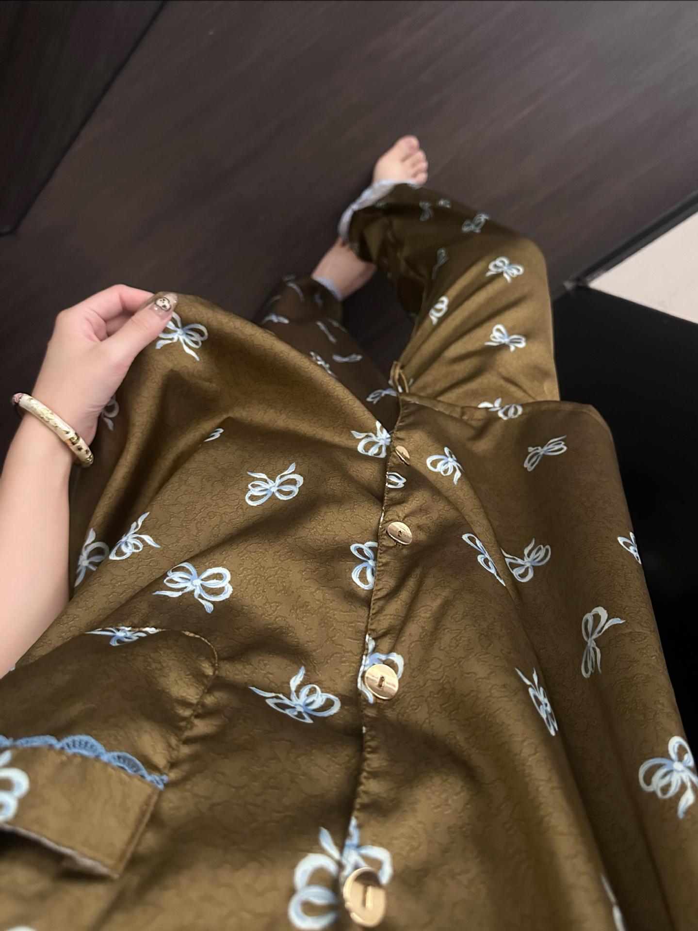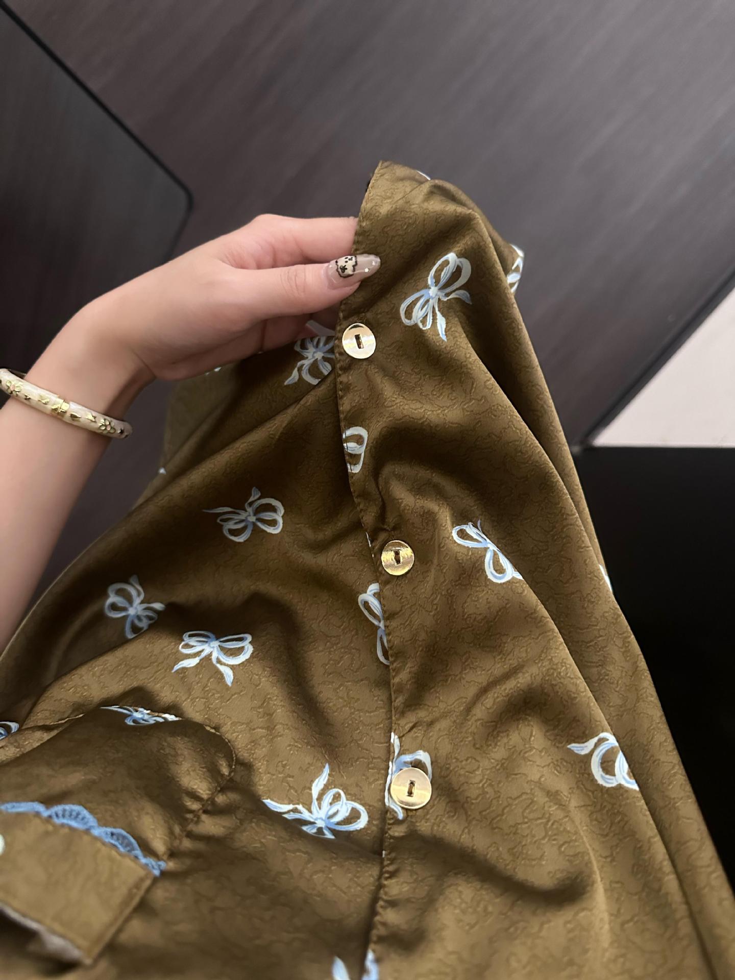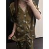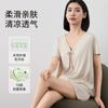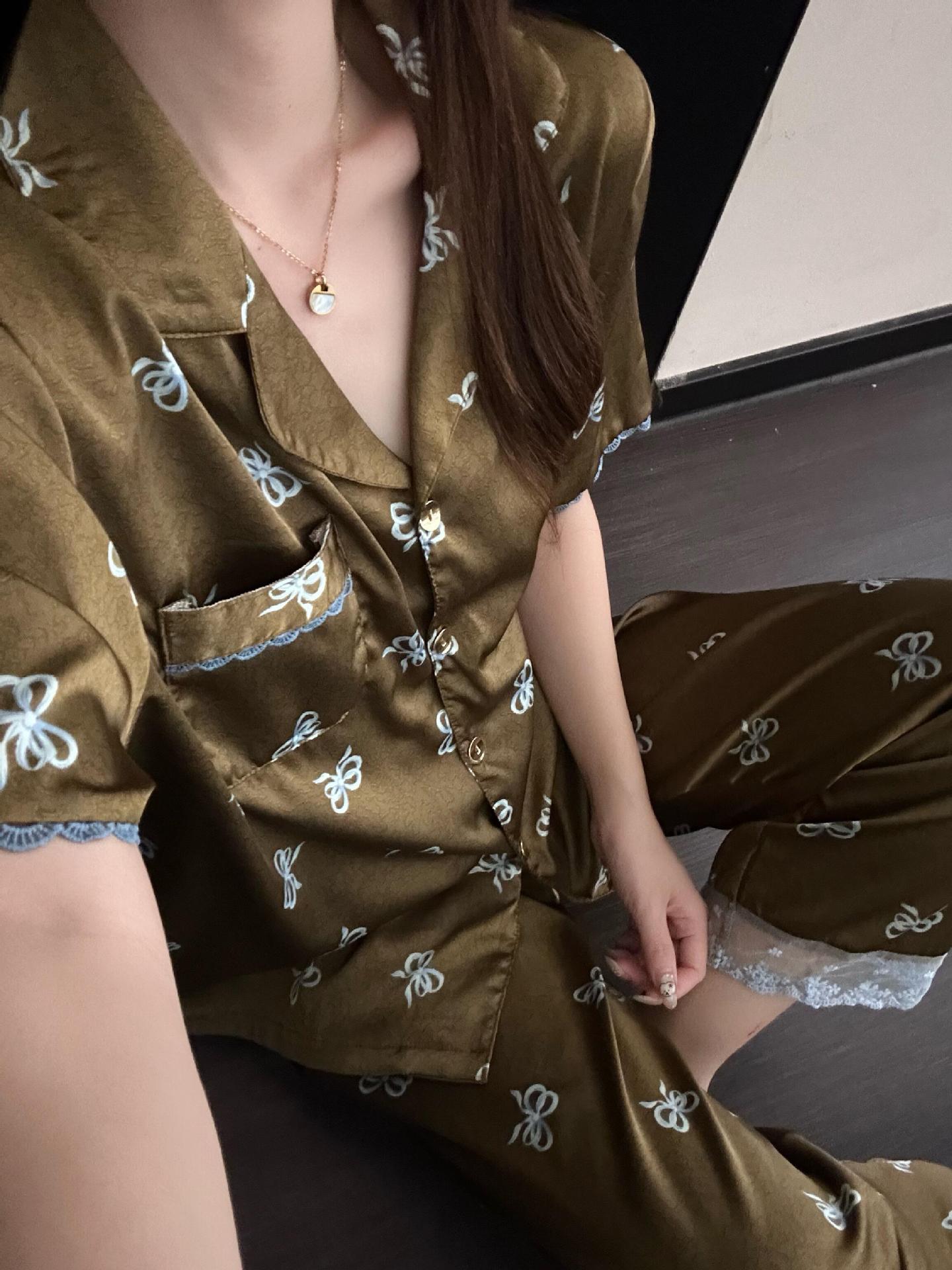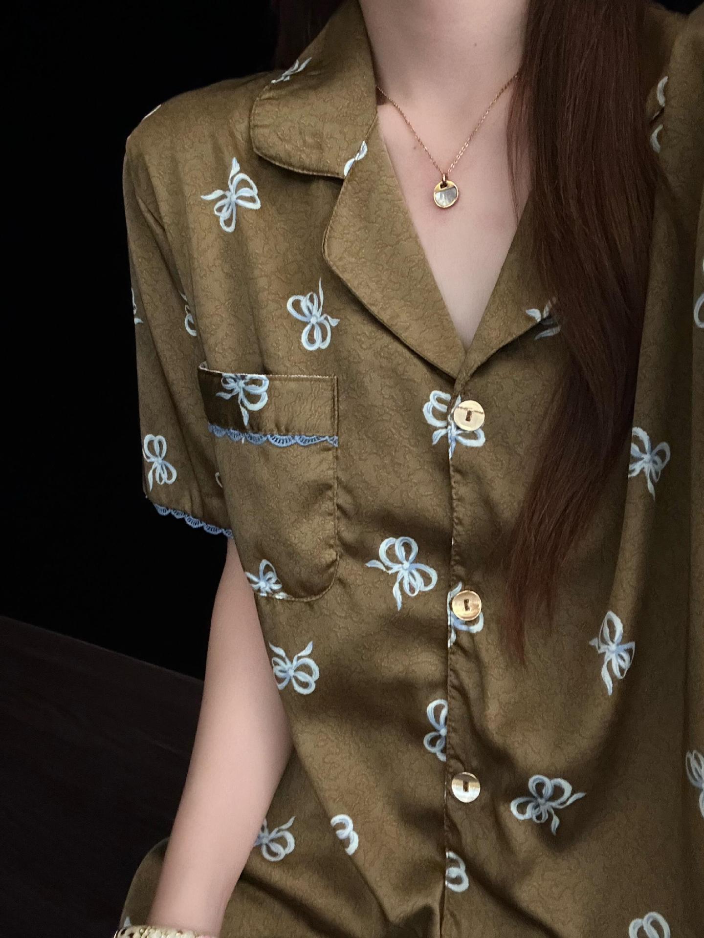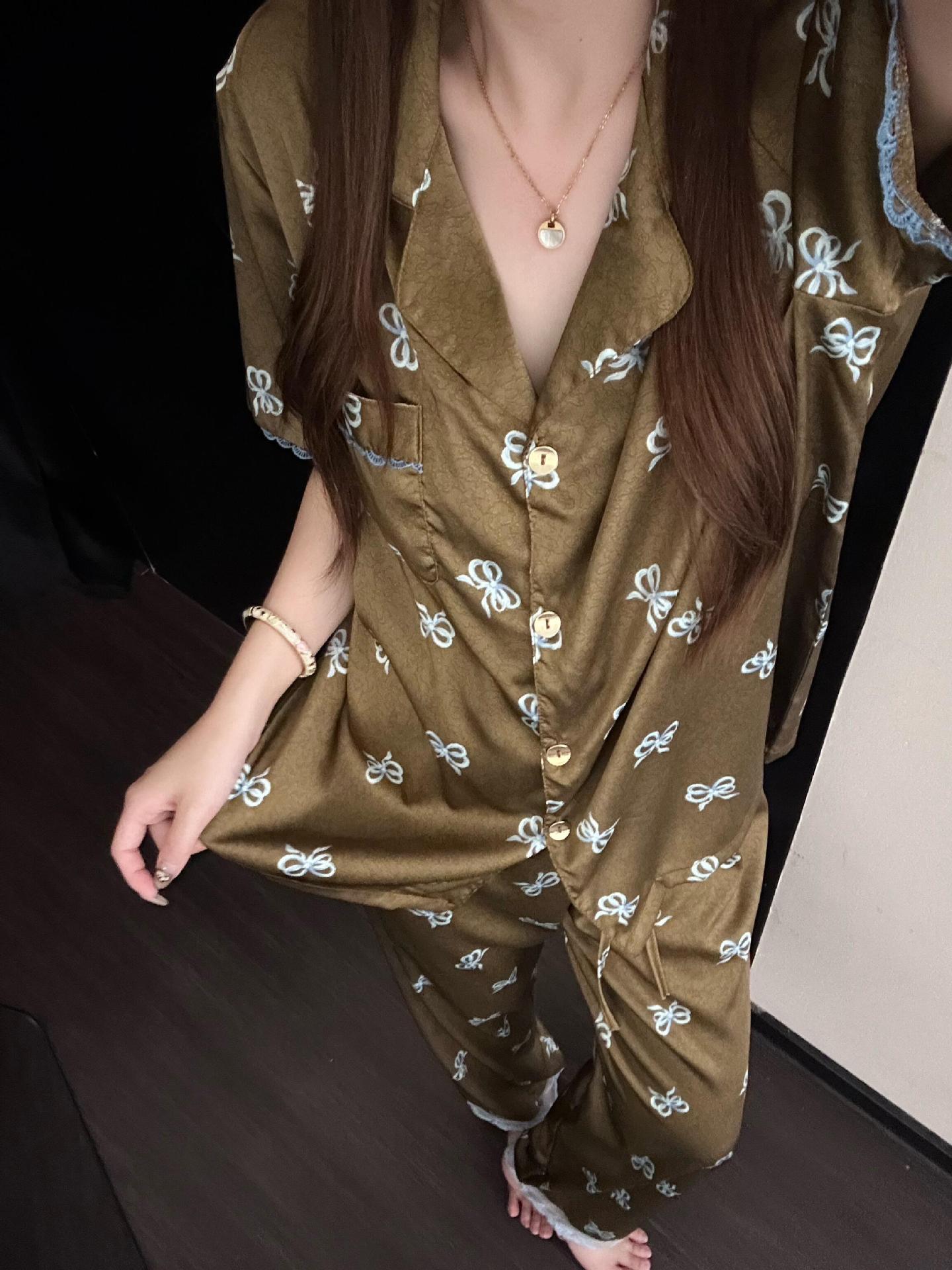 Pijama de manga corta de seda de hielo con estampado de lazo francés para mujer, verano, sensación de lujo ligero, agradable para la piel, conjunto para estar en casa que se puede usar fuera