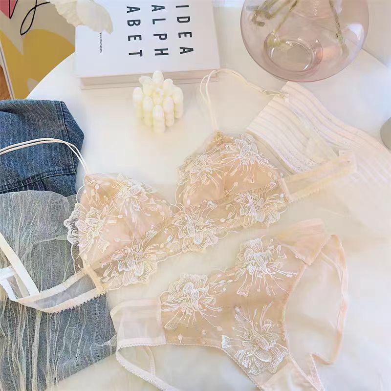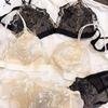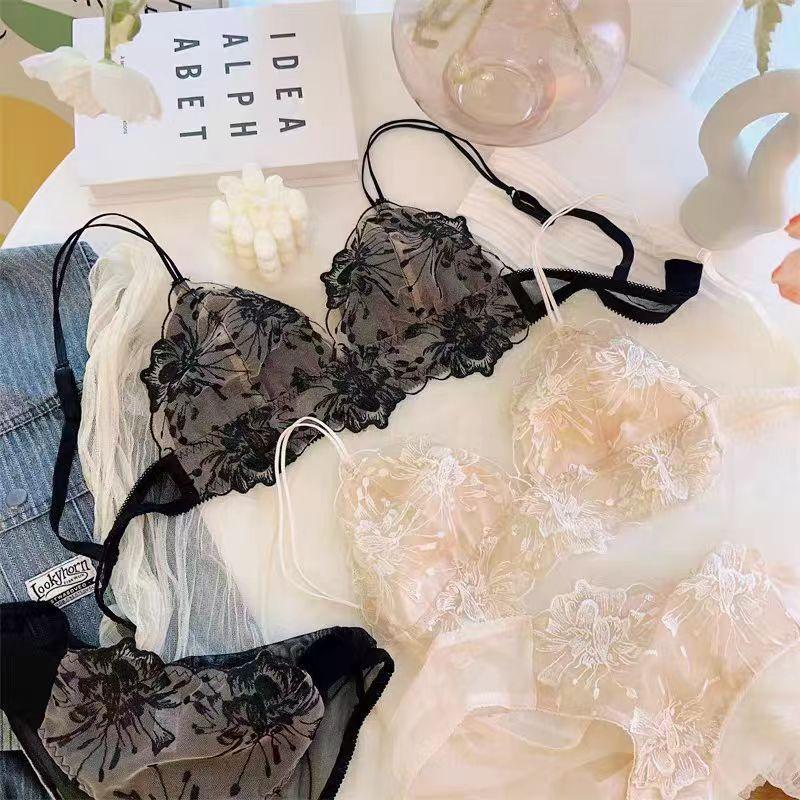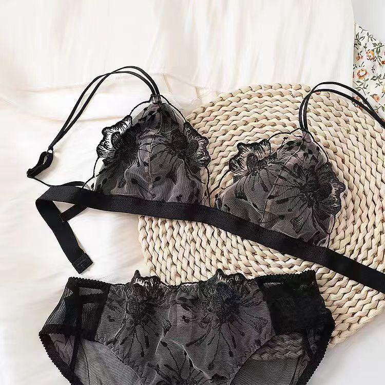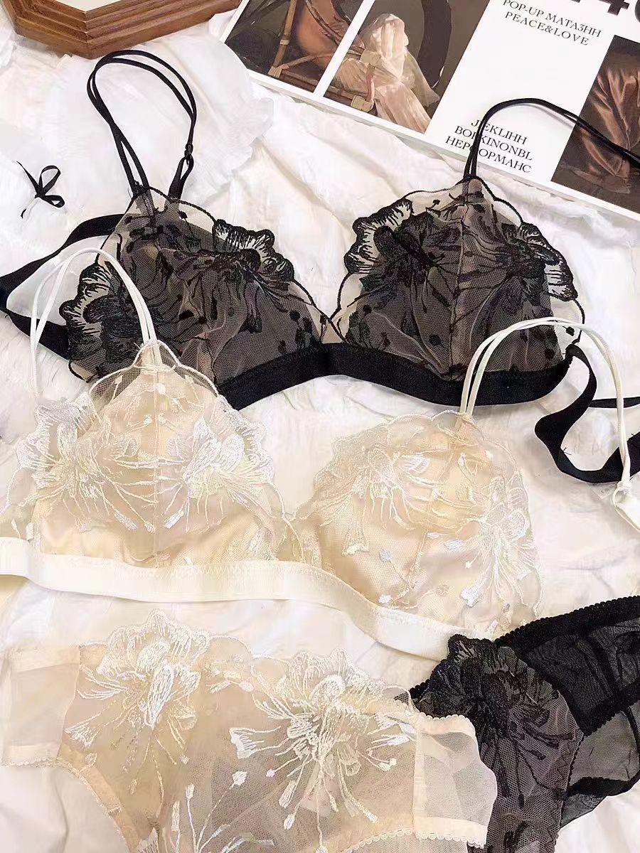 Encaje de Bordado Francés Sexy Copa Triángulo Sin Aro de Acero Pecho Grande Pequeño Ultradelgado Transpirable Traje de Ropa Interior