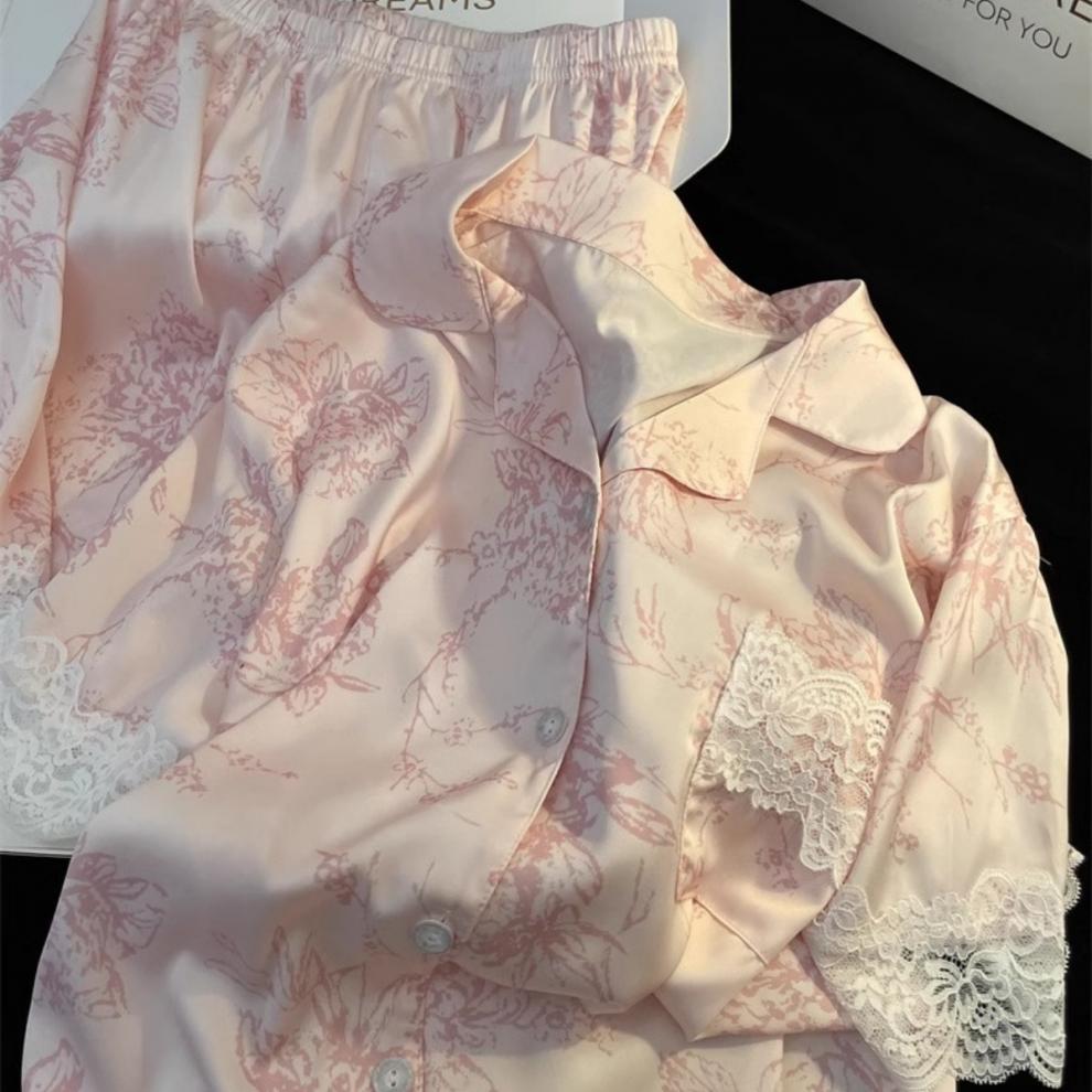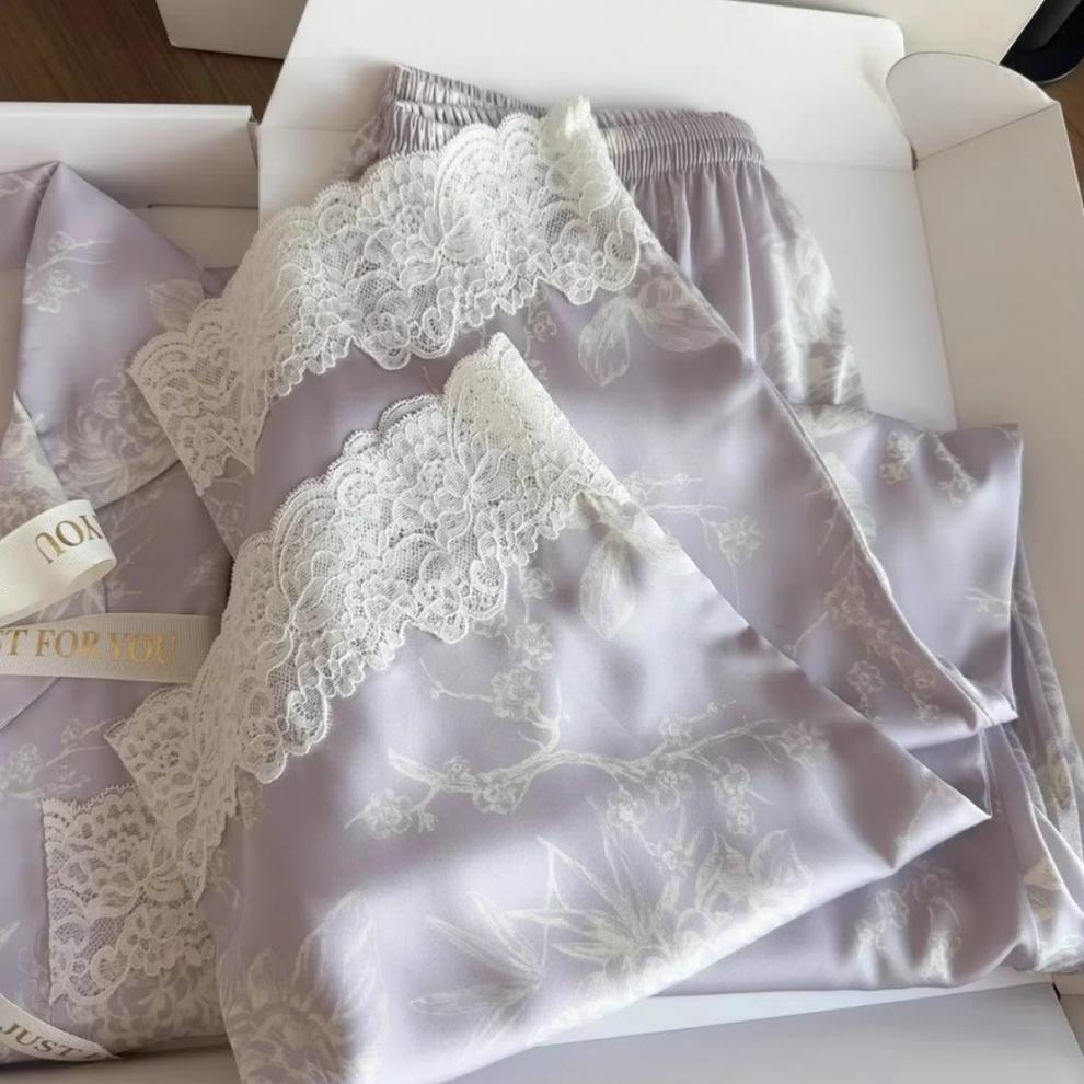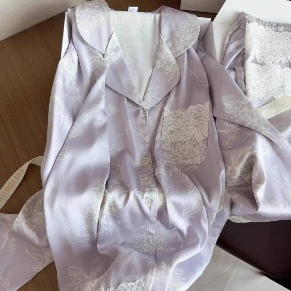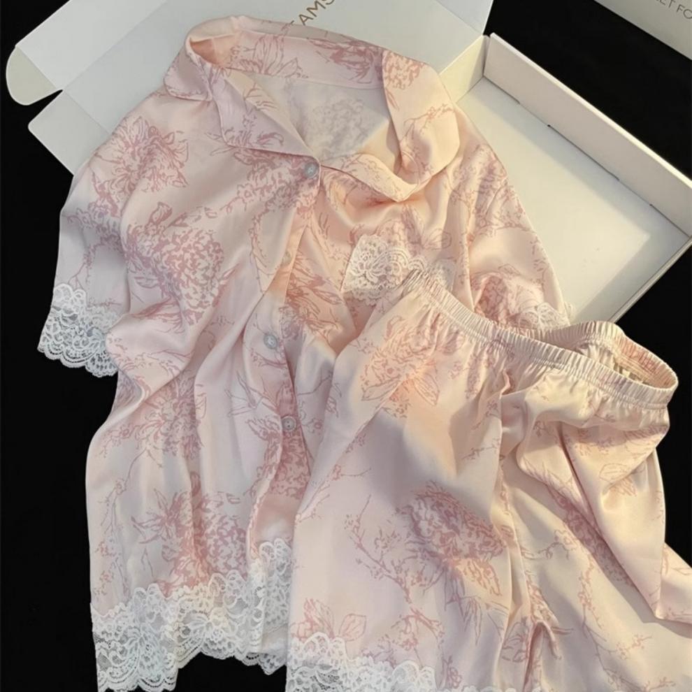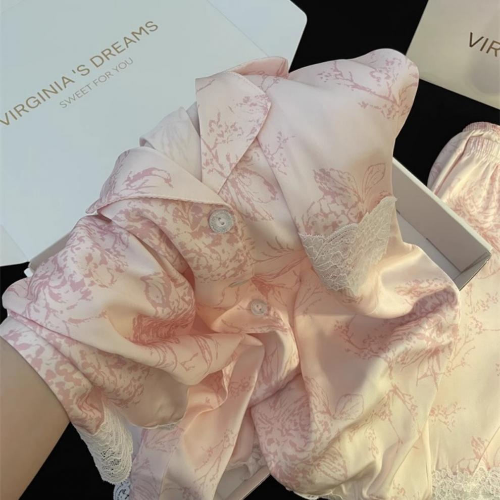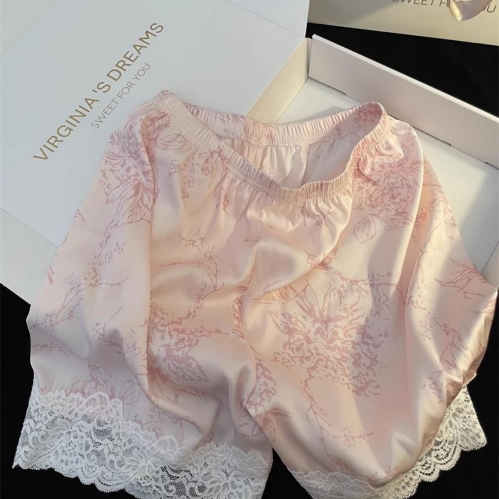 Encaje Seda de Hielo Manga Corta Shorts Pantalones Conjunto de Tres Piezas Pijama de Lujo Fresco para Mujer Ropa de Casa de Seda de Hielo para Mujer