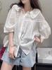 Verano Nuevo Estilo Japonés Color Sólido Cruzado Dulce Reductor de Edad Manga Cinco Puntos Camisa Cuello Muñeca Talla Grande para Mujer Encaje Suelto