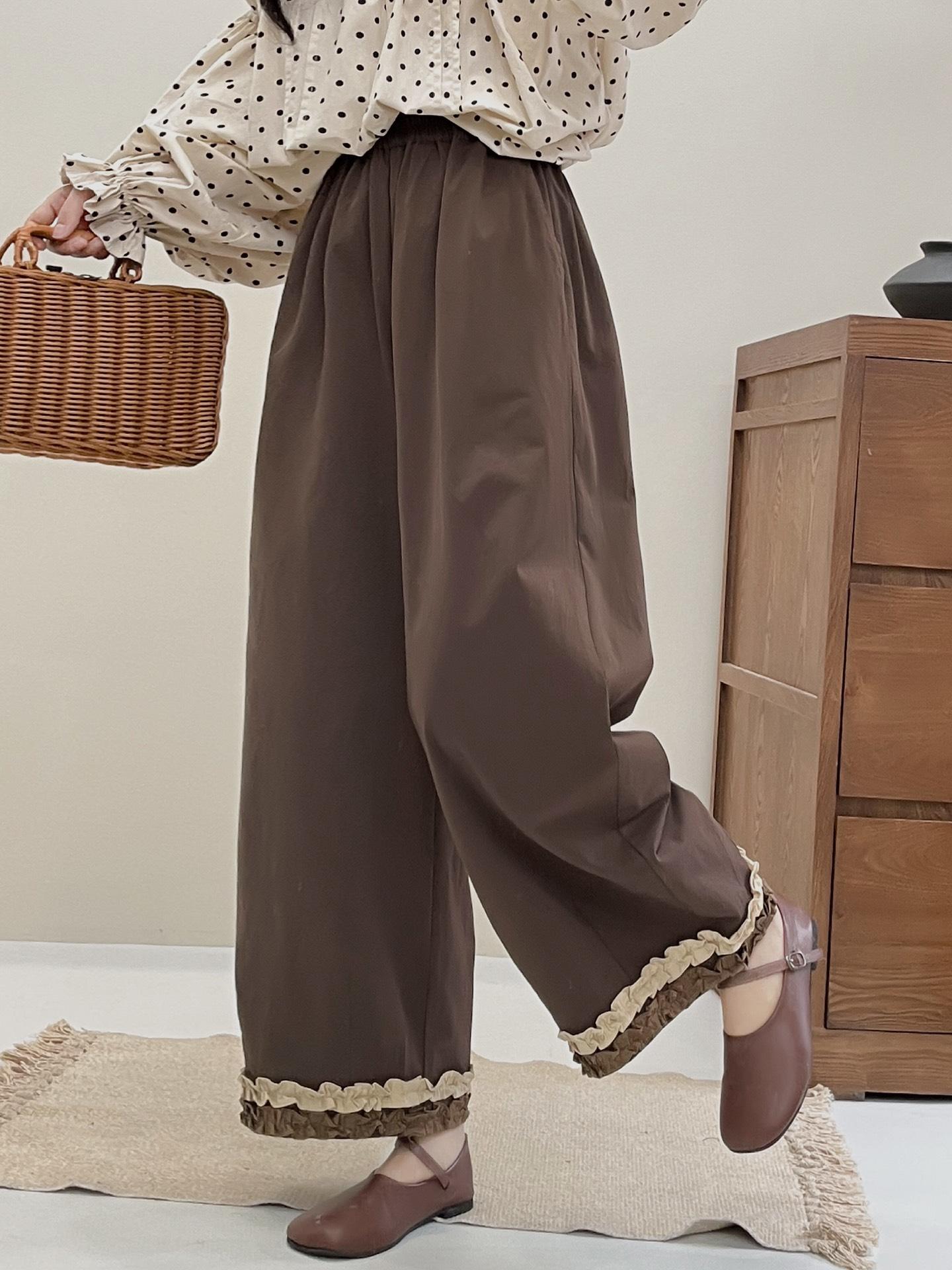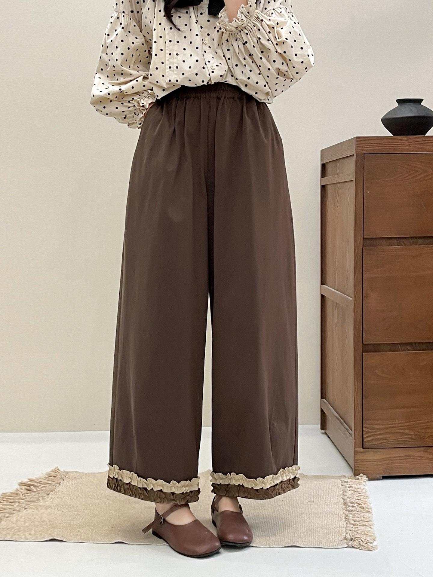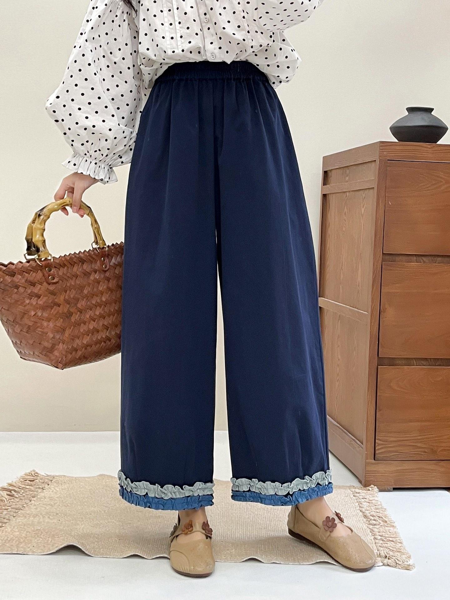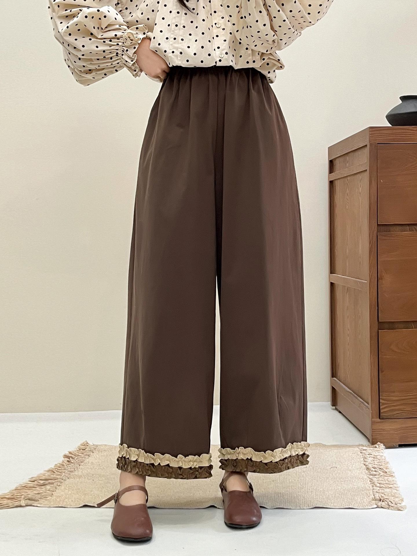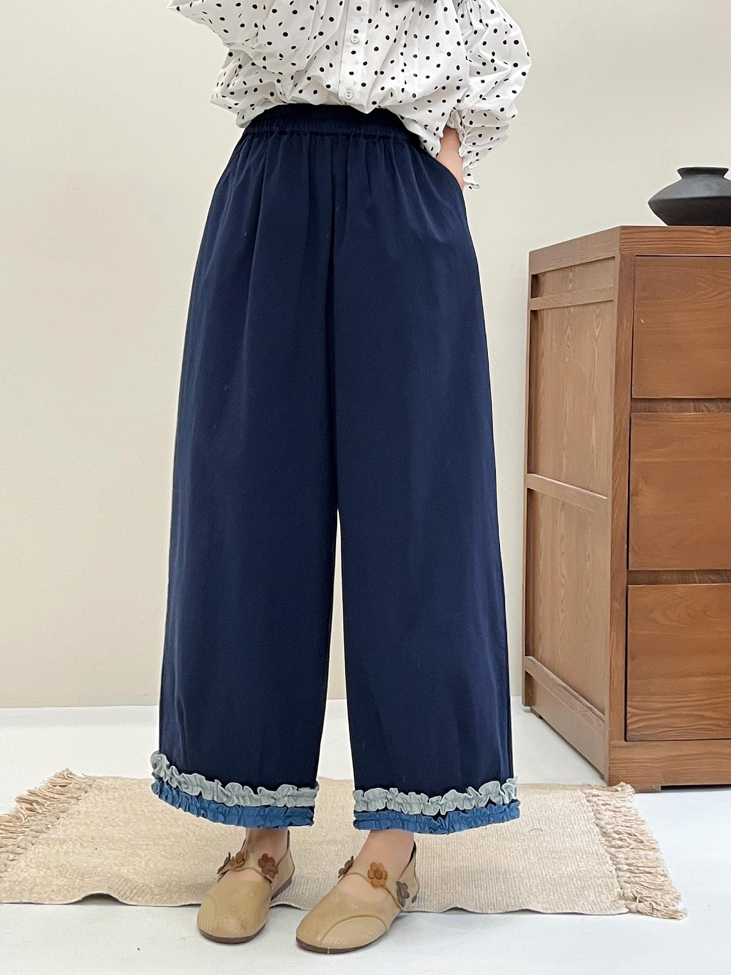 Pantalones de Moda Cortos de Pierna Ancha Estilo Bosque con Dulces Volantes y Empalmes Sueltos Versátiles Casuales de Algodón Rectos de Cintura Alta para Mujer