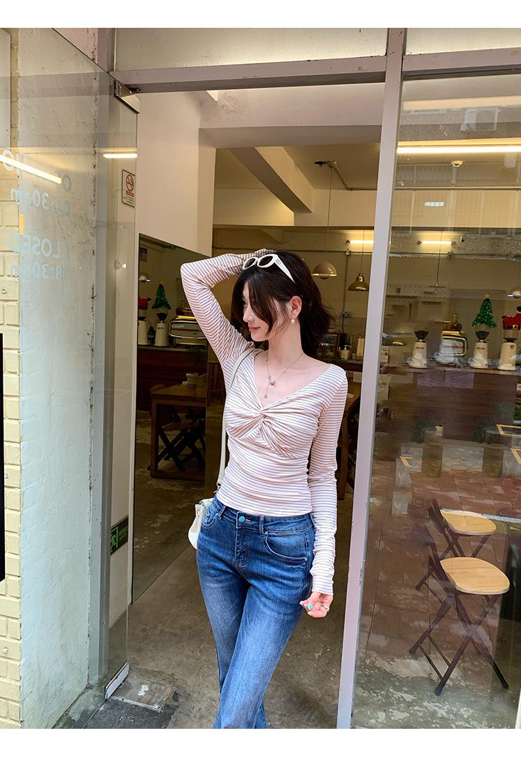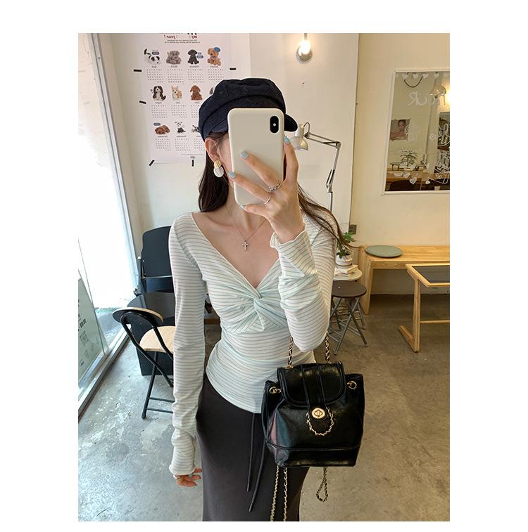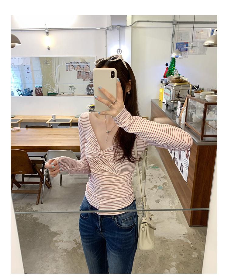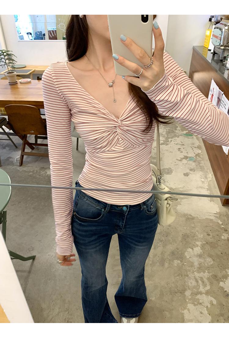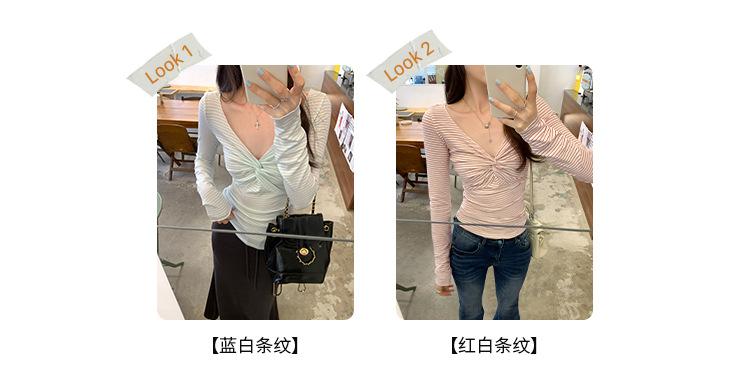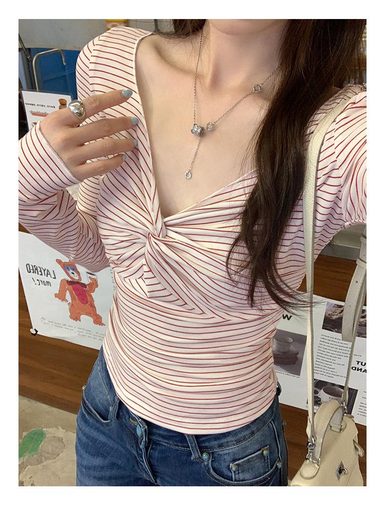 Camiseta de manga larga con cuello en V y nudo a rayas rojas y blancas para mujer, estilo coreano americano, otoño 2025, top corto sexy para chica