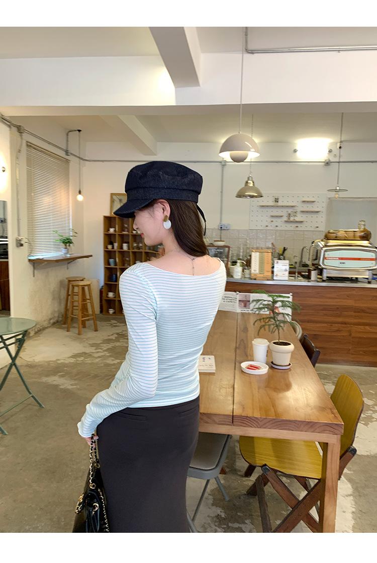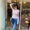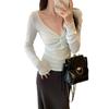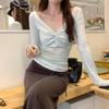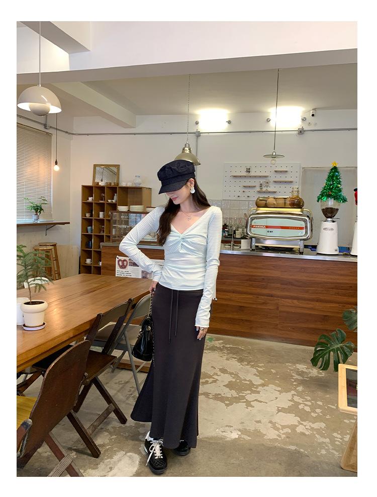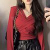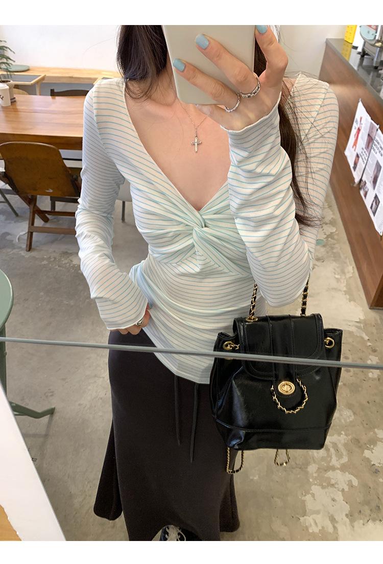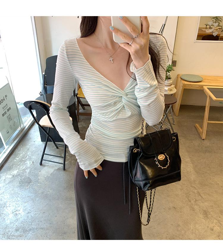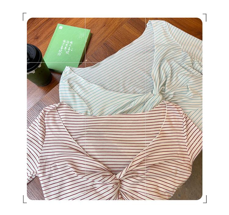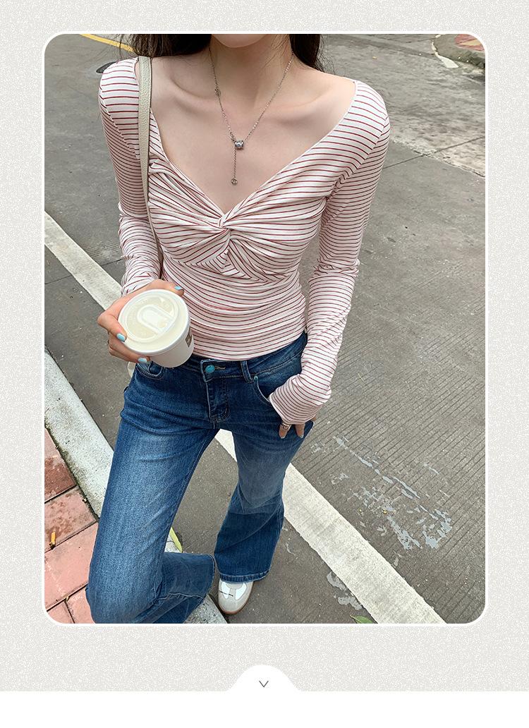 Camiseta de manga larga con cuello en V y nudo a rayas rojas y blancas para mujer, estilo coreano americano, otoño 2025, top corto sexy para chica