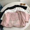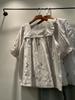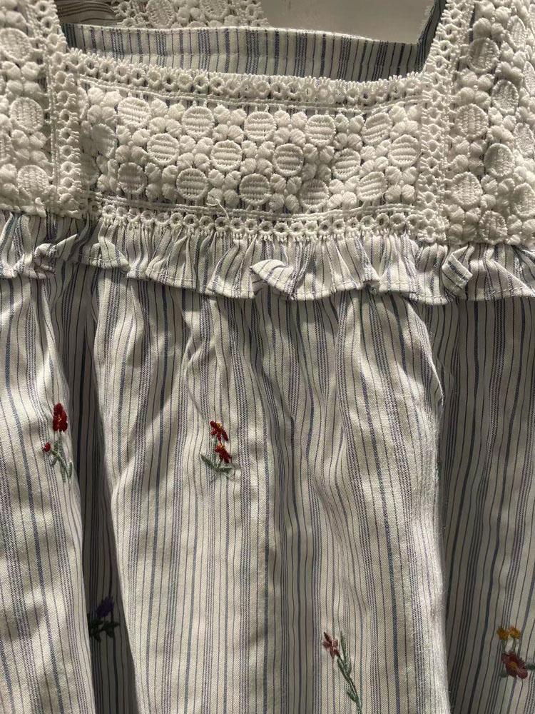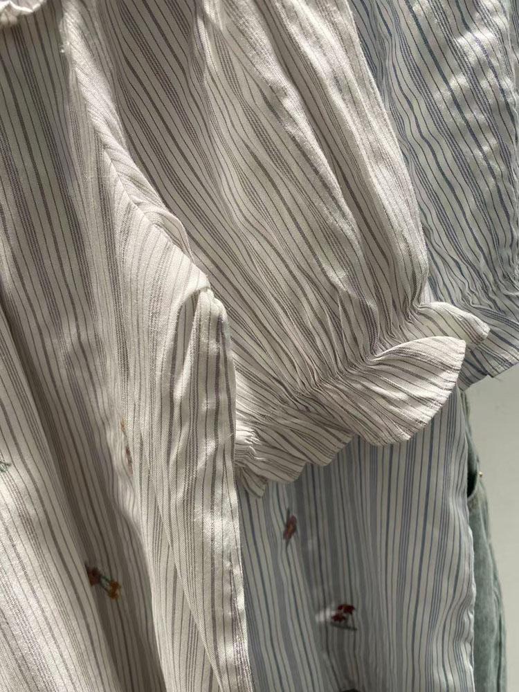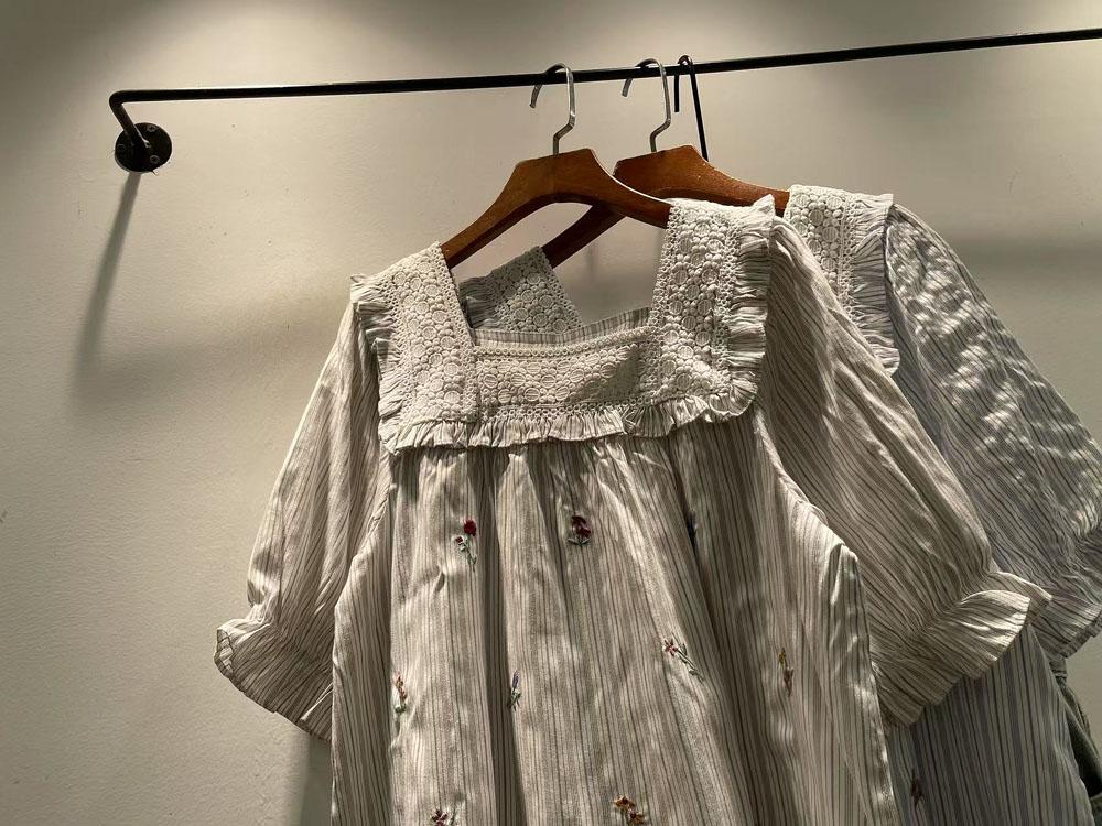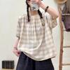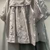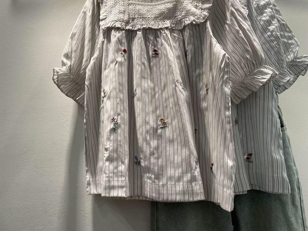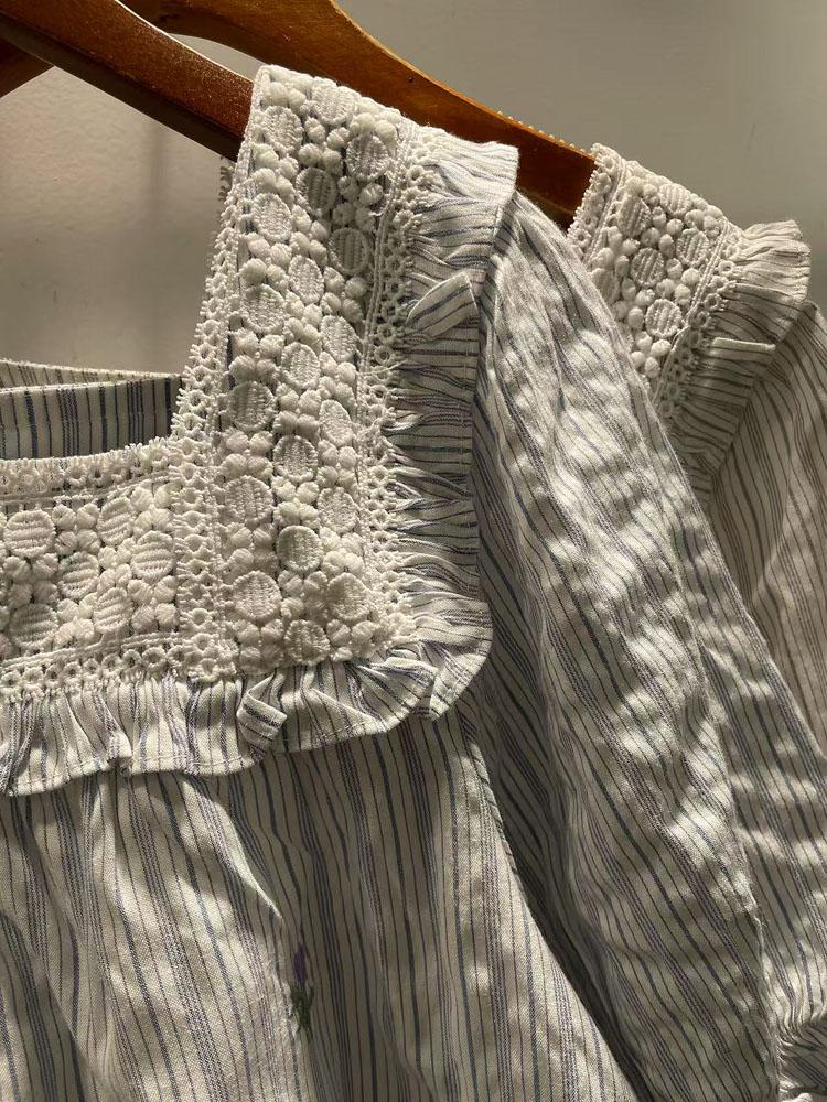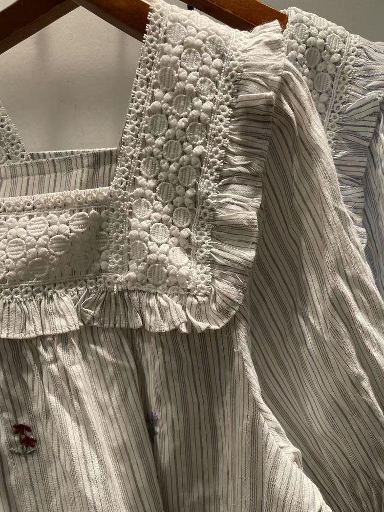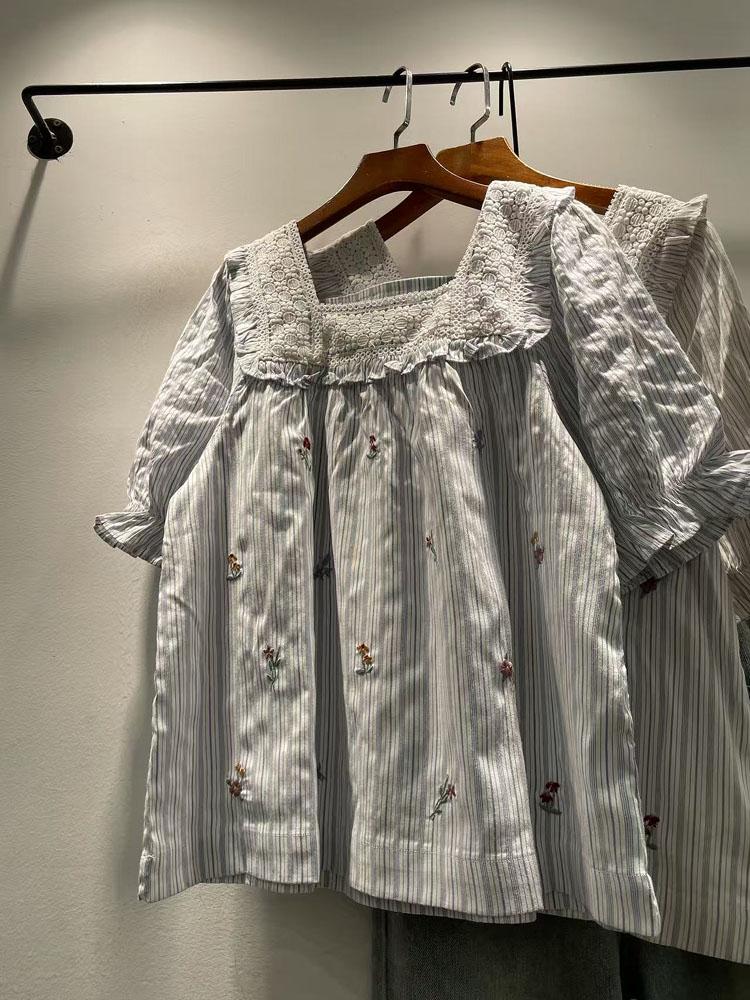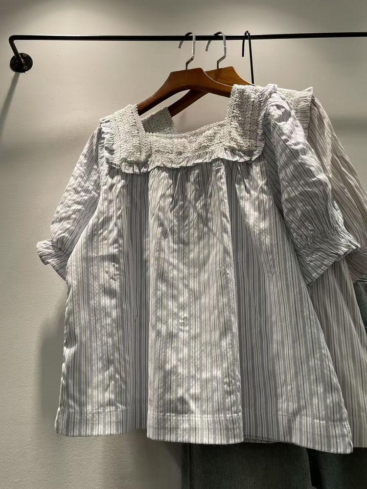 Verano Mujer Nuevo Estilo Coreano Rayado Encaje Cuello Cuadrado Jersey Suelto Camisa de Manga Corta Camisa de Mujer