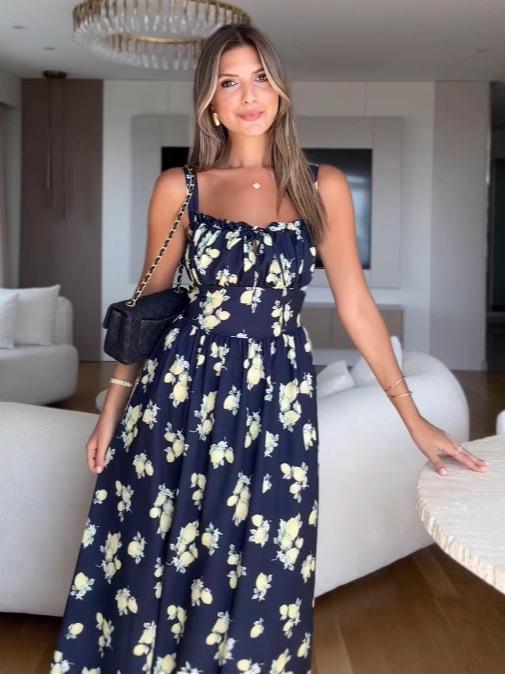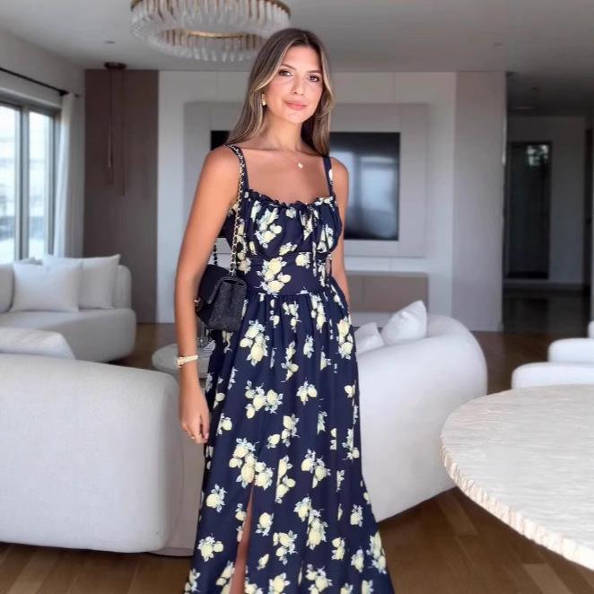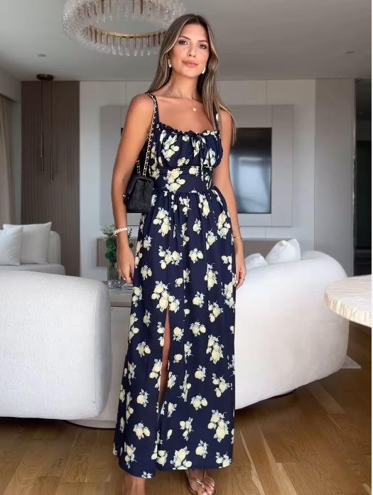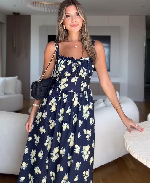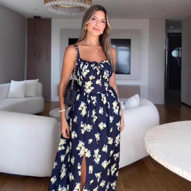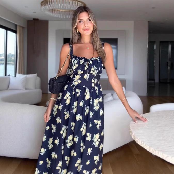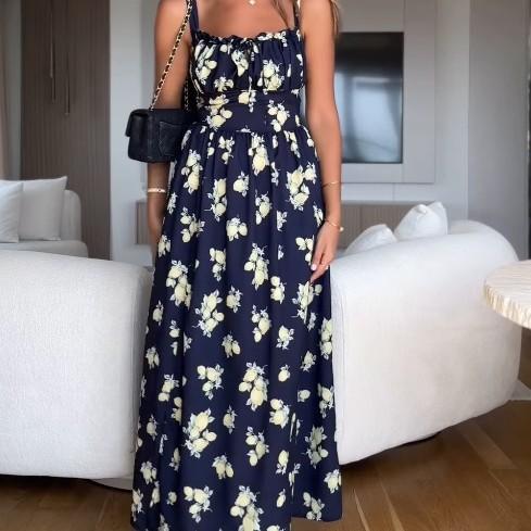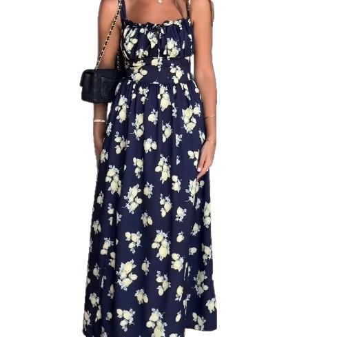 2025 Verano Nuevo Europeo y Americano Amazon Transfronterizo Sling Floral Dama Francesa Vestido Elegante