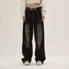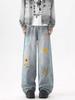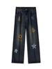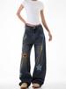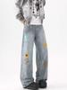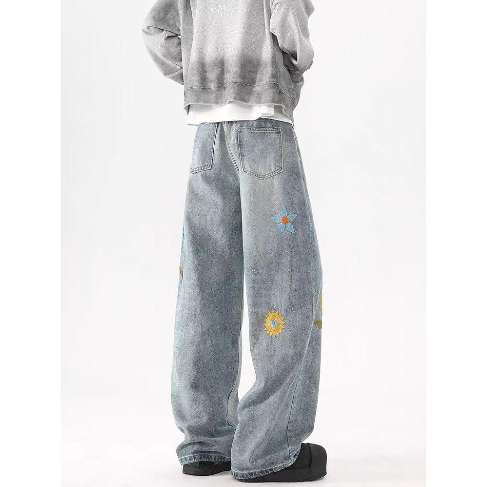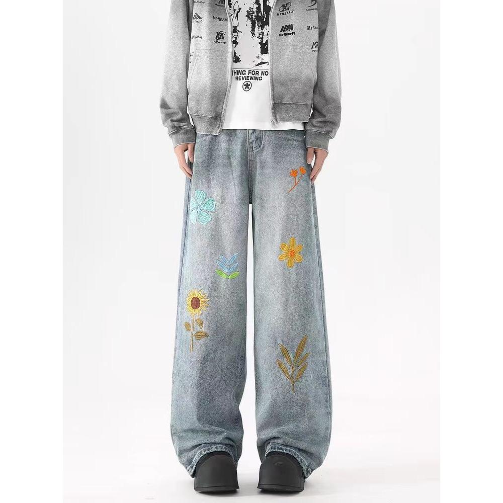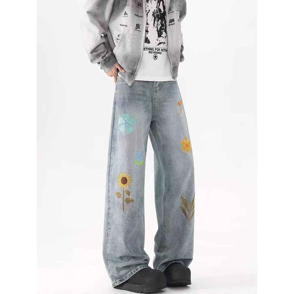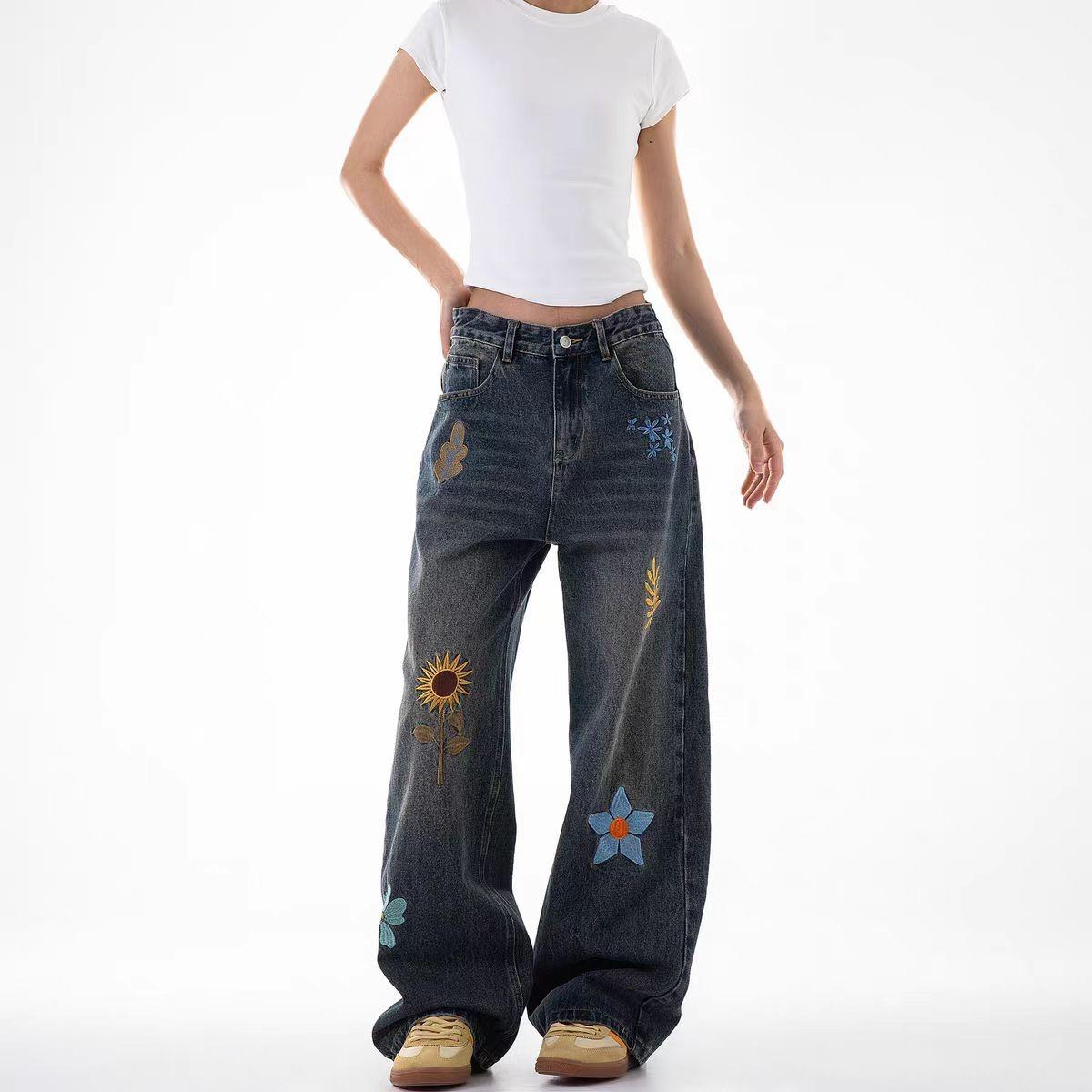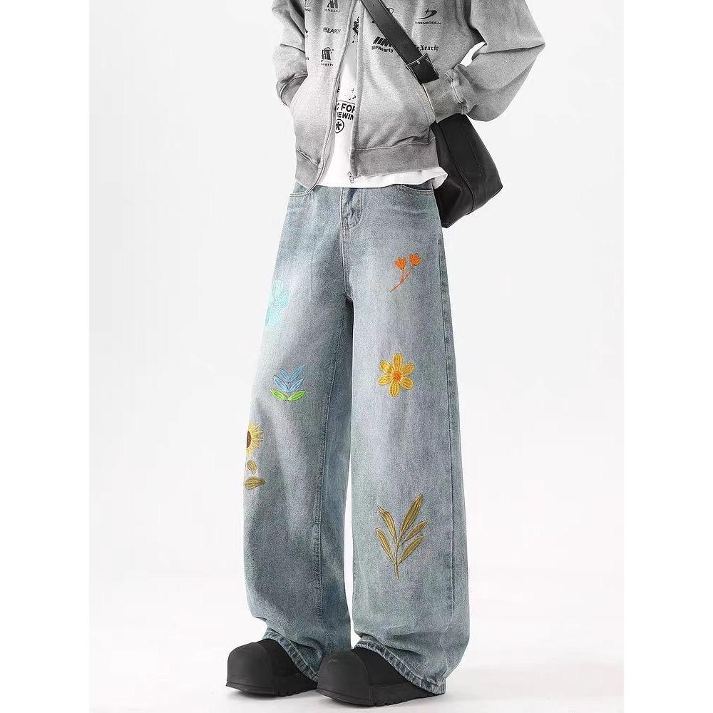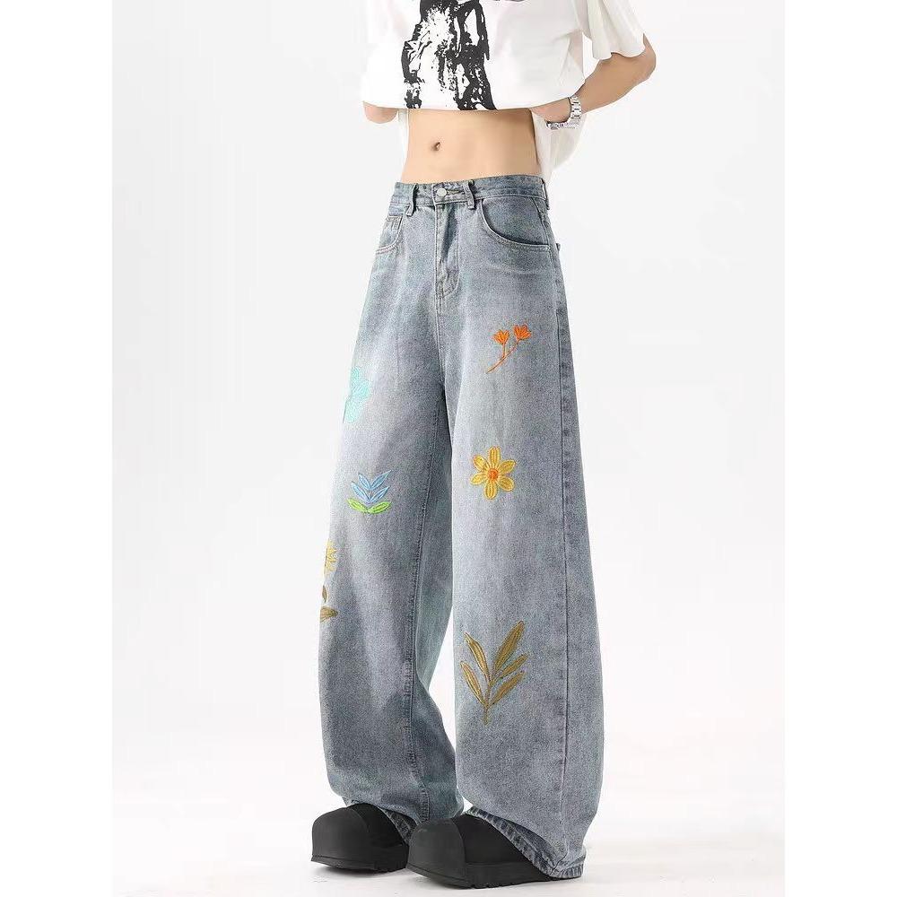 Pantalones vaqueros con bordado de flores y diseño retro lavado americano para hombres y mujeres, pantalones casuales holgados de pierna ancha y rectos de calle alta