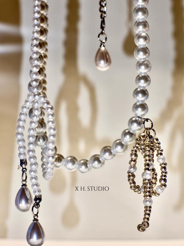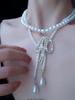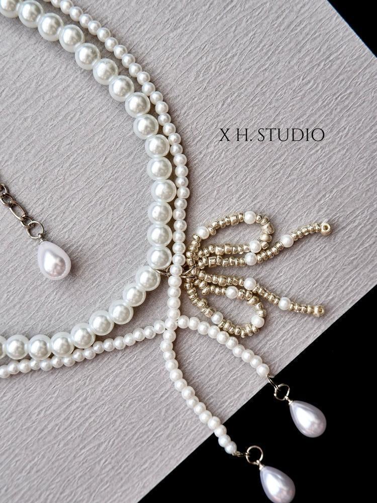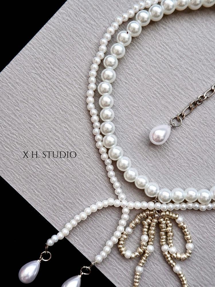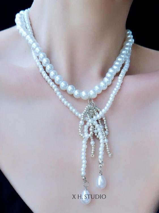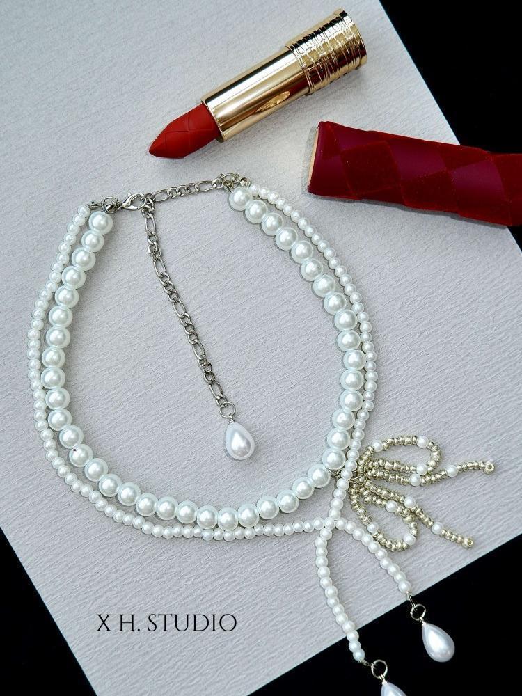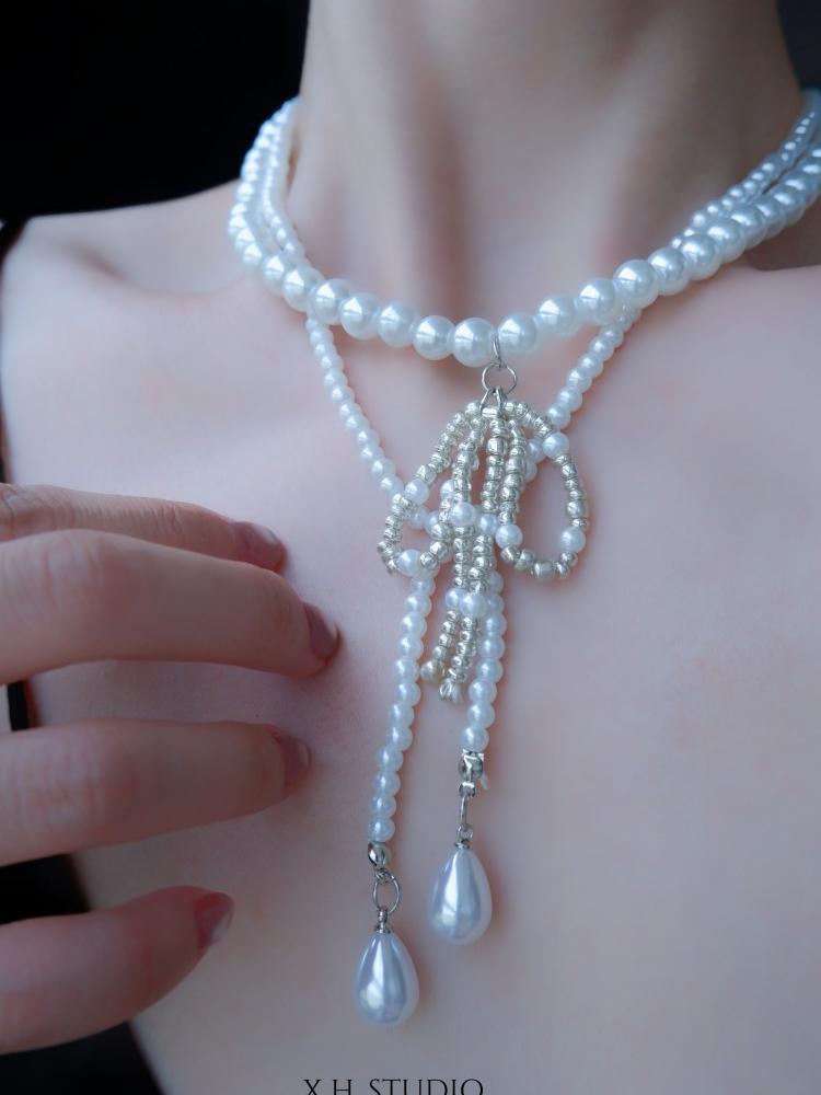 Un juego de perlas de doble hebra conectado permanentemente. Presenta dos capas de perlas inseparablemente unidas con un colgante central de lazo de aleación de plata, diseñado para un estilo elegante unificado.