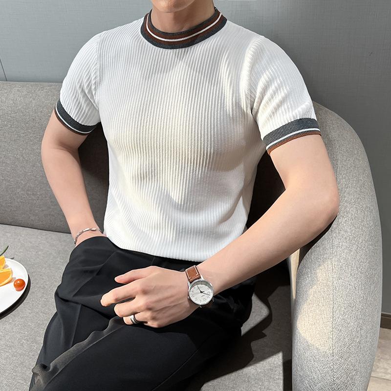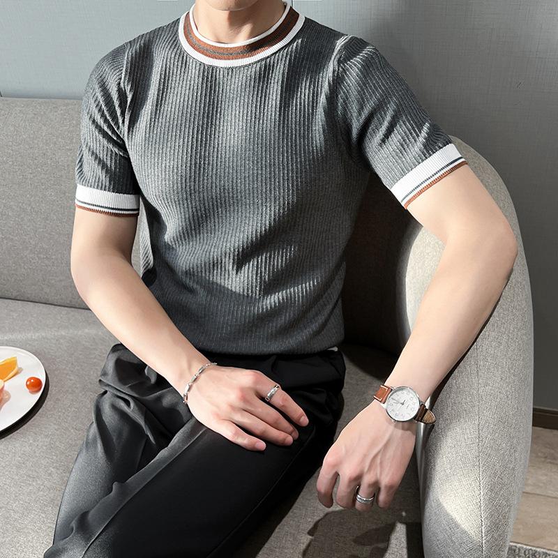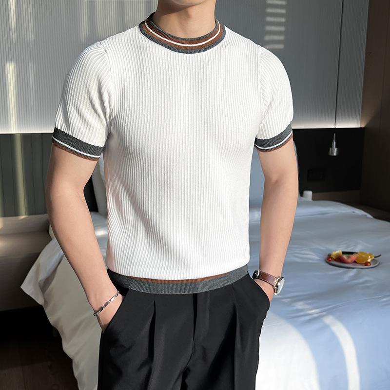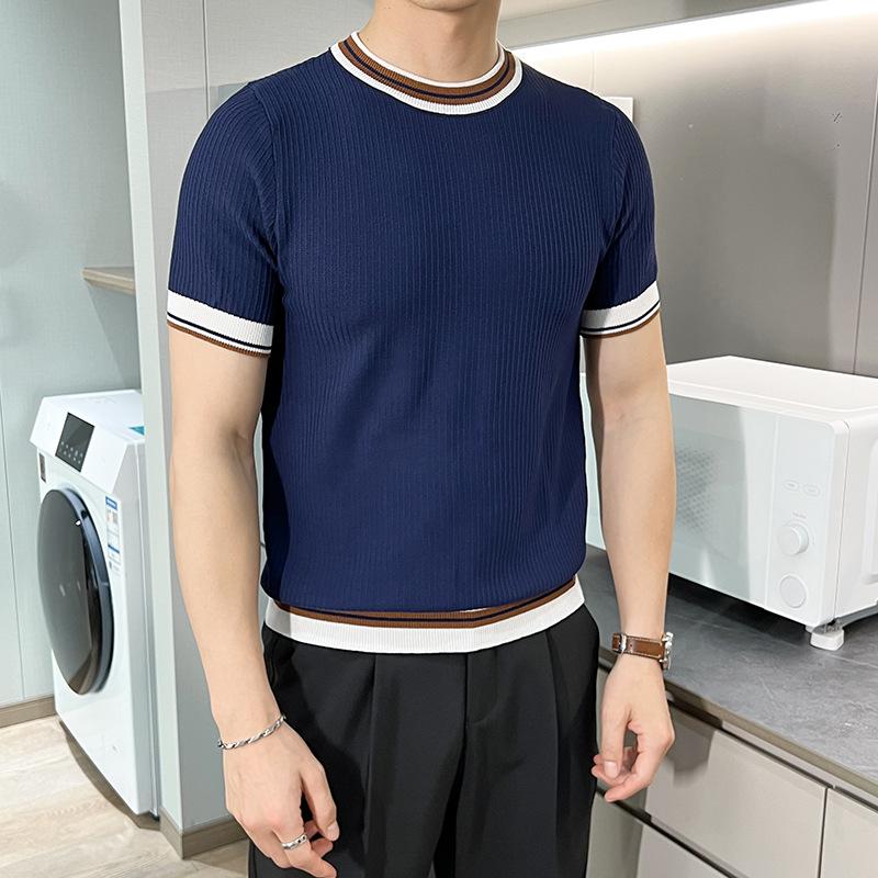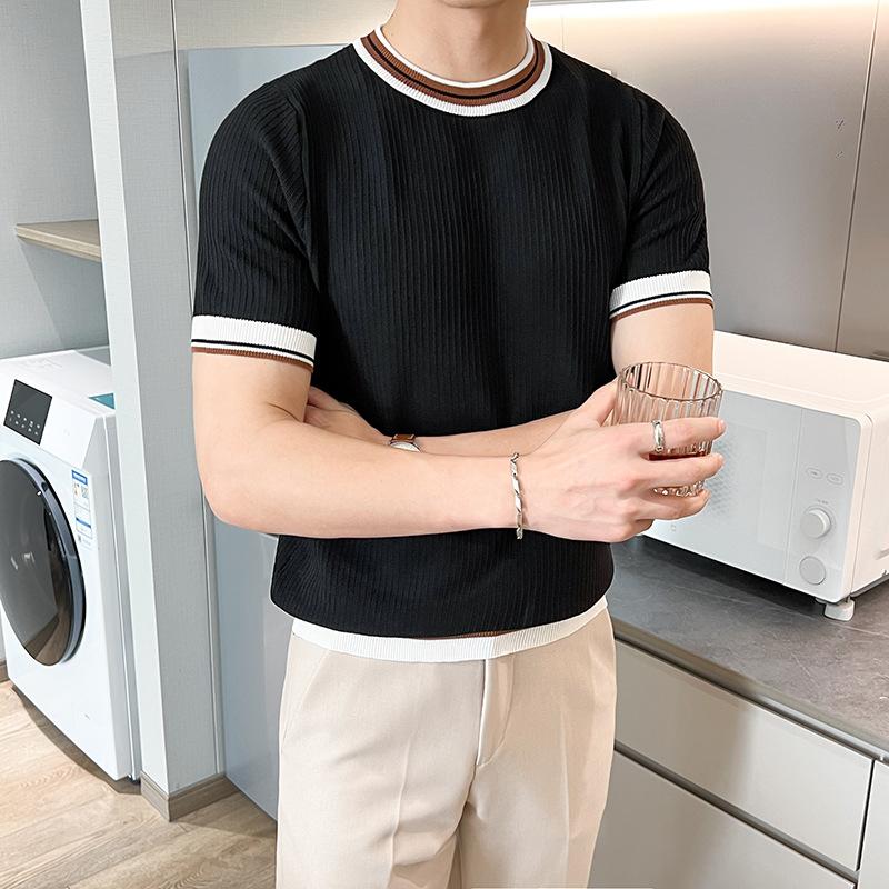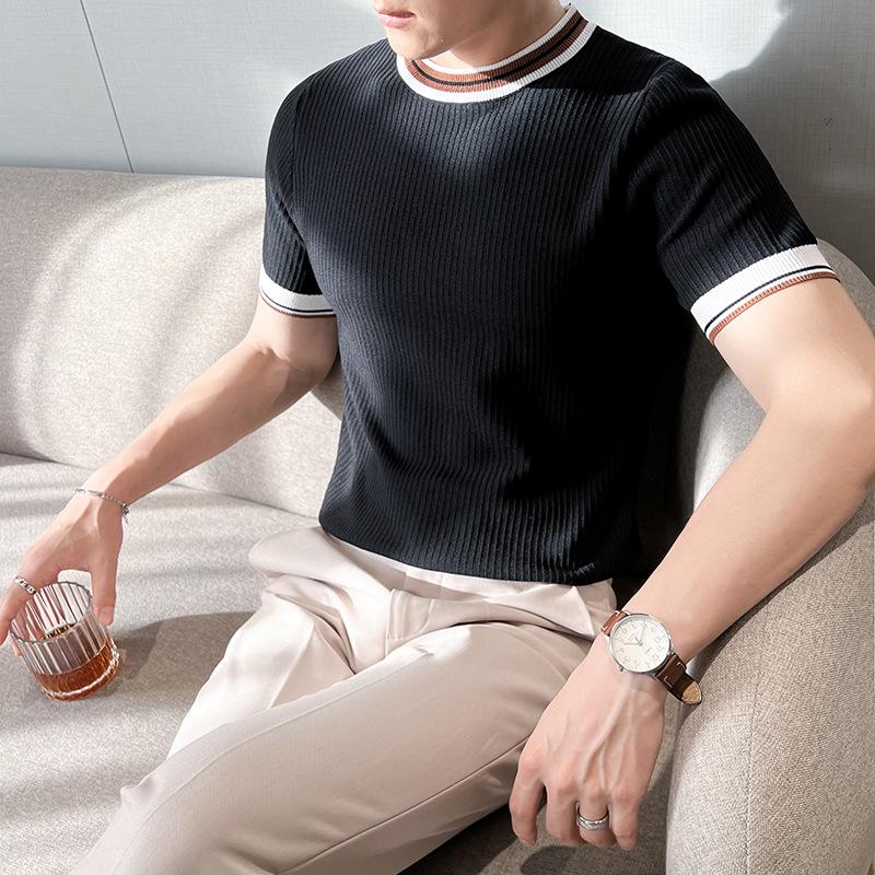 Playera de Punto de Manga Corta de Color Contraste a Rayas Finas para Hombre, de Seda Helada de Alta Gama, Cuello Redondo, Estilo Británico, Top Transpirable