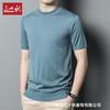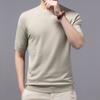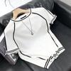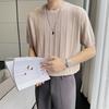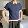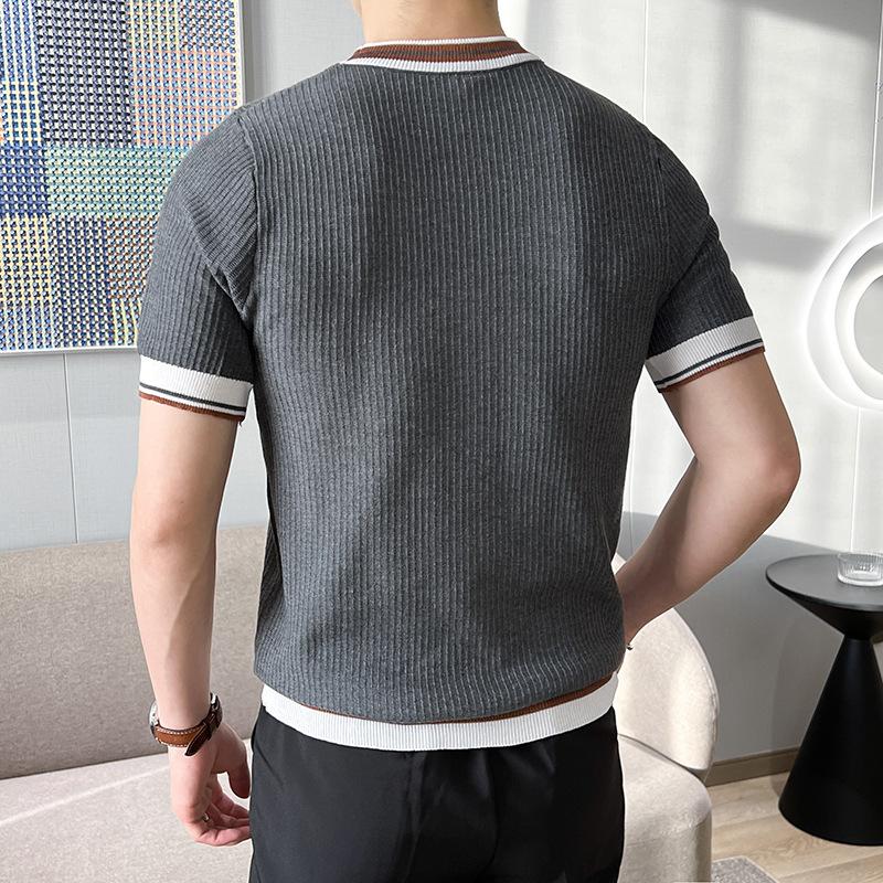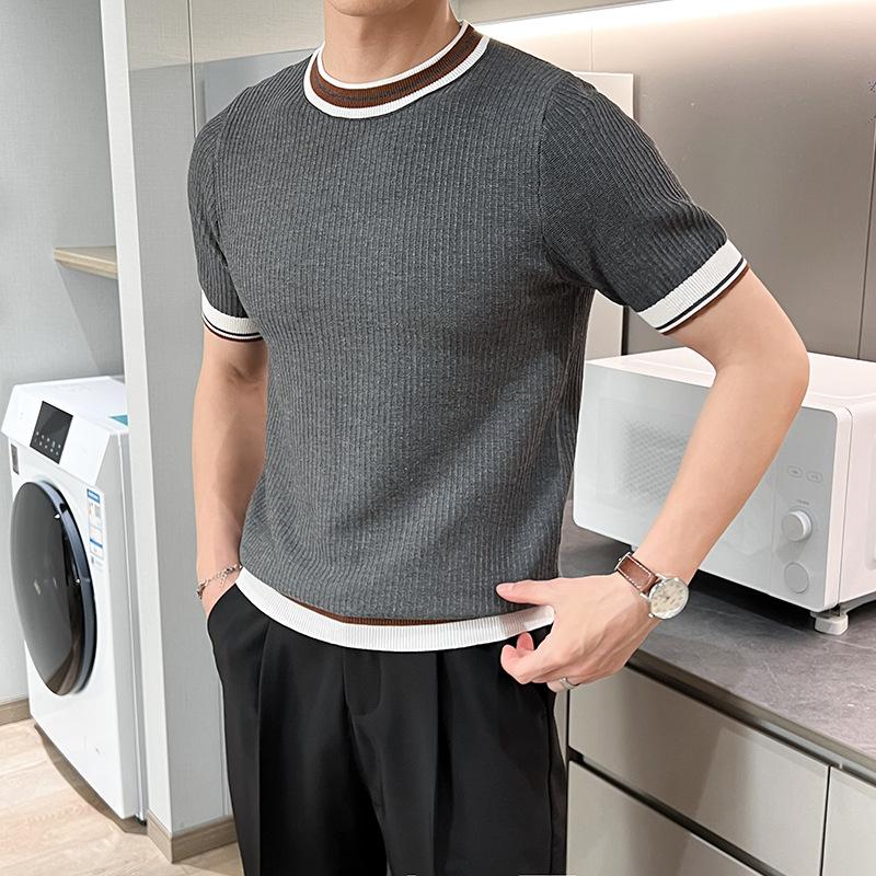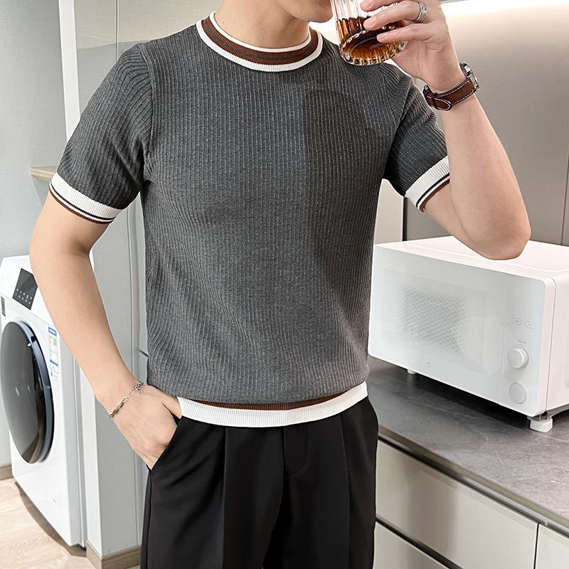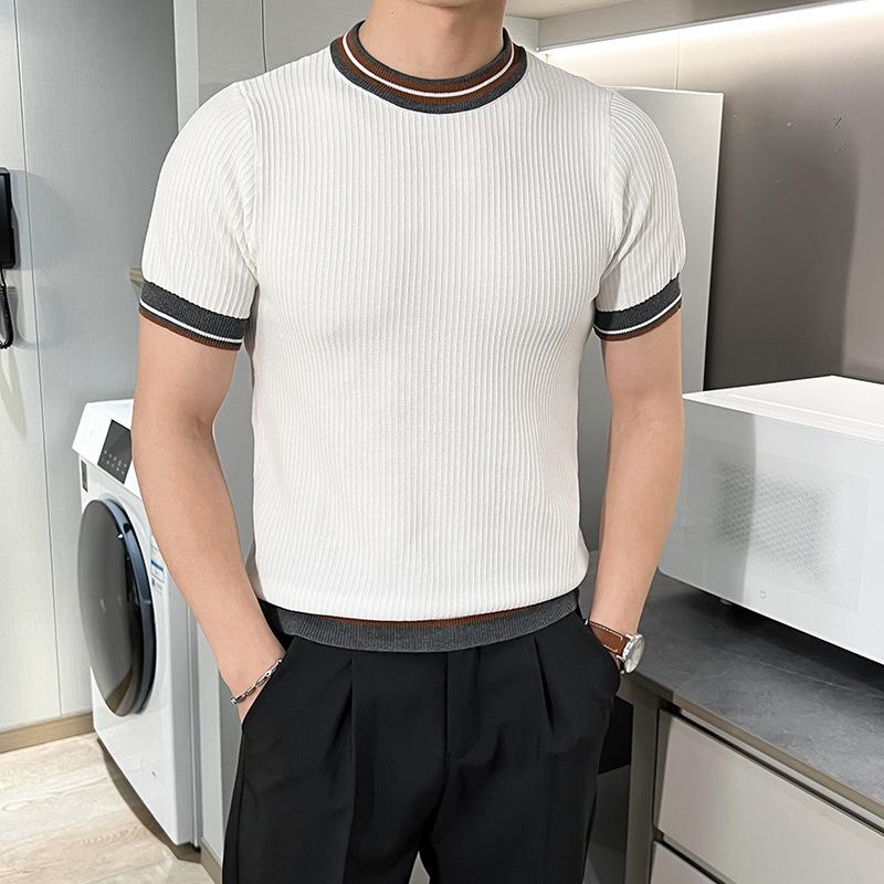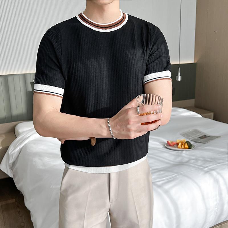 Playera de Punto de Manga Corta de Color Contraste a Rayas Finas para Hombre, de Seda Helada de Alta Gama, Cuello Redondo, Estilo Británico, Top Transpirable