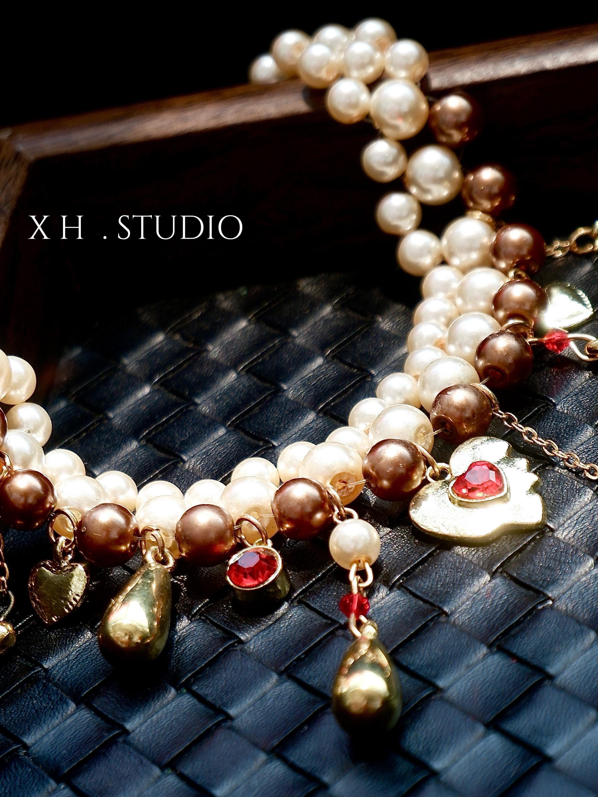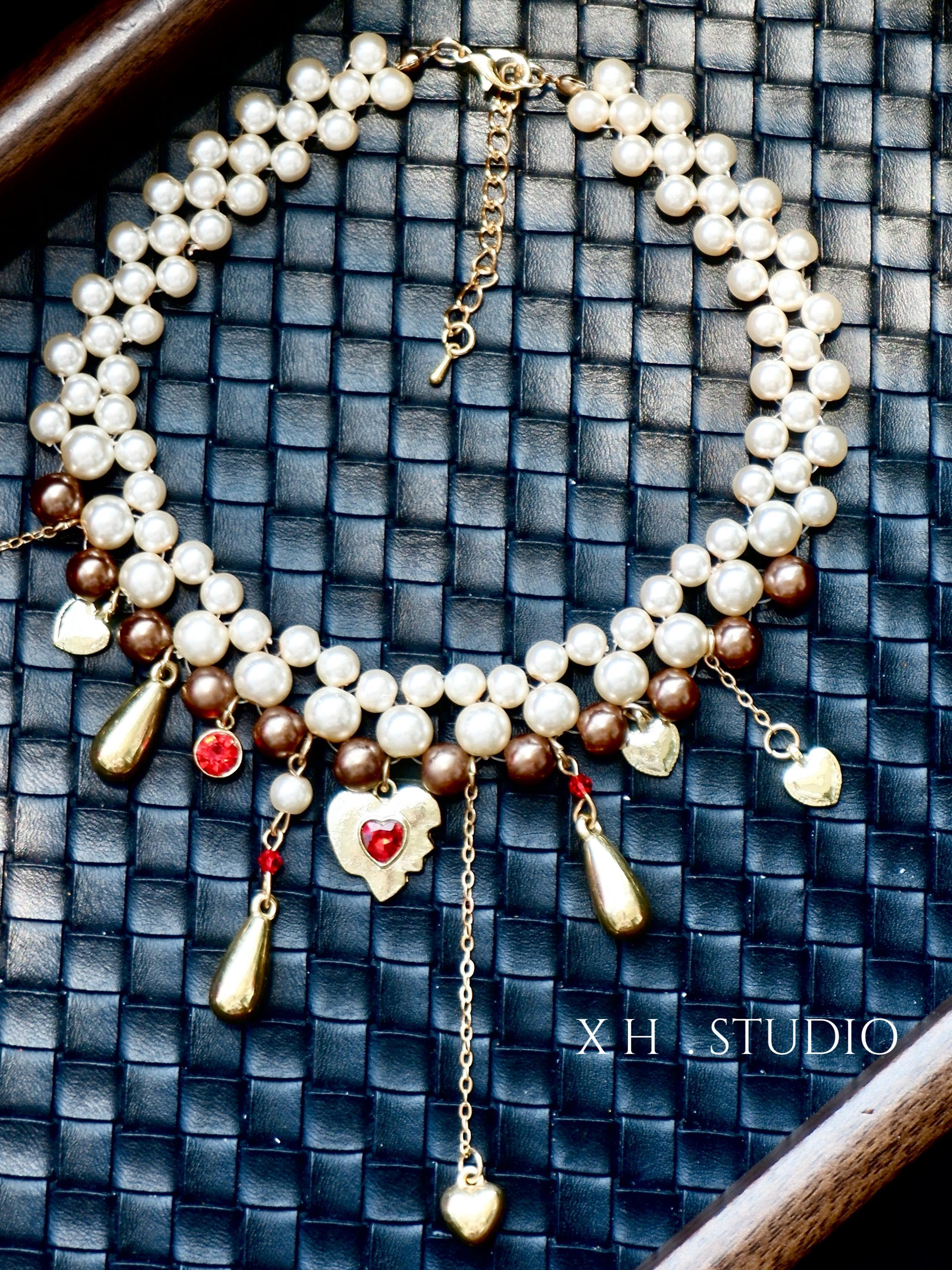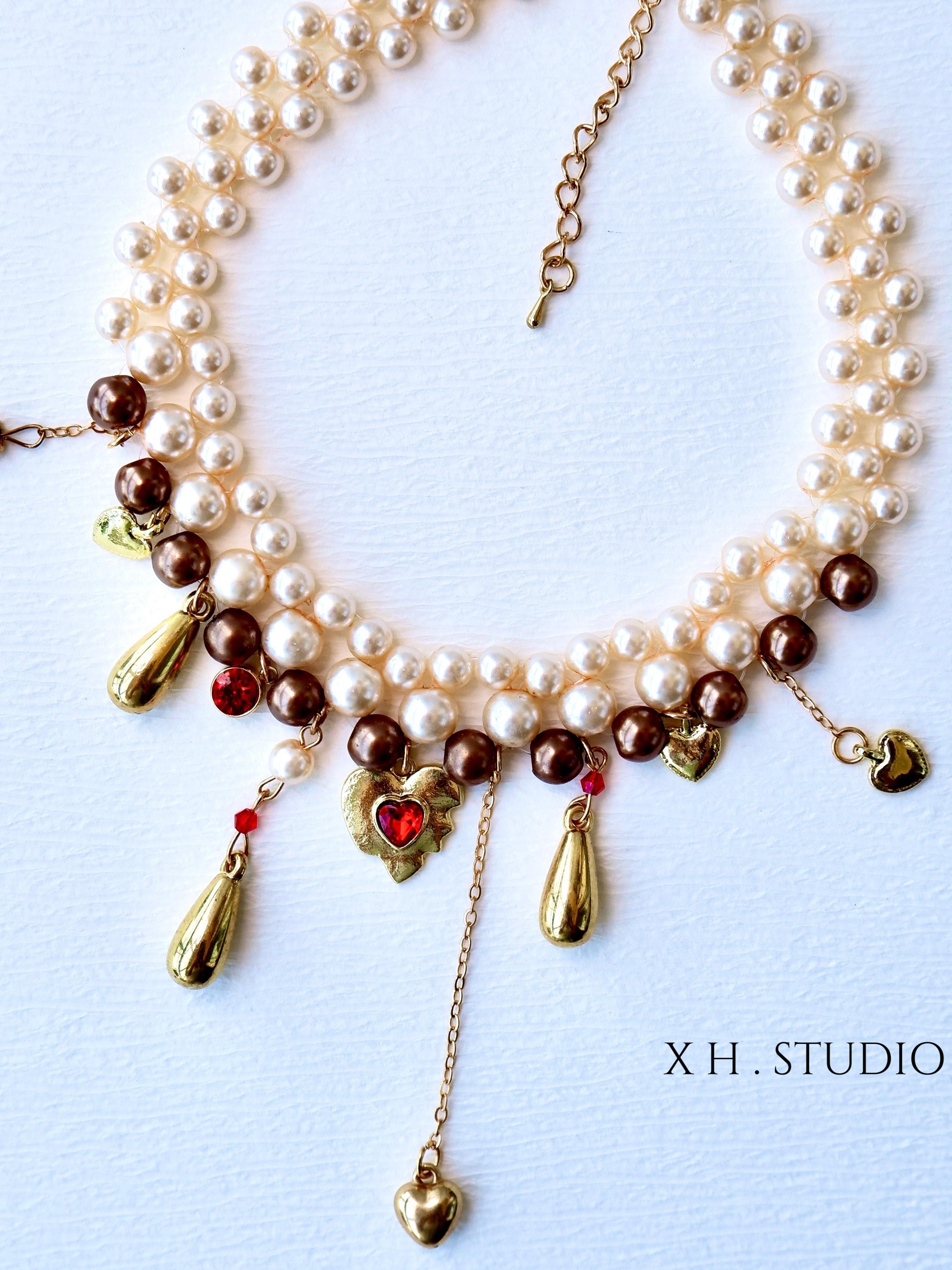 Canaliza la elegancia regia con este collar de perlas vintage de triple hebra. Presenta perlas luminosas color champán combinadas con un colgante de oro antiguo acentuado con piedras naturales, evocando la grandeza palaciega atemporal.