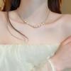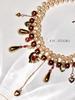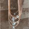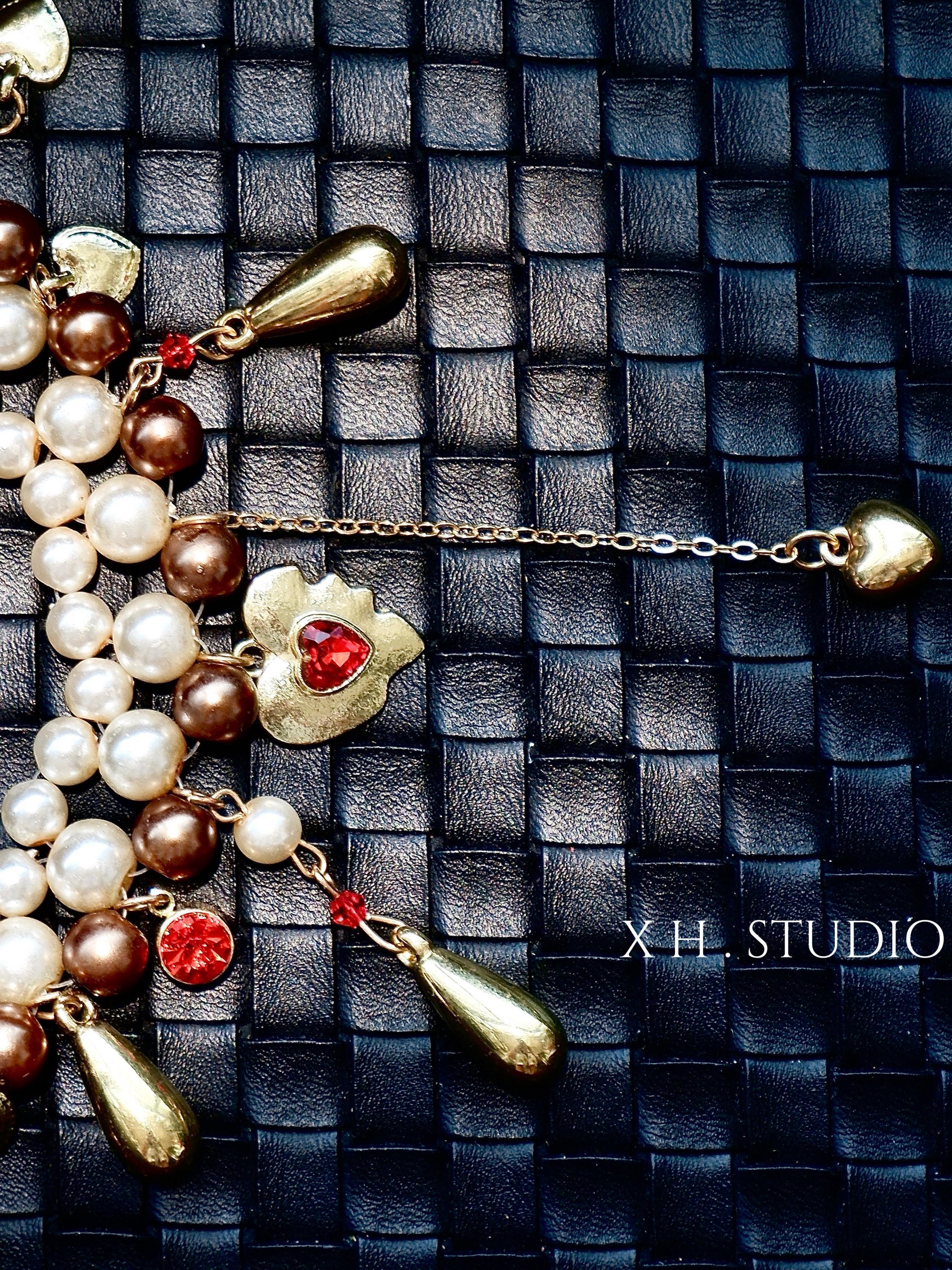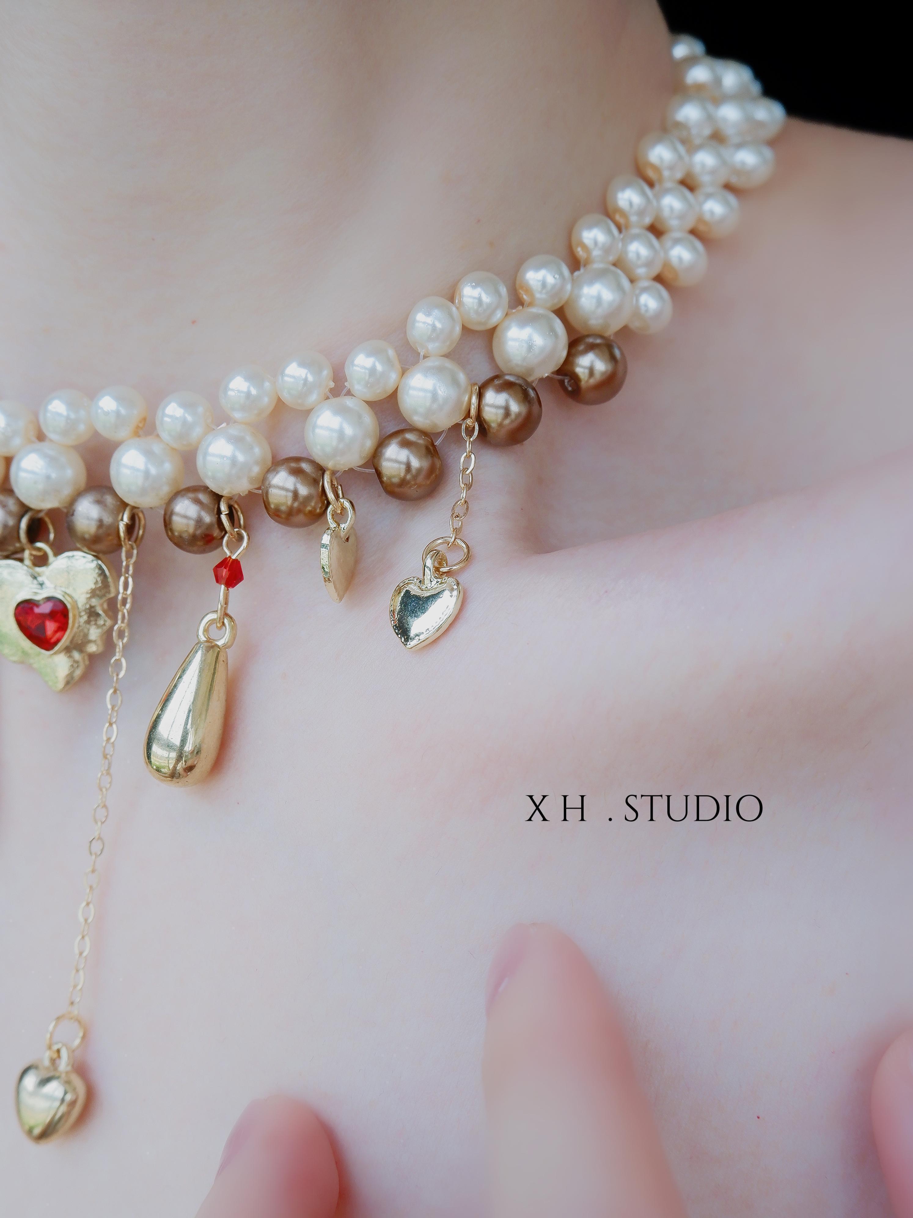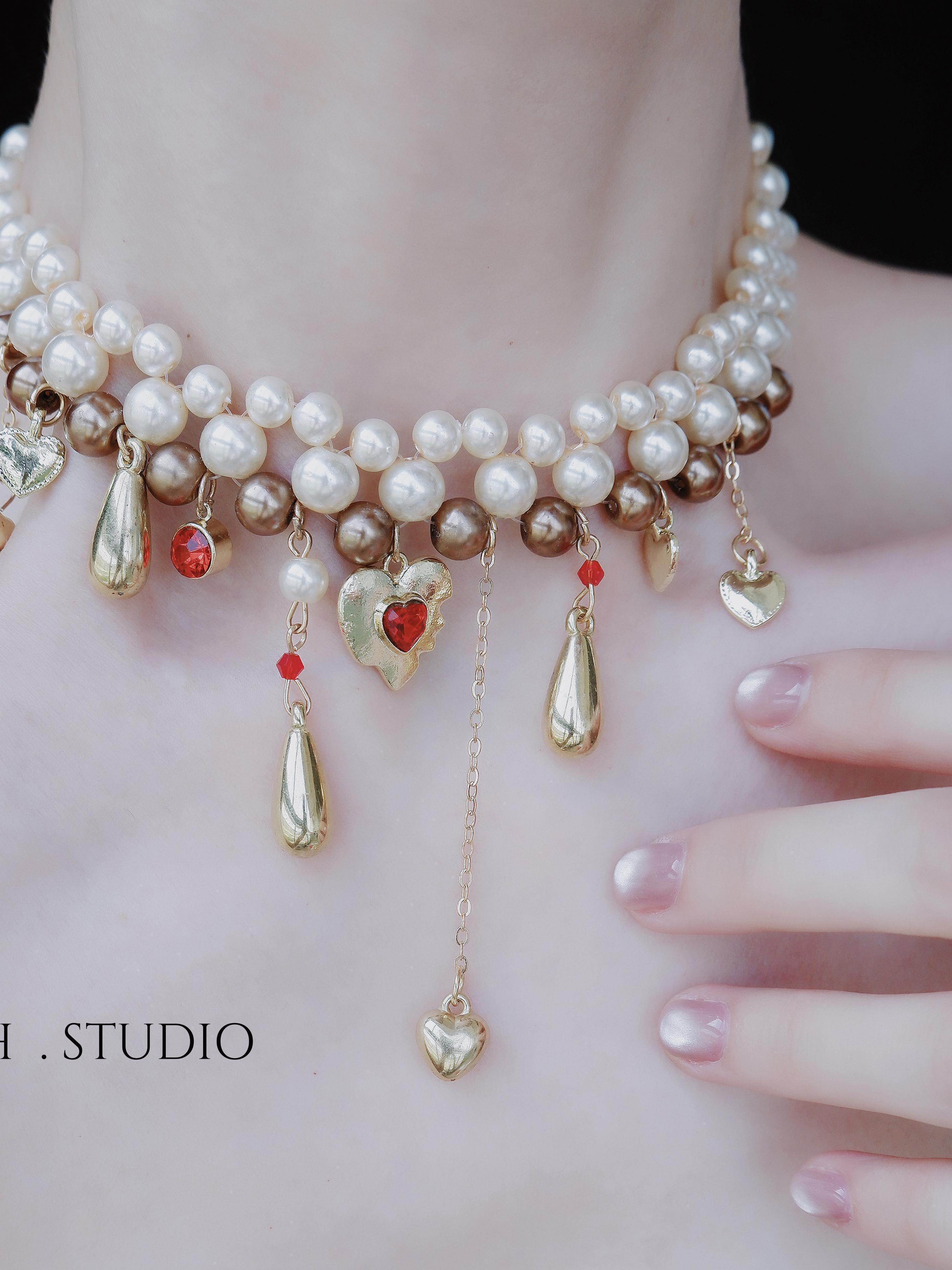 Canaliza la elegancia regia con este collar de perlas vintage de triple hebra. Presenta perlas luminosas color champán combinadas con un colgante de oro antiguo acentuado con piedras naturales, evocando la grandeza palaciega atemporal.