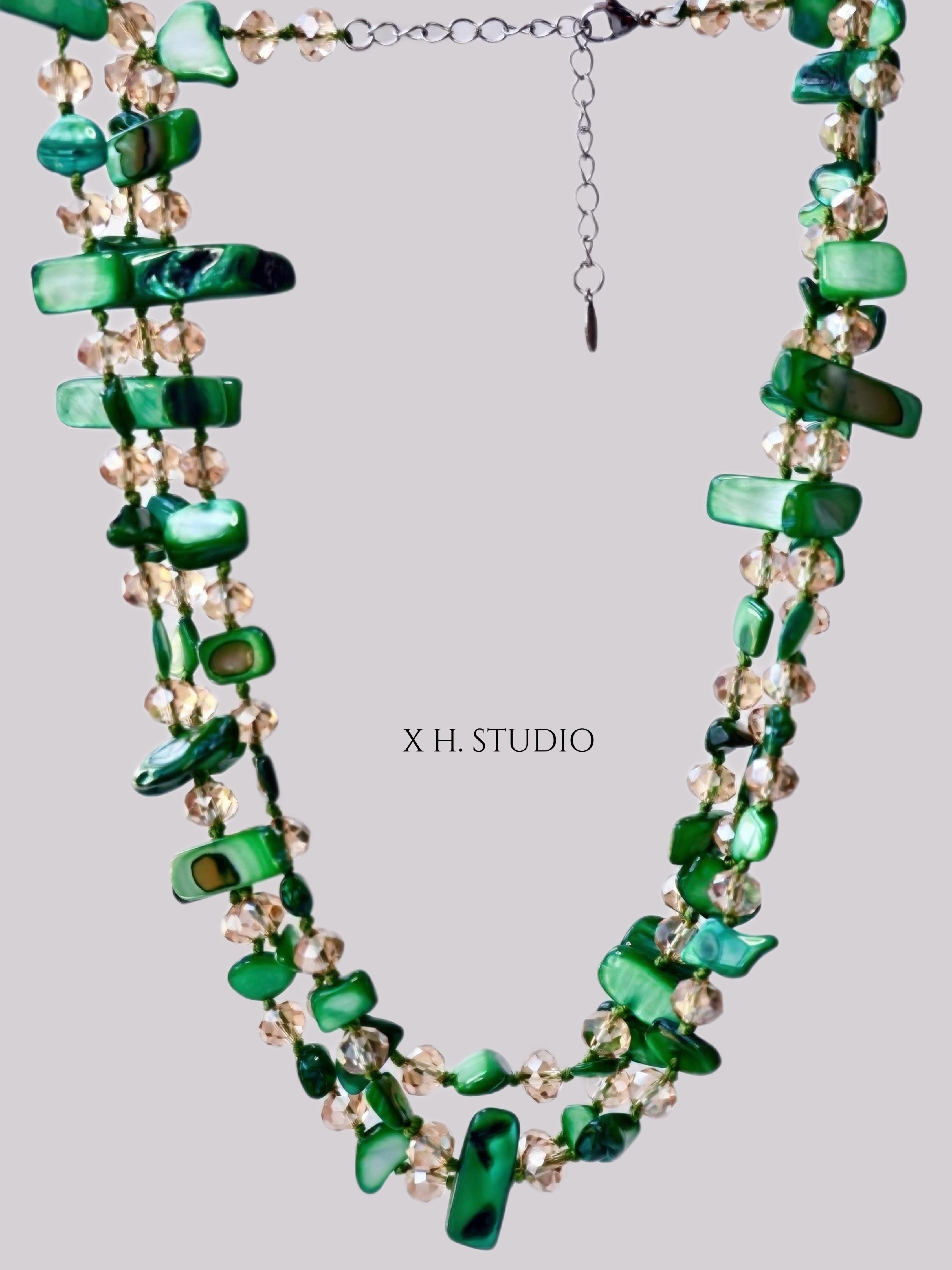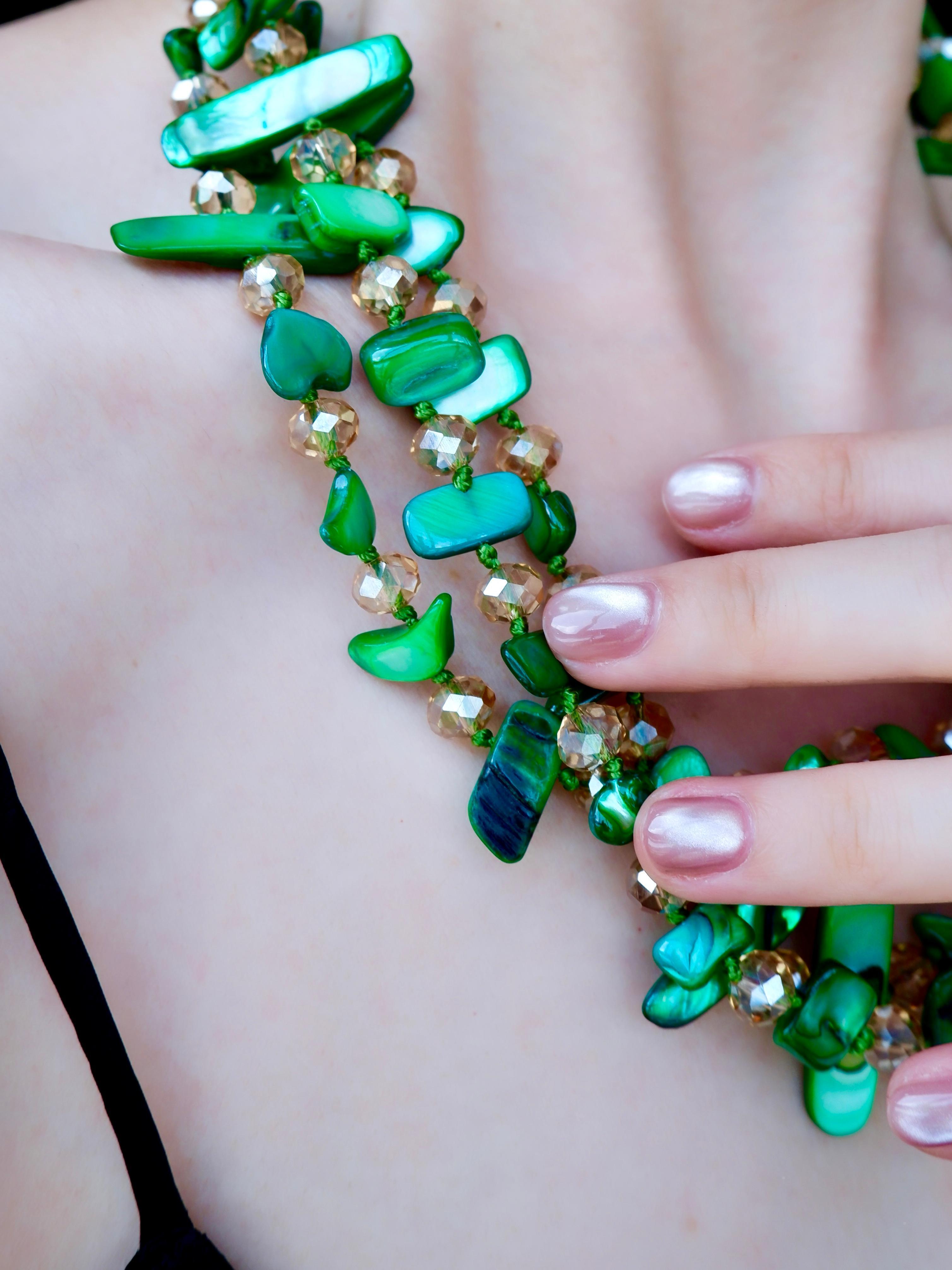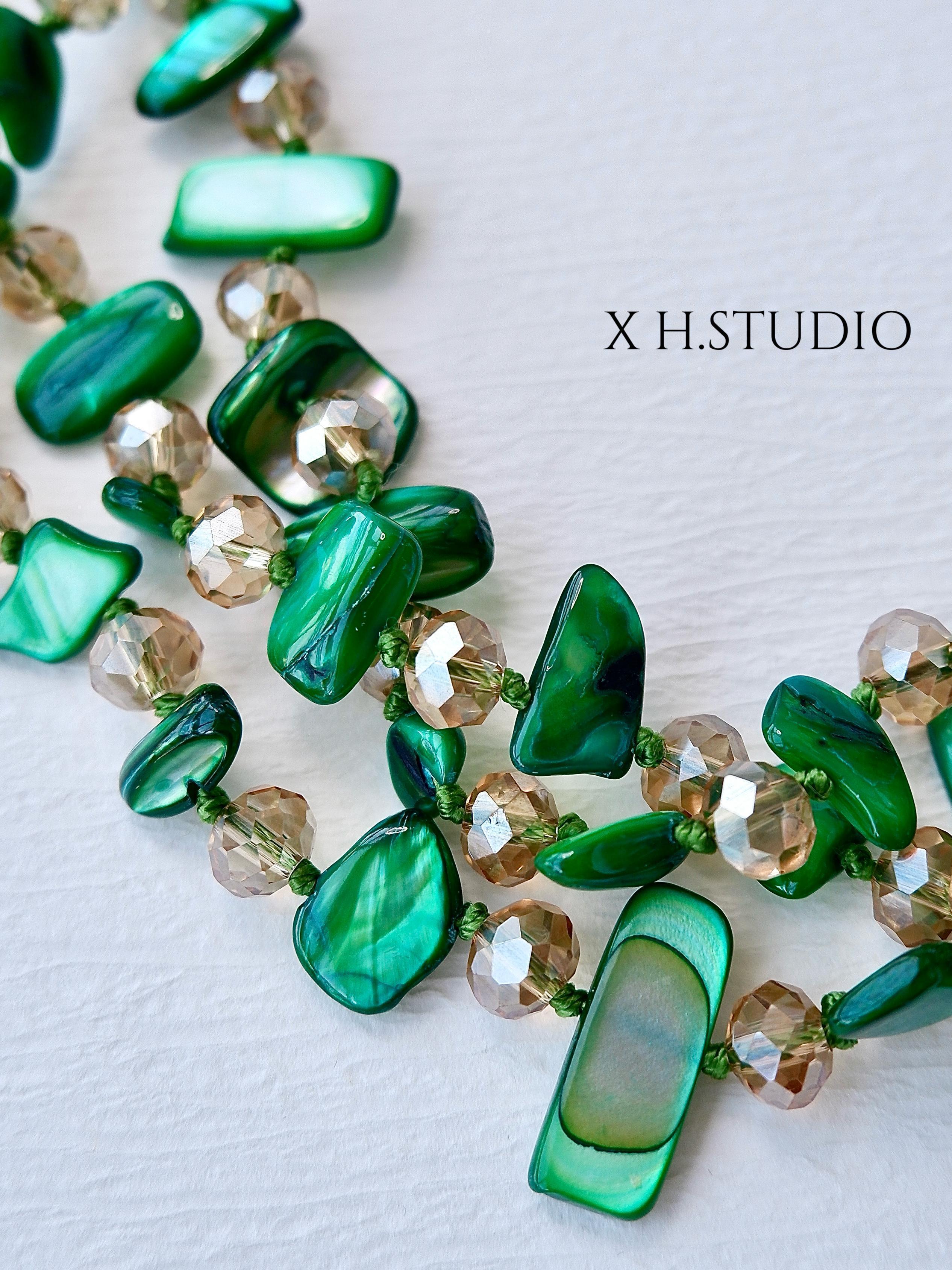 Eleva tu elegancia con este lujoso collar de triple hebra. Presenta ricas cuentas de resina premium en verde esmeralda combinadas con acentos facetados en oro champán, diseñadas para una fácil superposición.