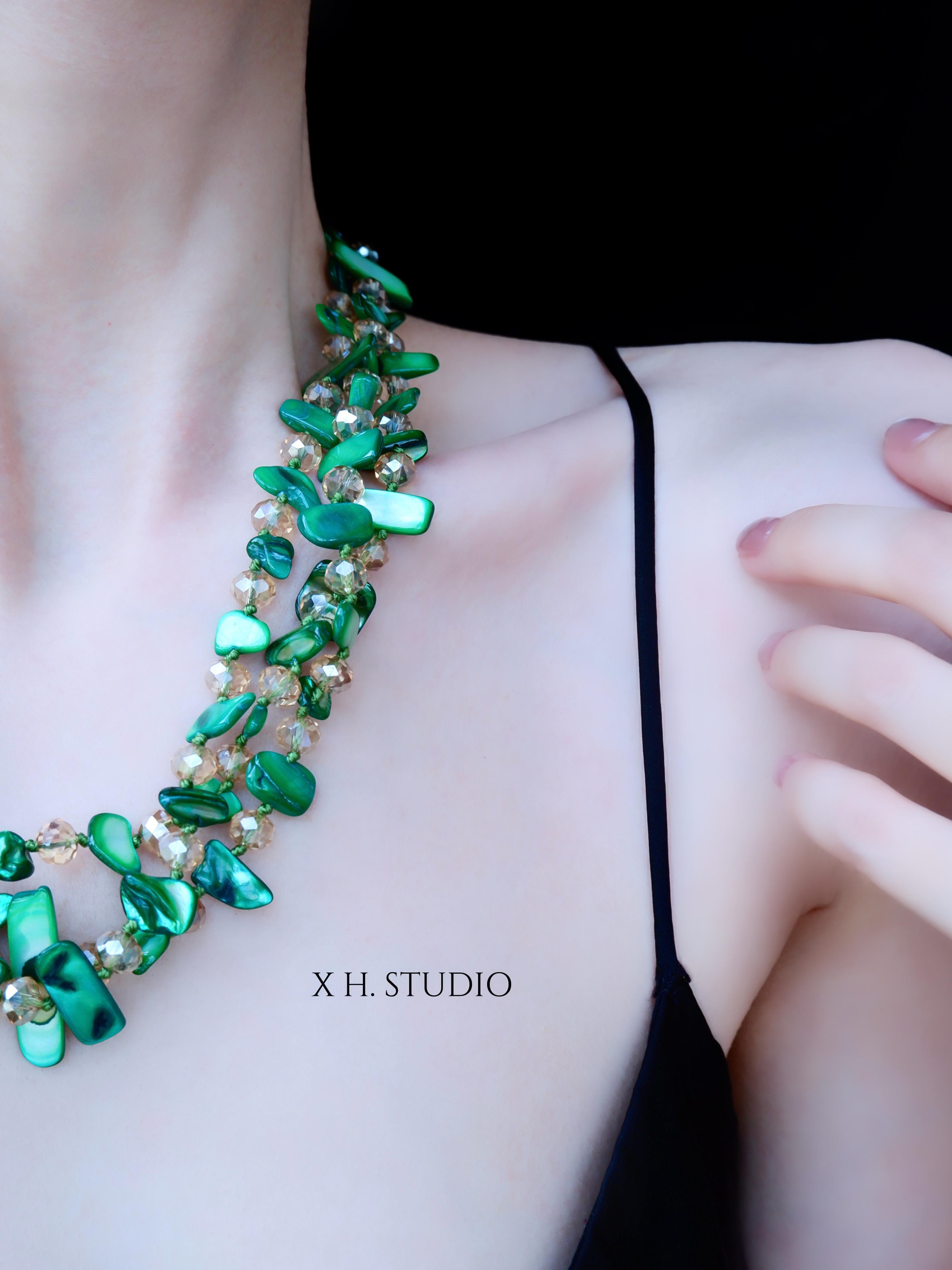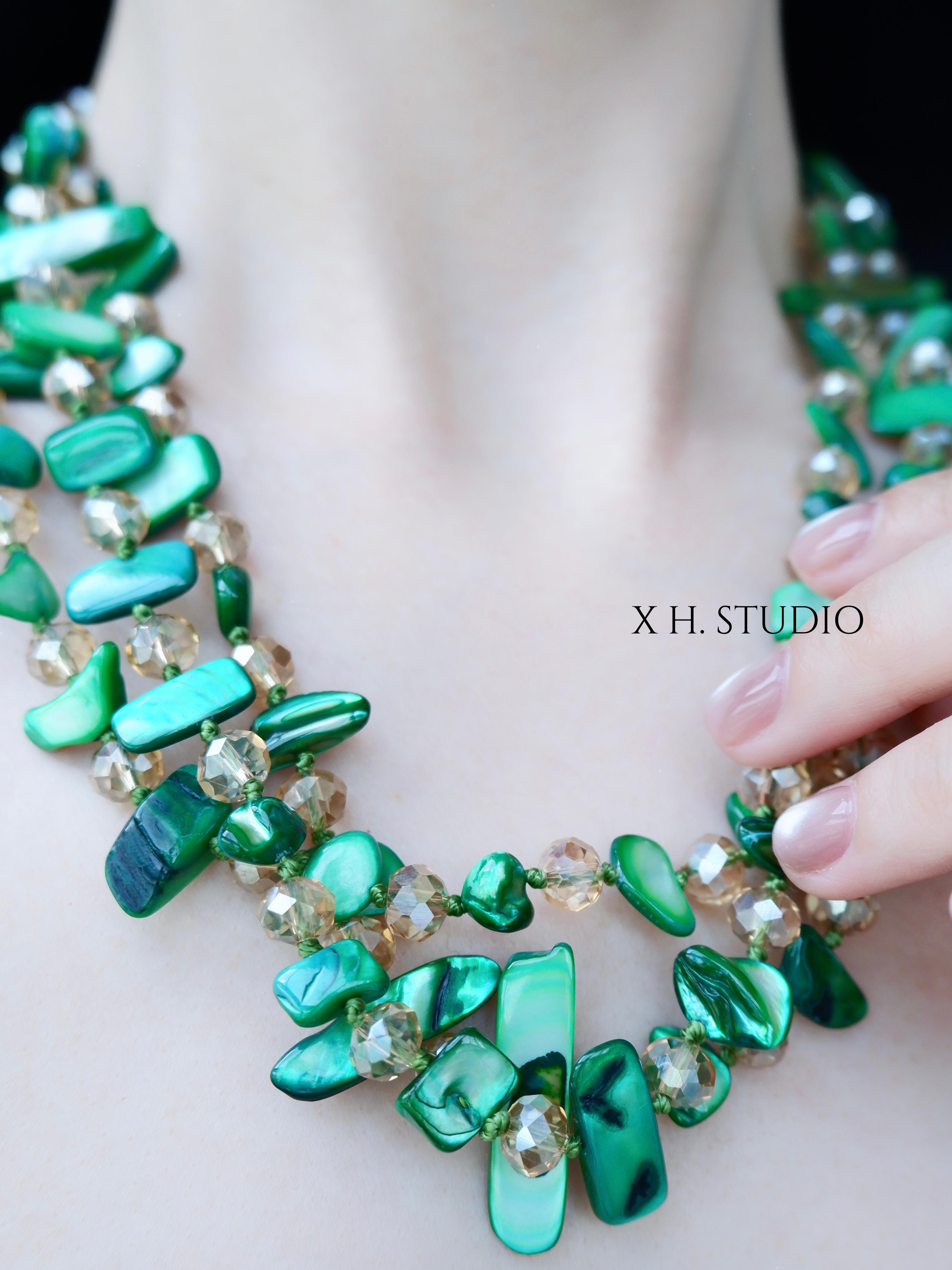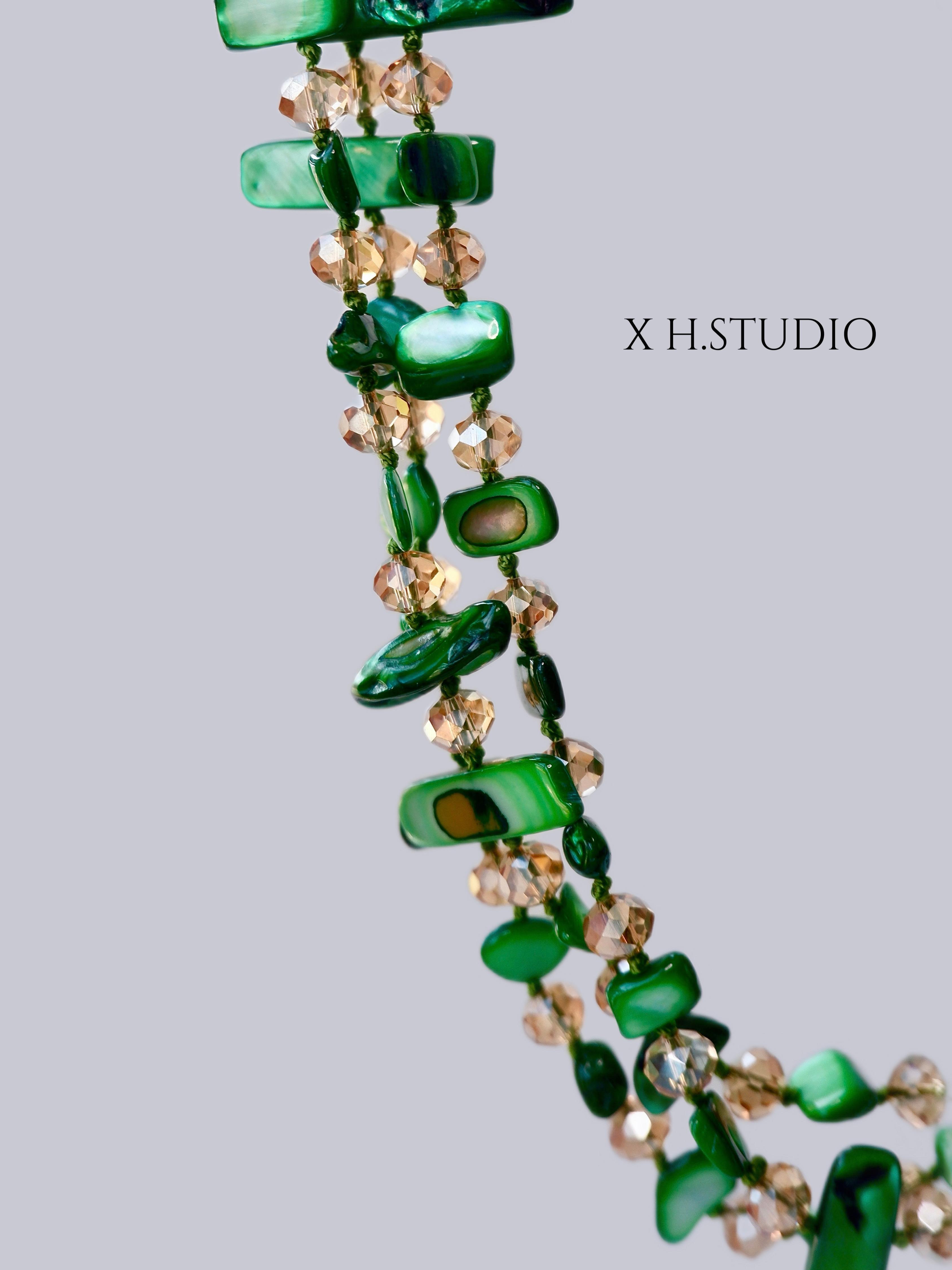 Eleva tu elegancia con este lujoso collar de triple hebra. Presenta ricas cuentas de resina premium en verde esmeralda combinadas con acentos facetados en oro champán, diseñadas para una fácil superposición.