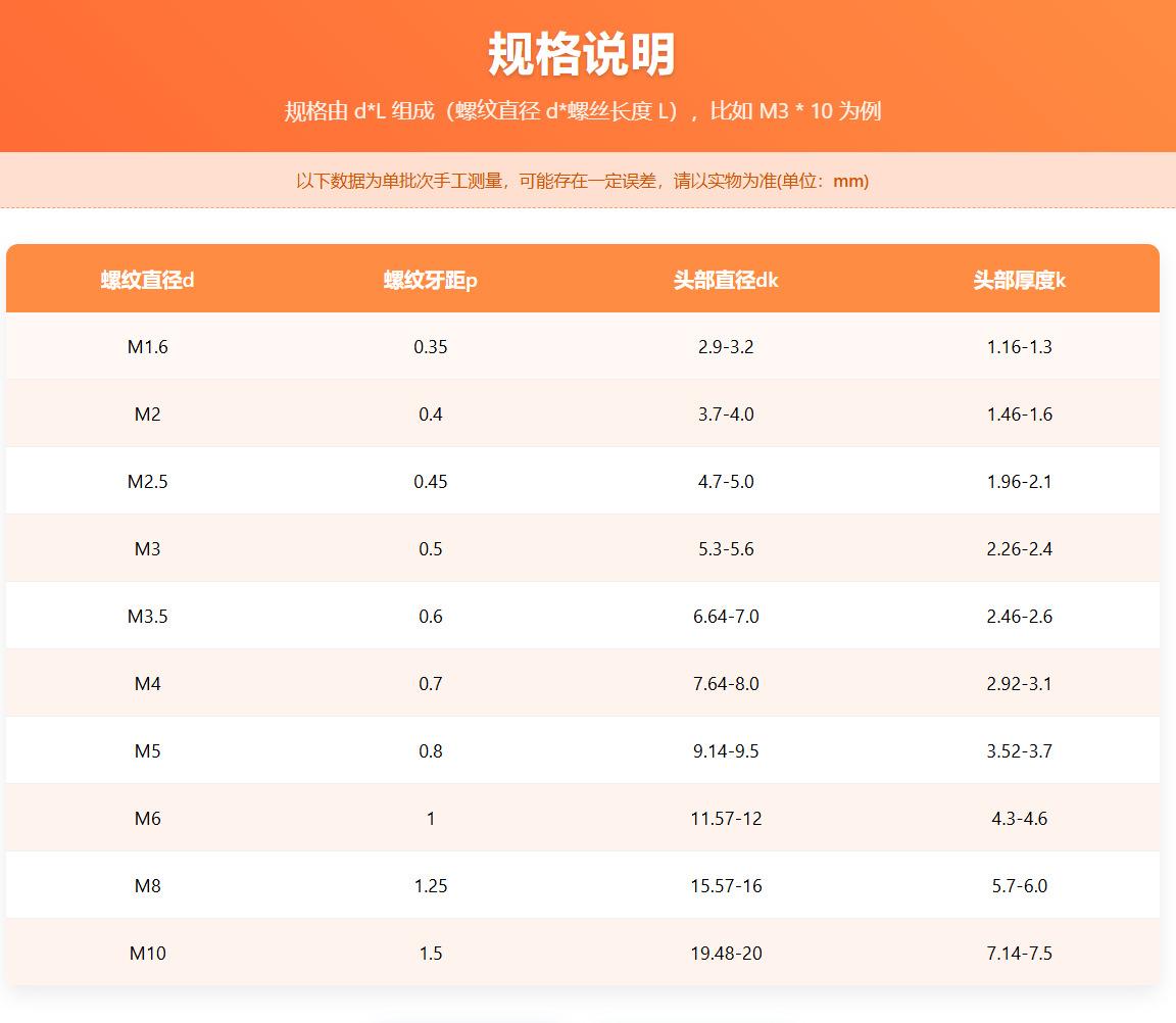 M2*3, M2*4, M2*5, M2*6, M2*8, M2*10, M2*12, M2*14, M2*16, M2*18, M2*20, M2*25, M2.5*3, M2.5*4, M2.5*5, M2.5*6,...