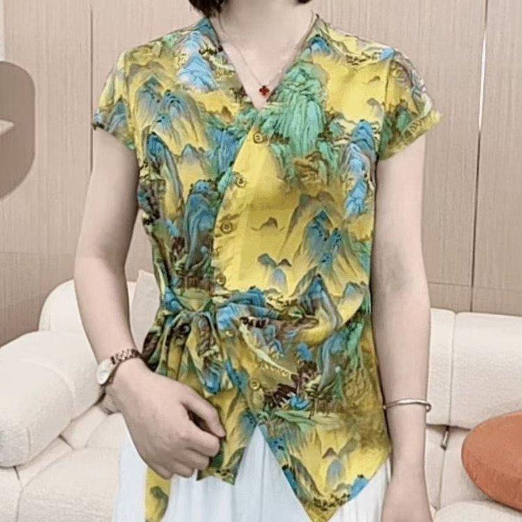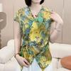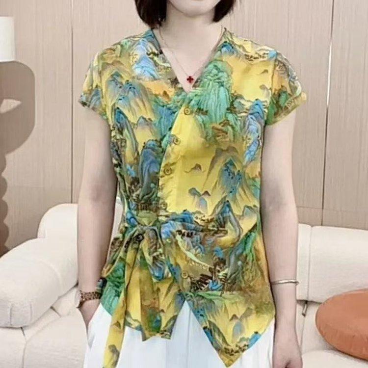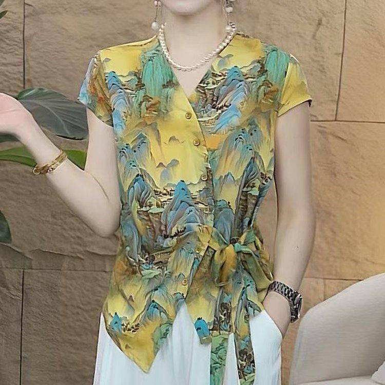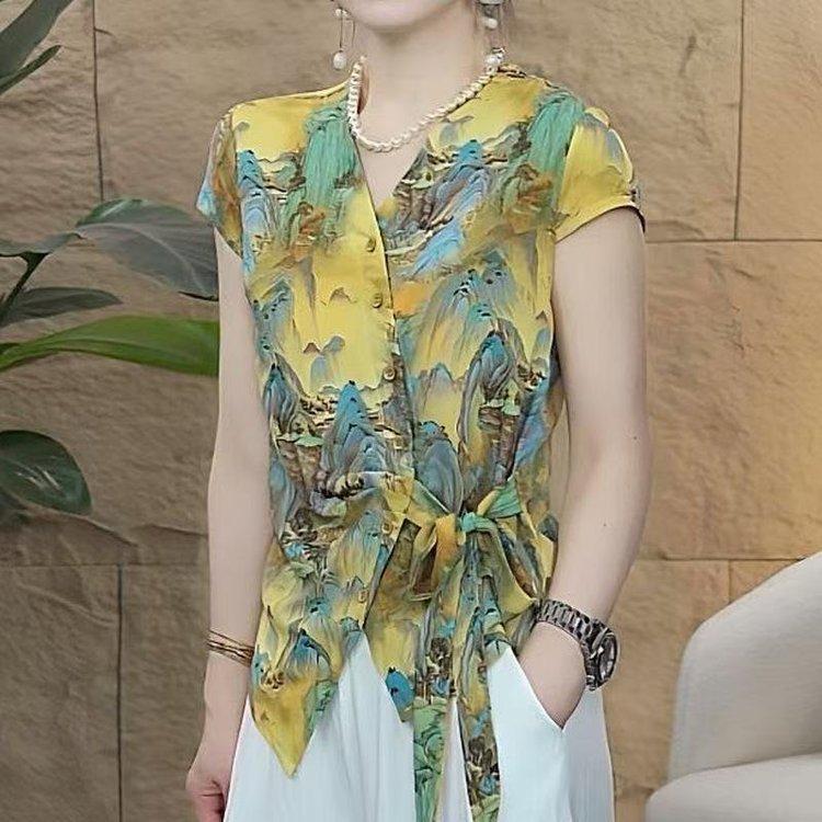 Vestido de una pieza envío directo estilo caliente en vivo 2025 verano nueva moda estilo extranjero cuello en V adelgazante temperamento estampado atar blusa