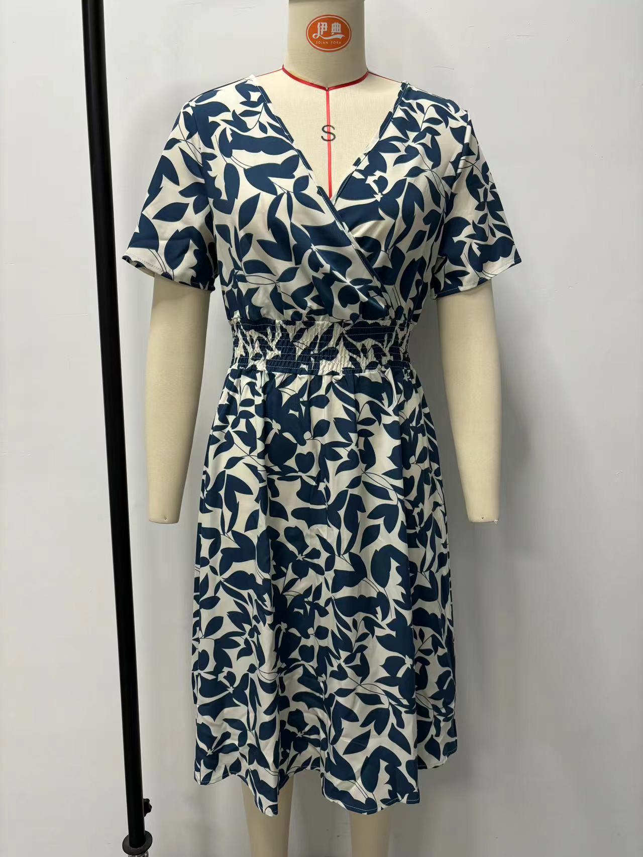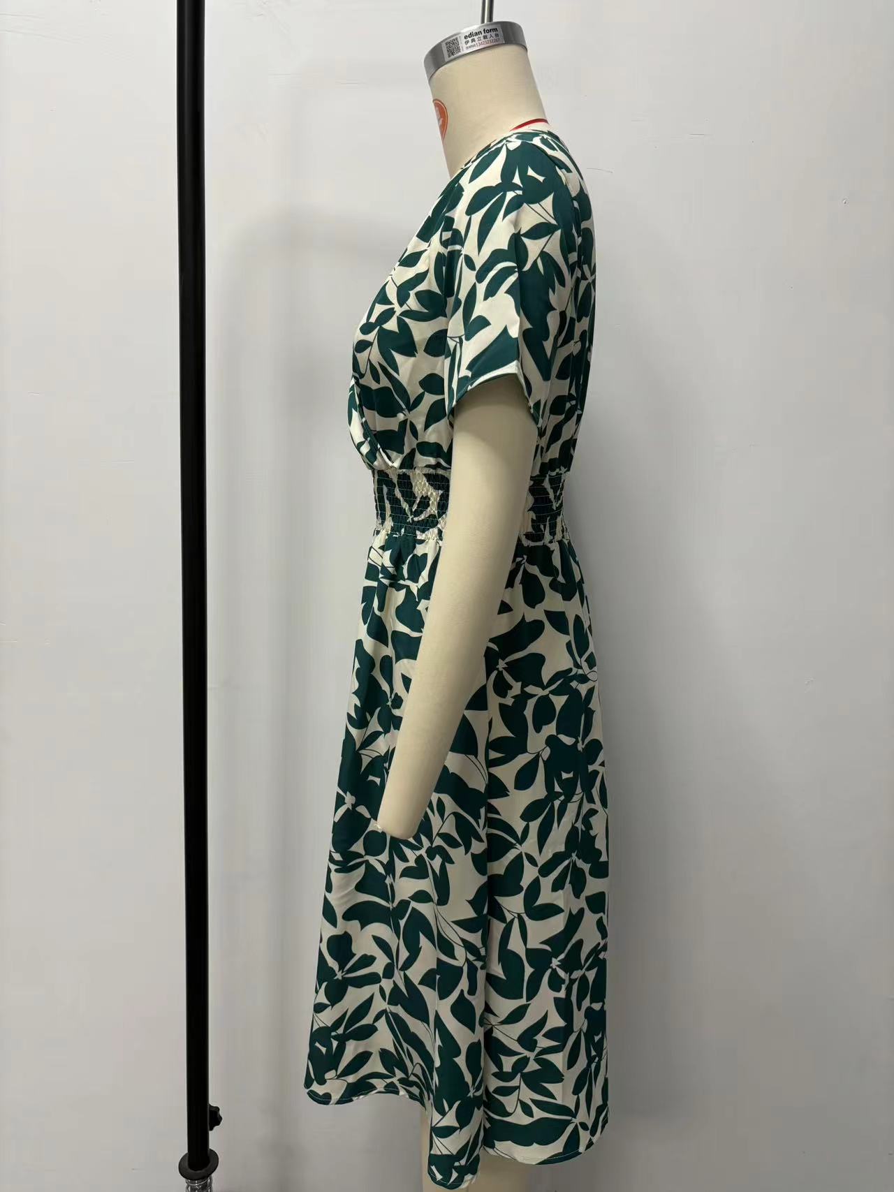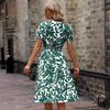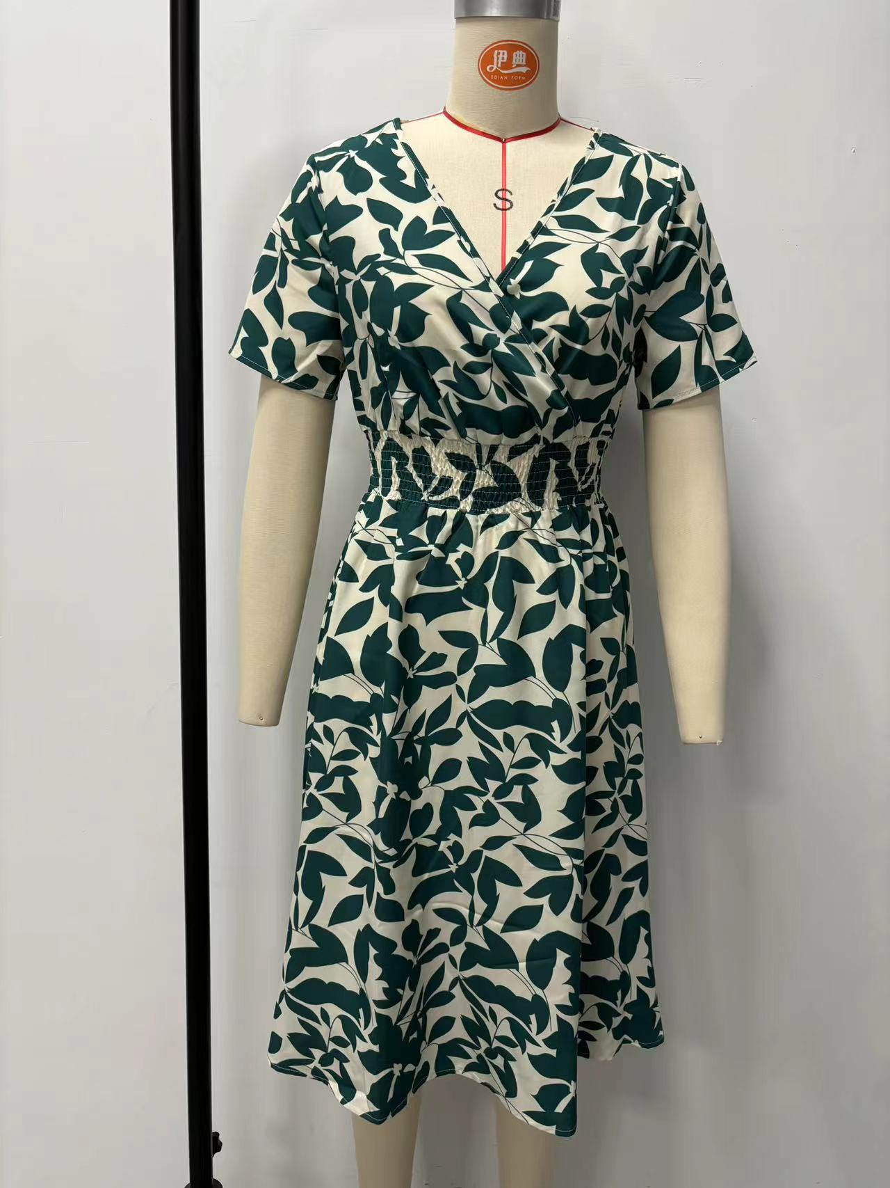 2024 Amazon Transfronterizo Europa y Estados Unidos Nuevo Vestido de Verano de Manga Corta con Cuello en V Estampado de Hojas Falda Grande Cintura