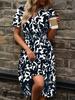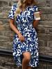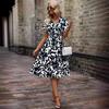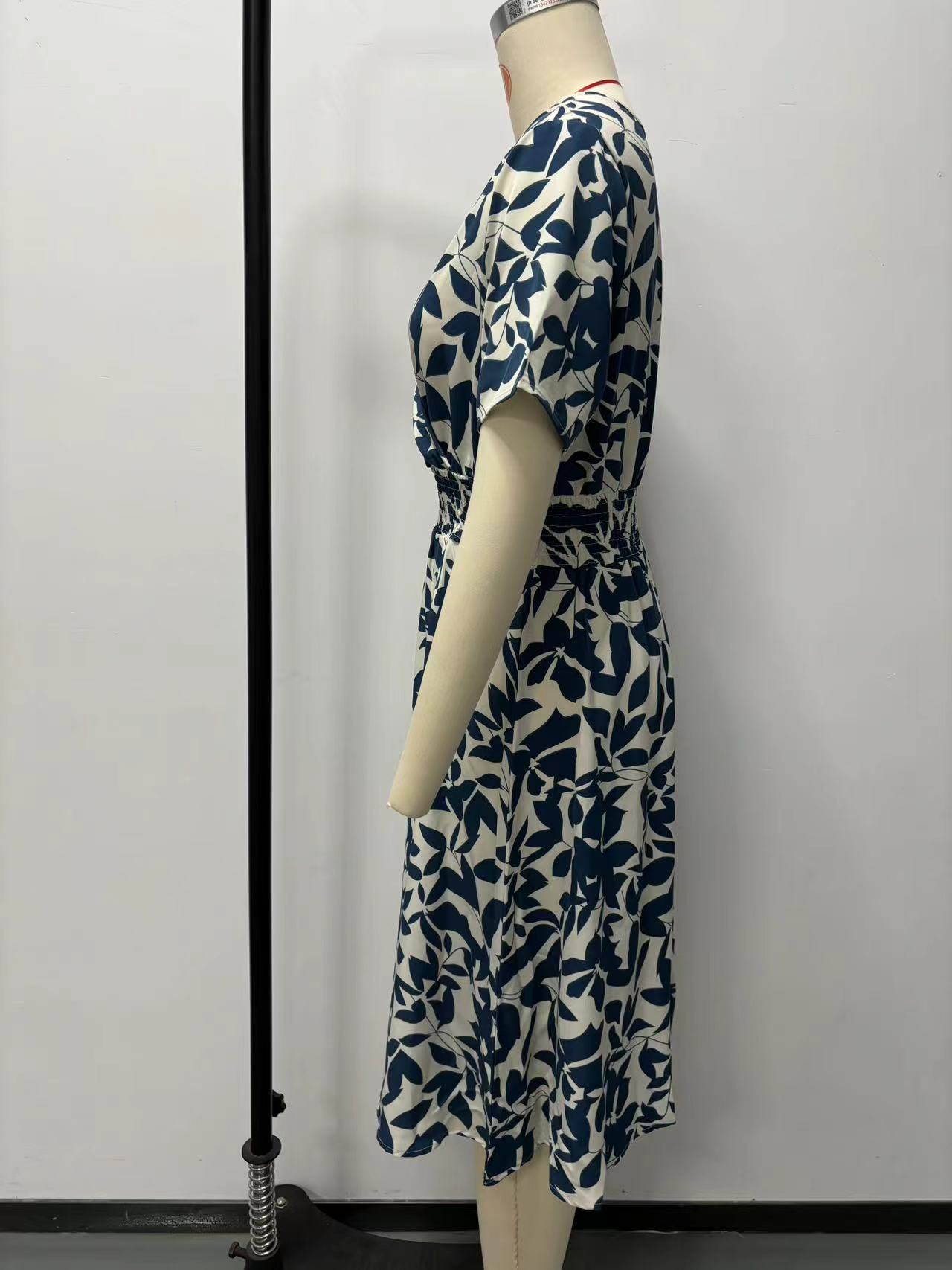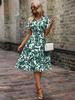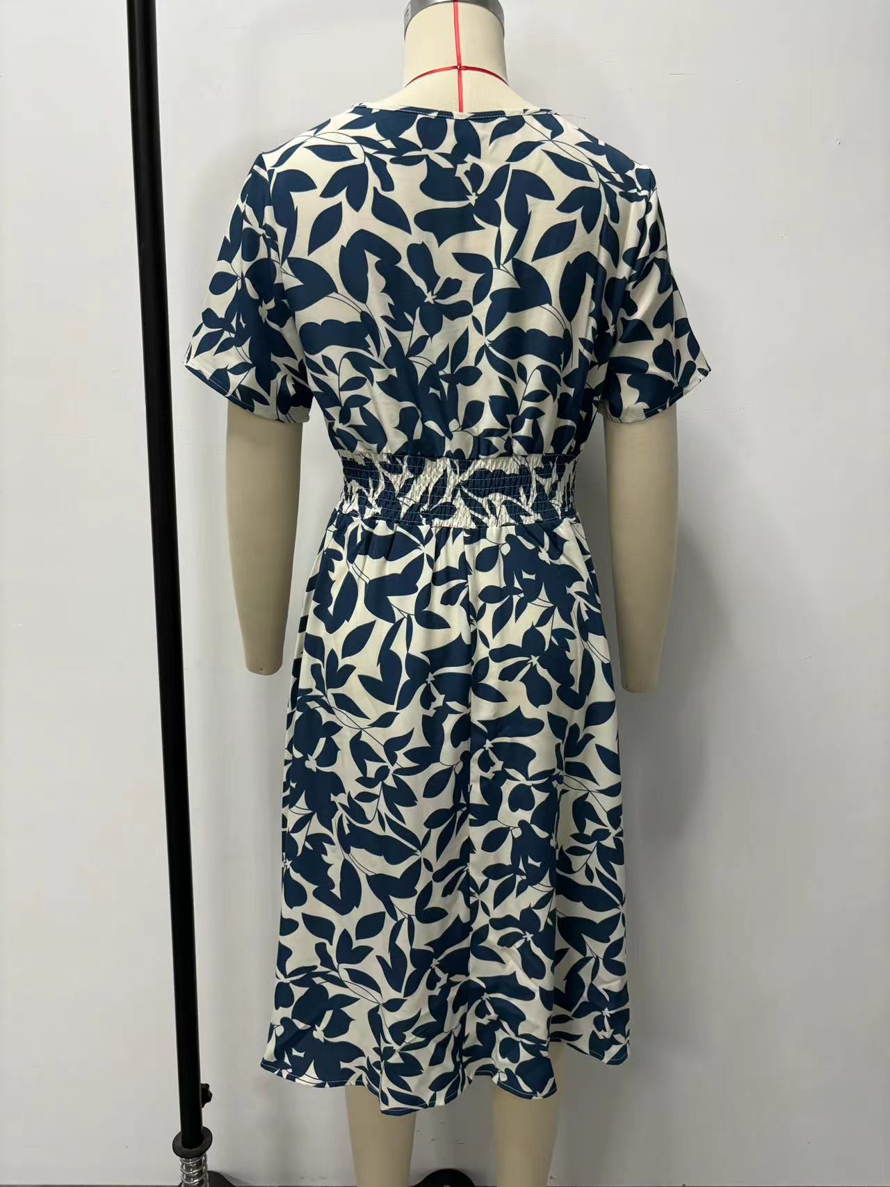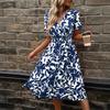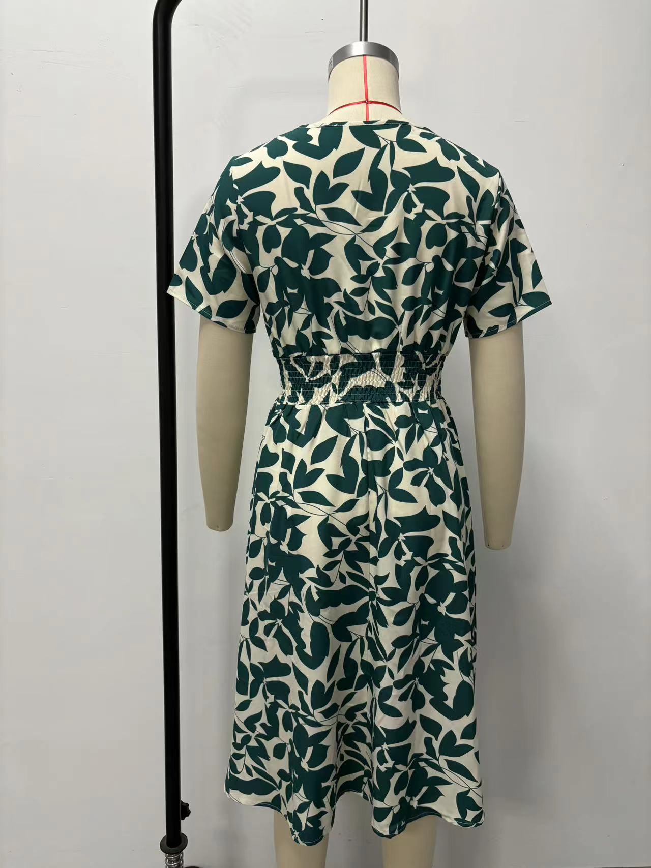 2024 Amazon Transfronterizo Europa y Estados Unidos Nuevo Vestido de Verano de Manga Corta con Cuello en V Estampado de Hojas Falda Grande Cintura