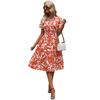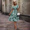 2024 Amazon Transfronterizo Europeo y Americano Nuevo Primavera y Verano Manga Corta Cuello en V Estampado de Hojas Falda Grande con Vuelo Vestido con Lazo en la Cintura
