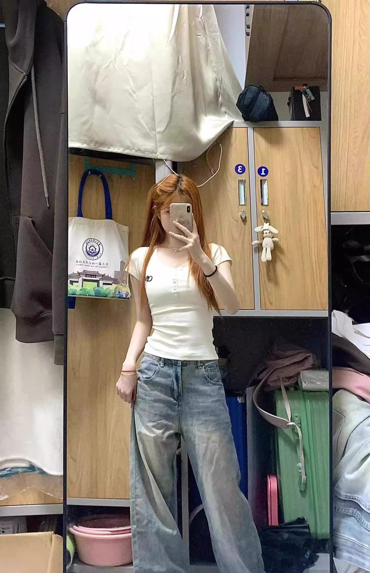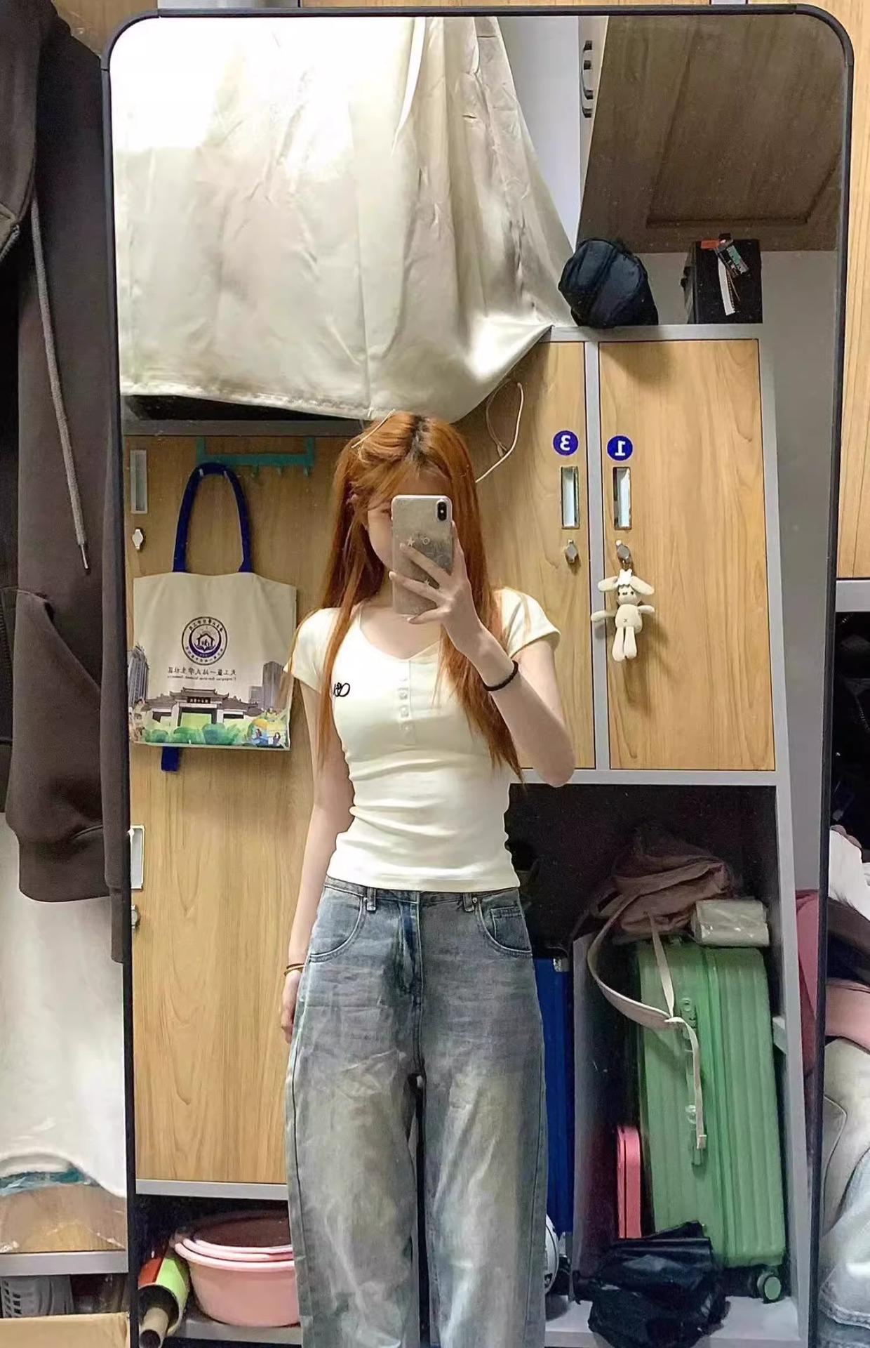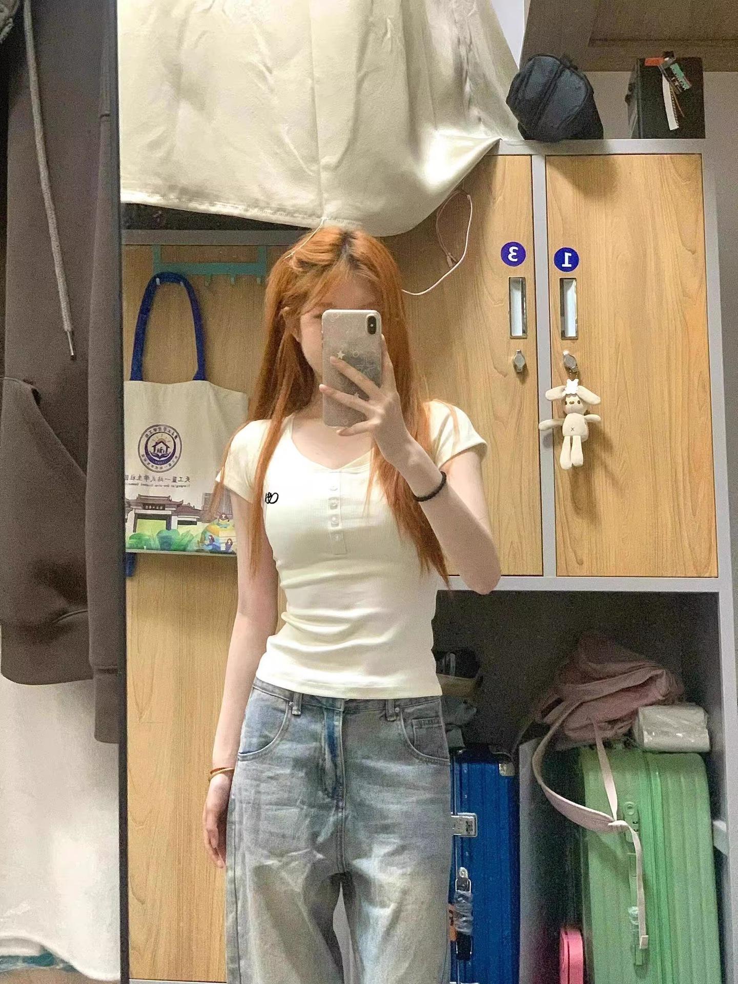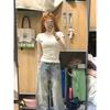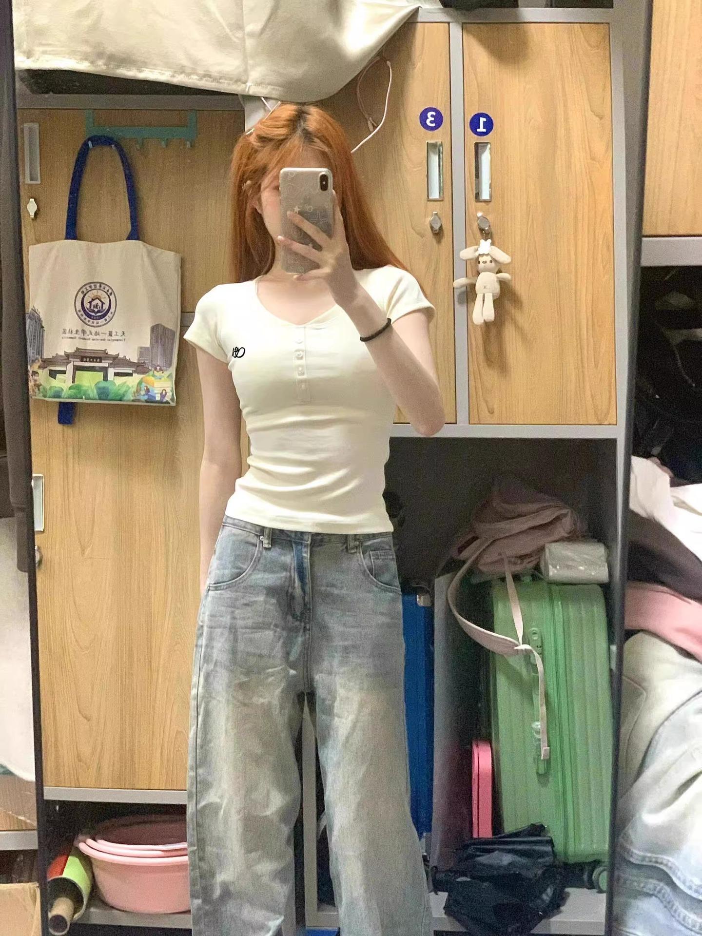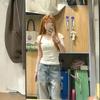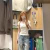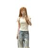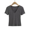 Playera de Manga Corta Acanalada Elástica de Nicho Moderna con Cuello en V para Mujer, Estilo Americano de Verano, Ajuste Entallado, Top Favorecedor