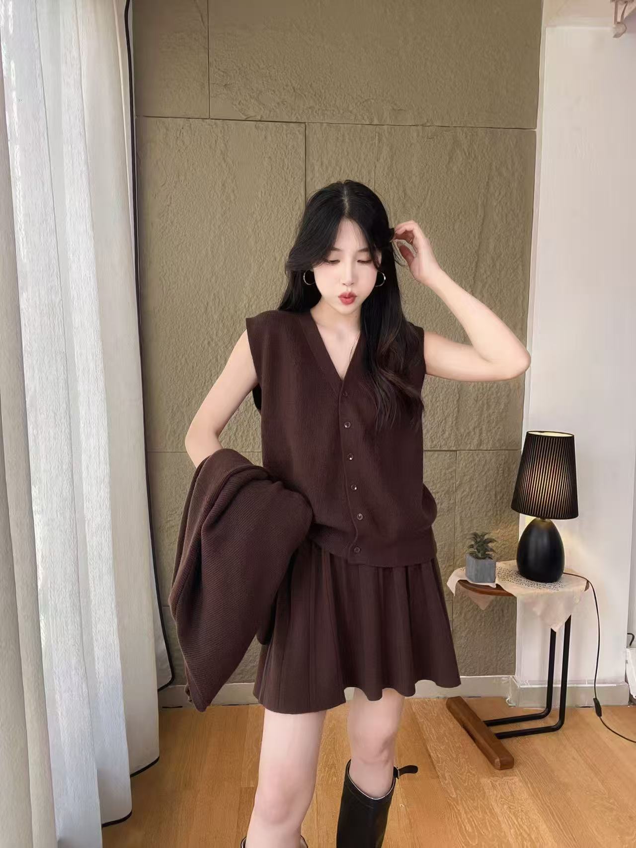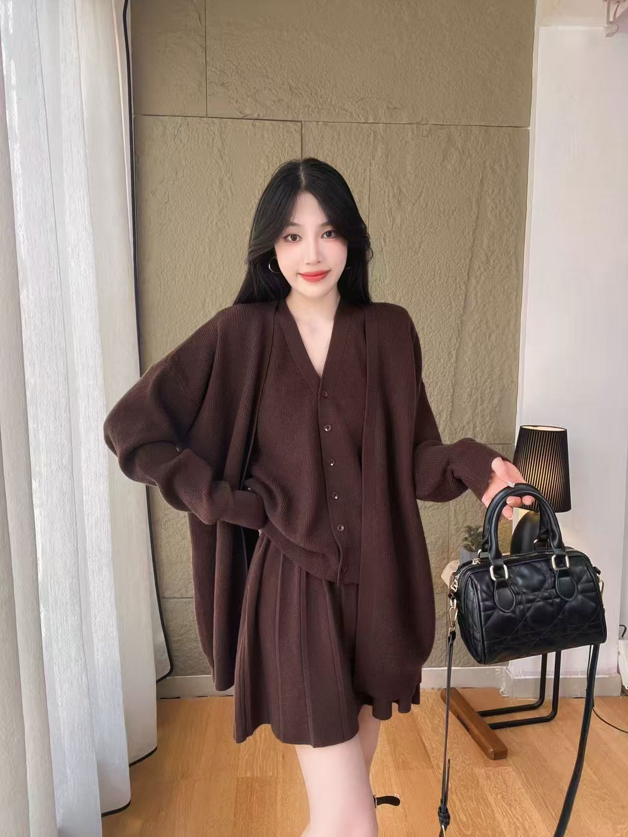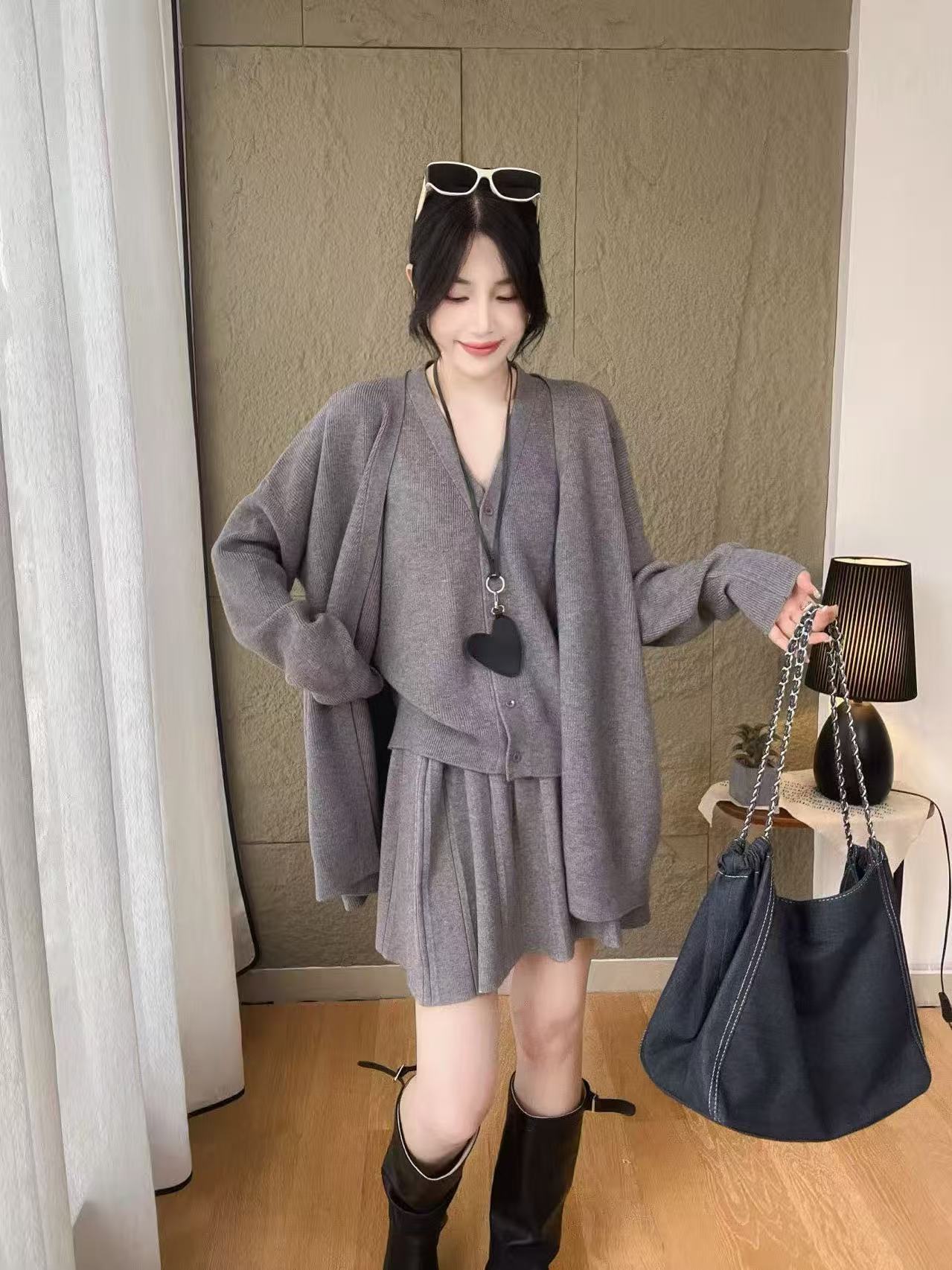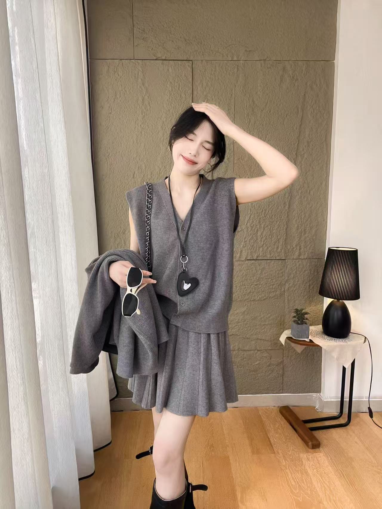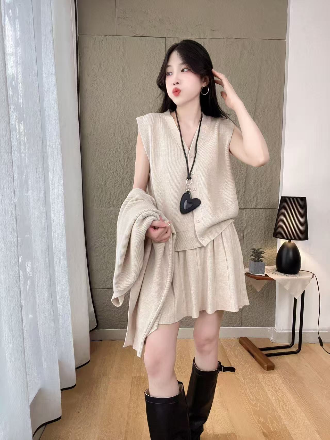 Conjunto de Mujer Otoño e Invierno Nuevo Producto Chaleco Suéter Falda Midi Estilo Perezoso Moda Reductor de Edad Cárdigan de Punto Abrigo Conjunto de Tres Piezas