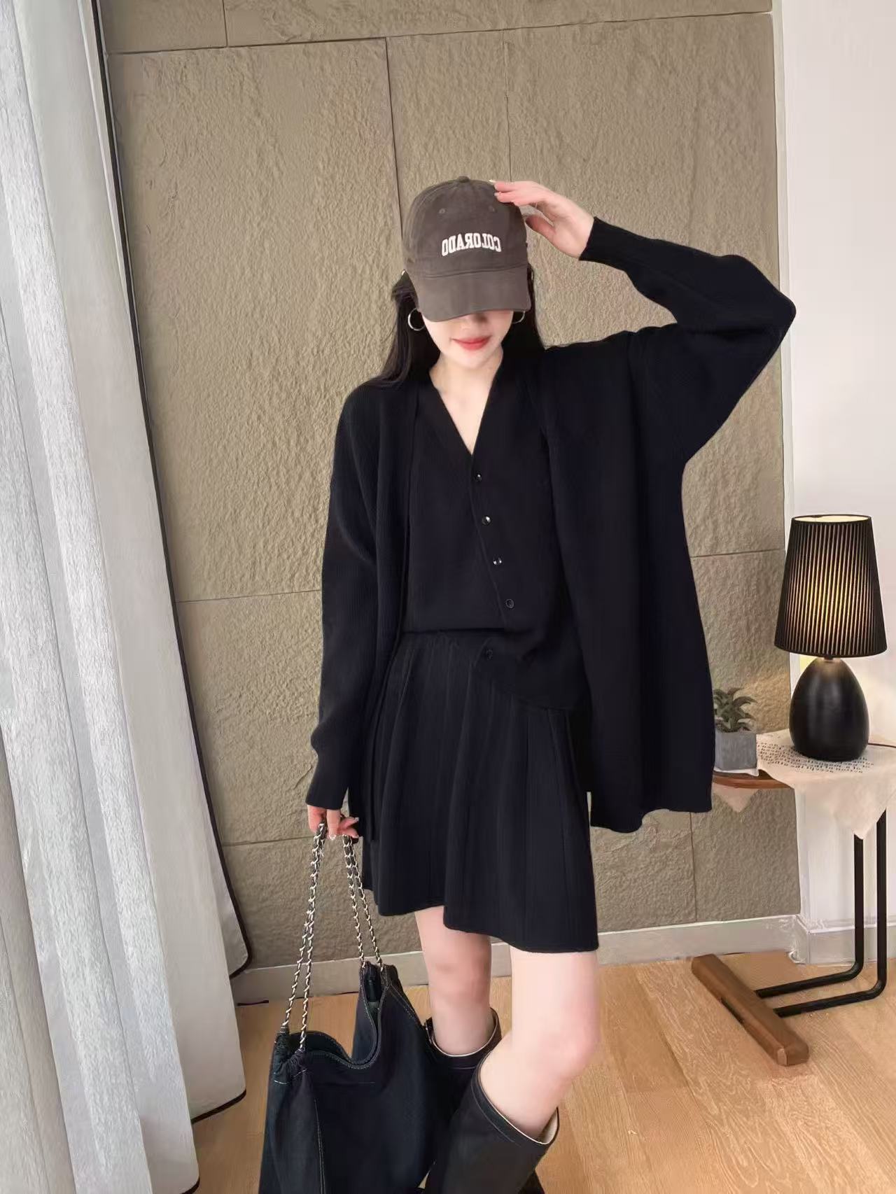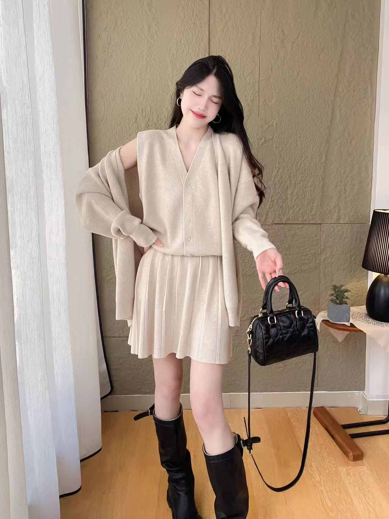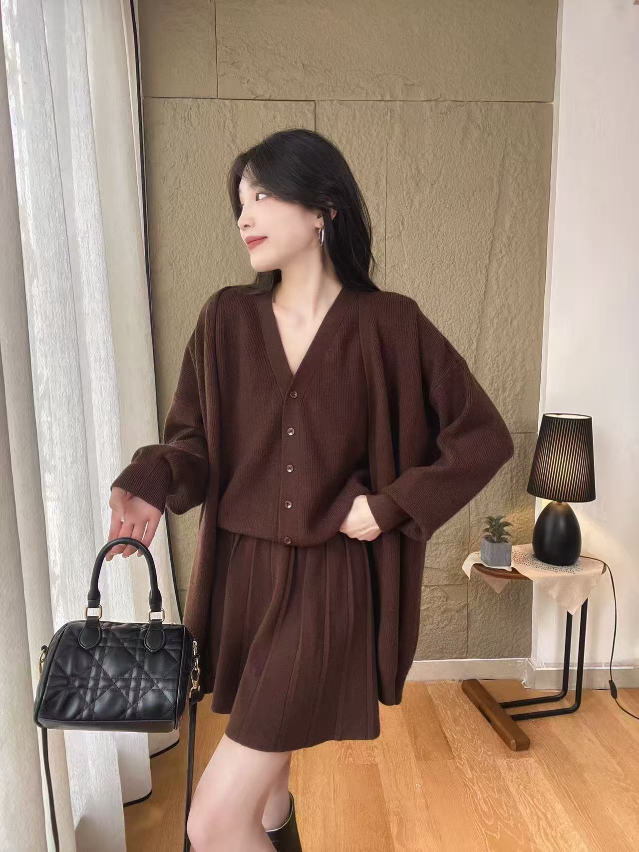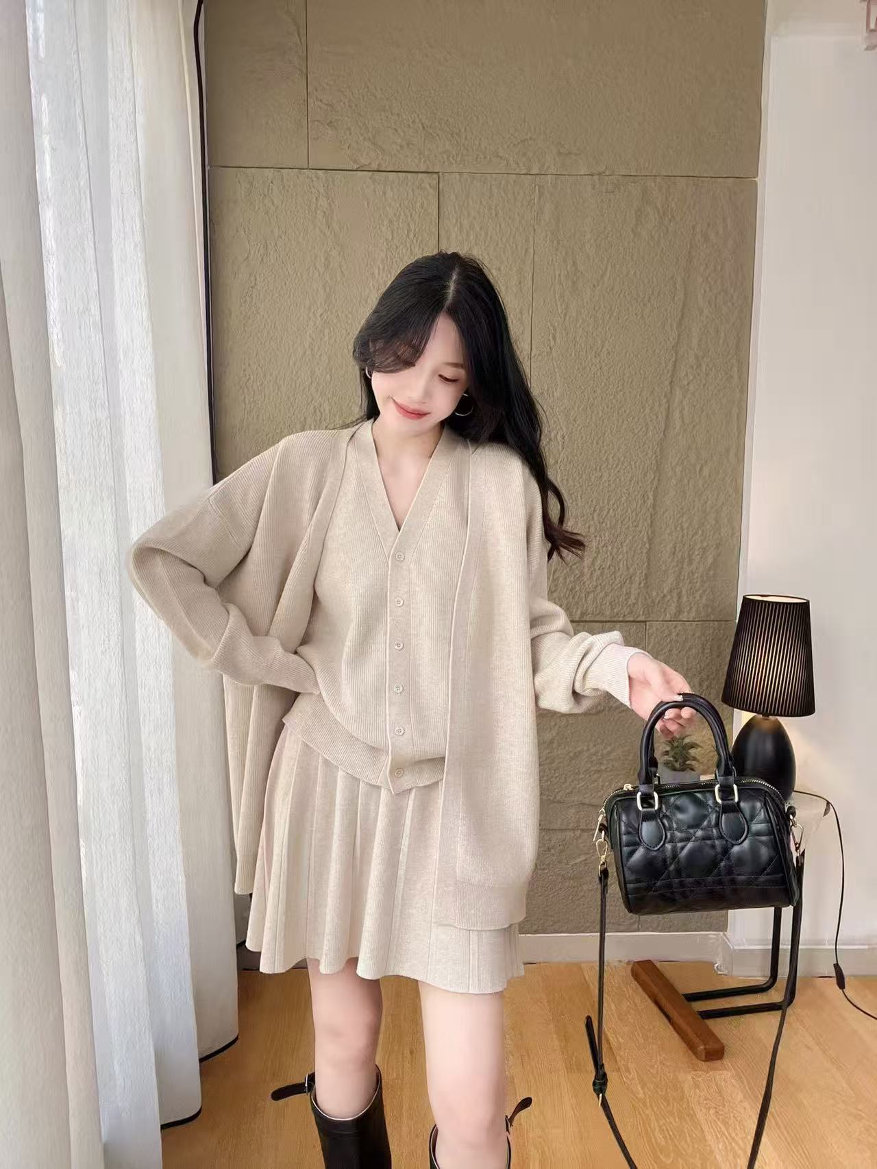 Conjunto de Mujer Otoño e Invierno Nuevo Producto Chaleco Suéter Falda Midi Estilo Perezoso Moda Reductor de Edad Cárdigan de Punto Abrigo Conjunto de Tres Piezas