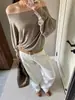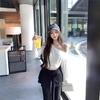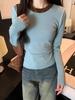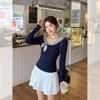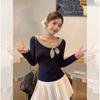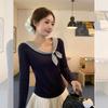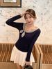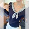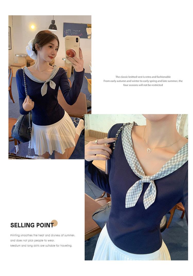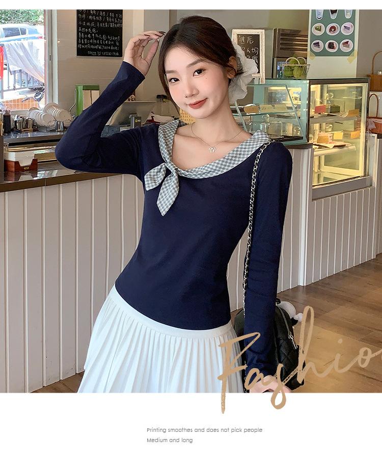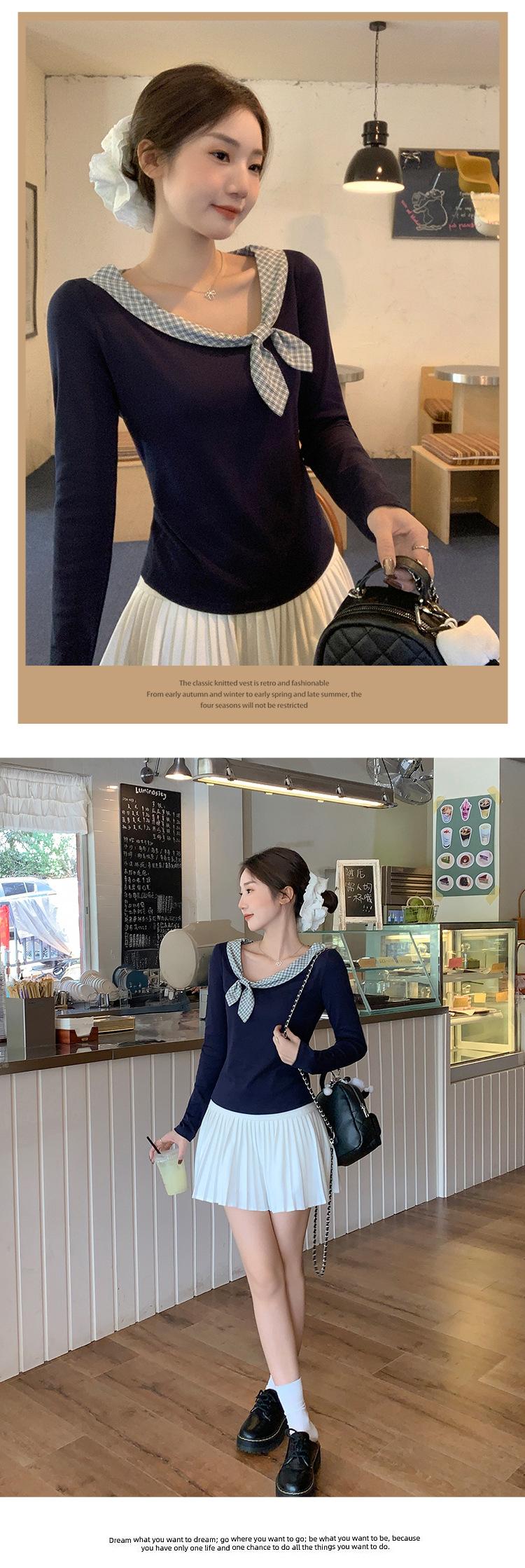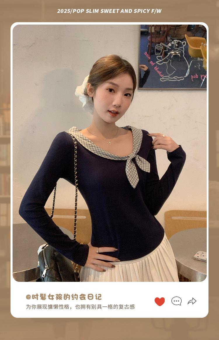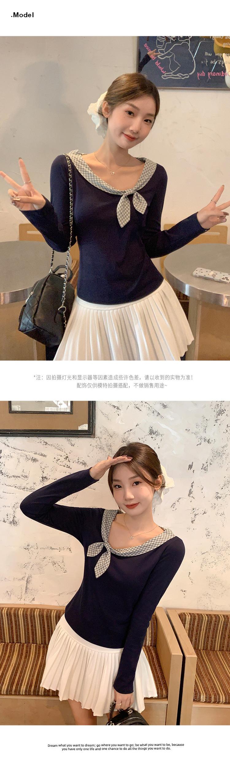 Camiseta de Manga Larga con Lazo Francés a Cuadros, Cuello Inclinado, Hombro Regular, para Mujer, Principios de Otoño, Nicho, Bloque de Color, Top Adelgazante