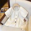 Sentido del Diseño Azul Volante Rayado Manga Abullonada Verano Nicho Reductor de Edad Cuello en V Cintura Entallada Manga Corta Top Dulce y Picante