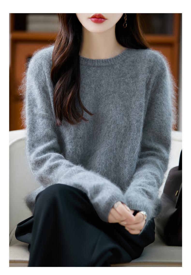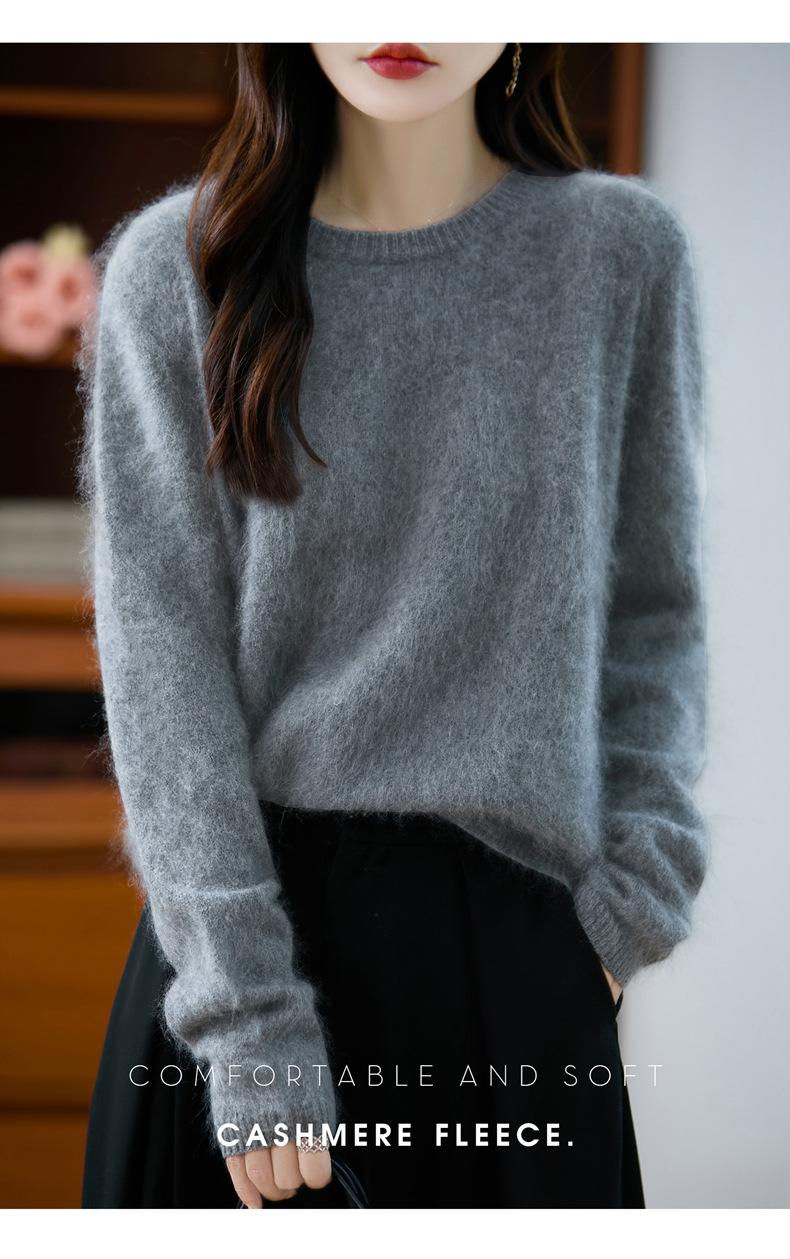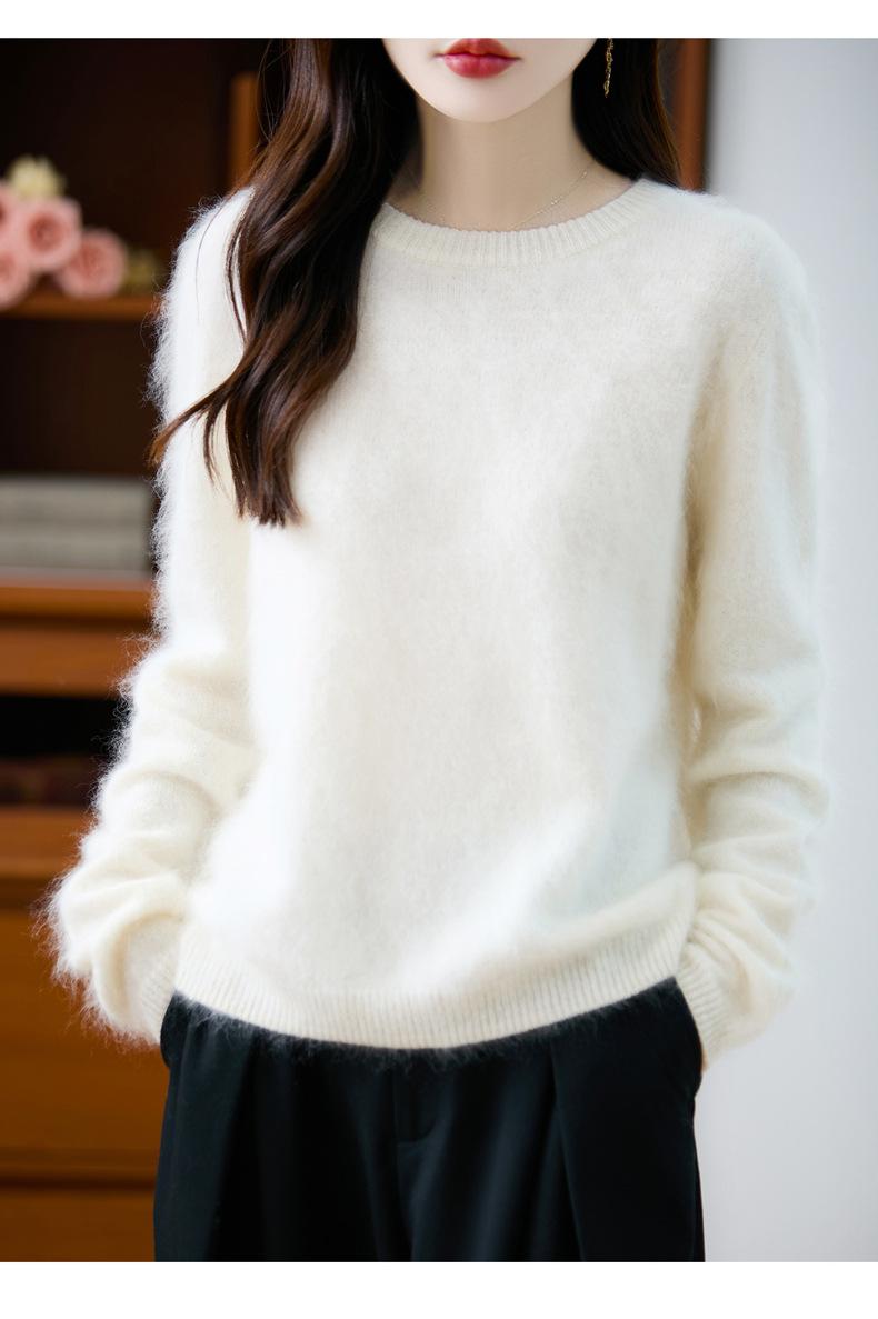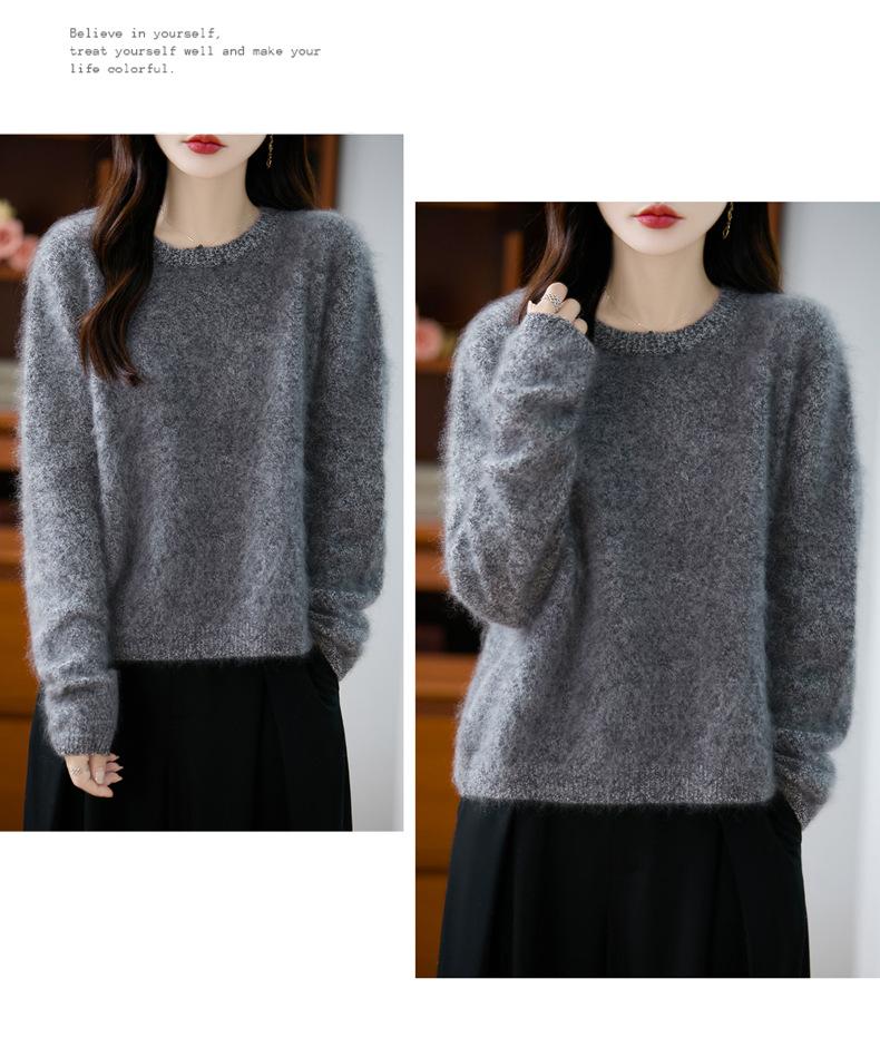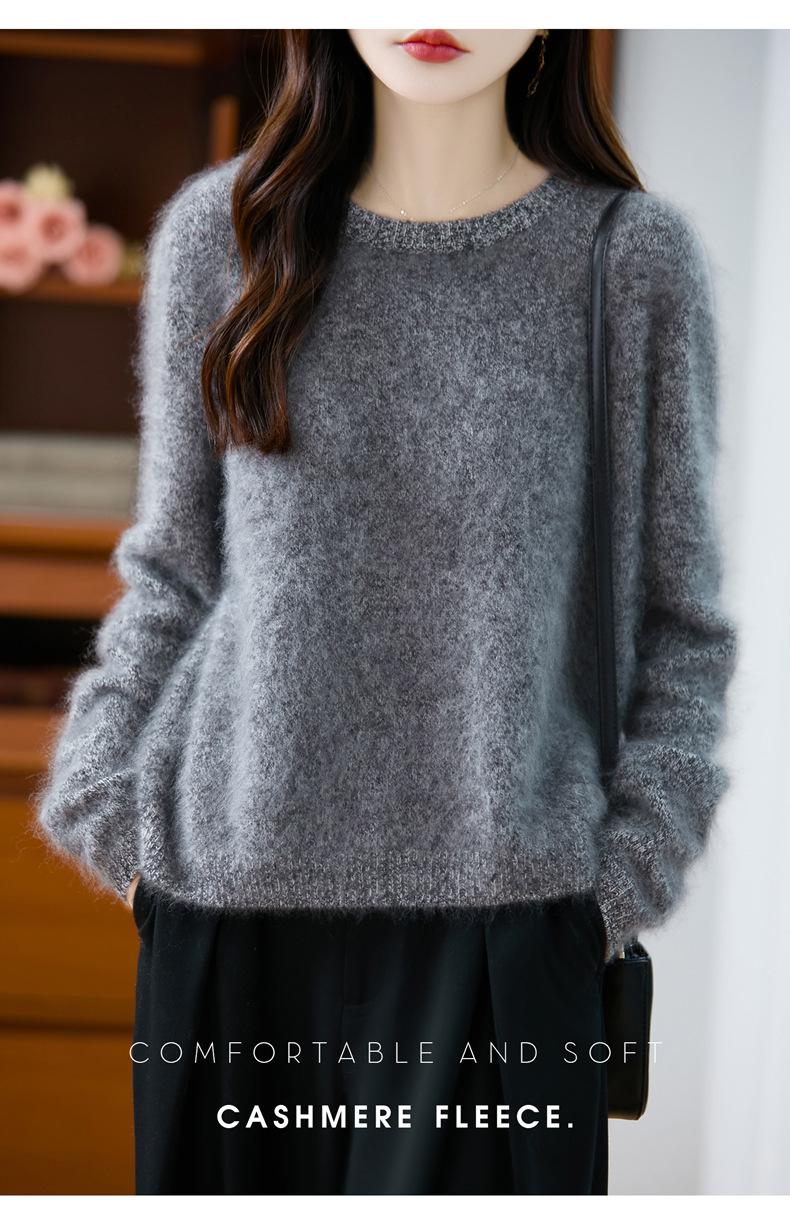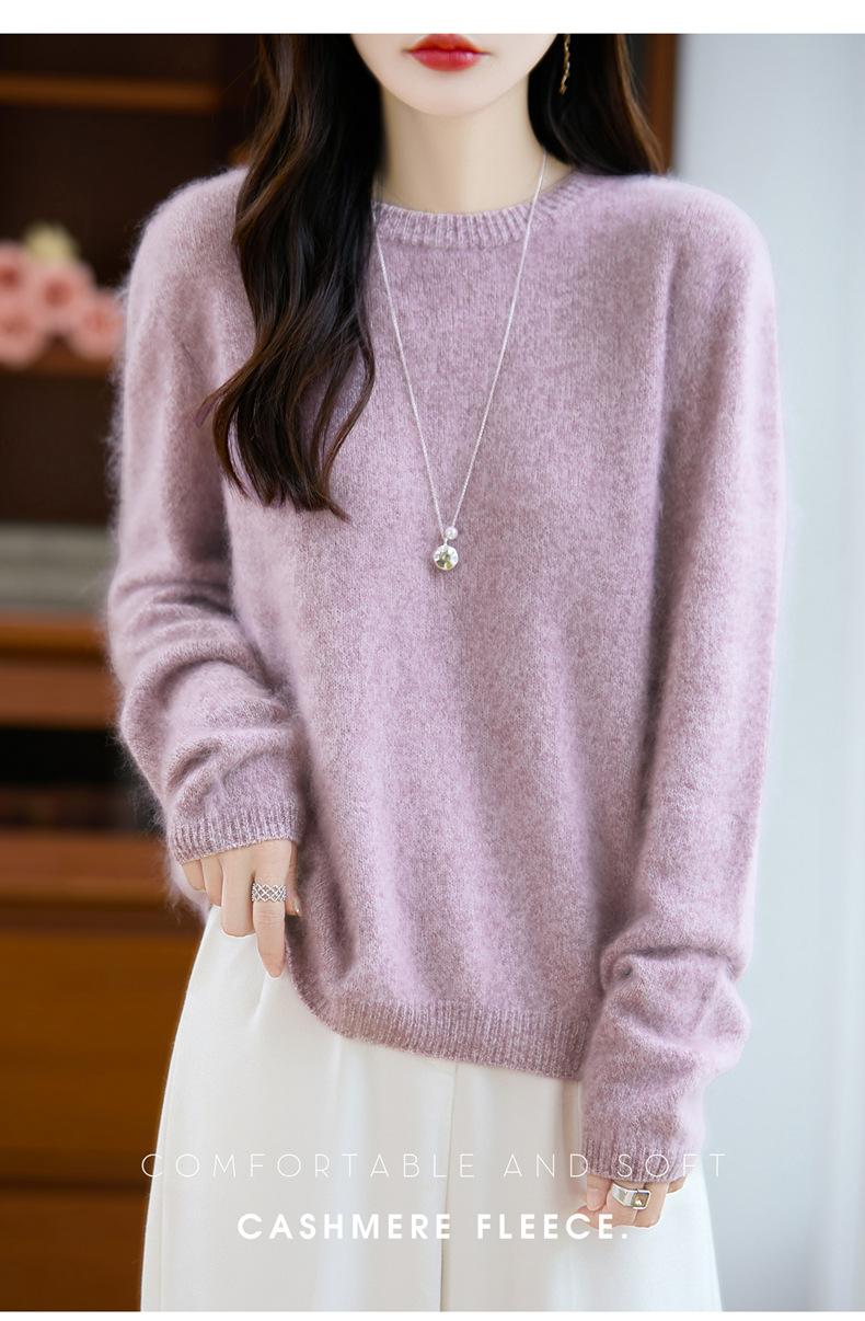 Suéter de Punto Grueso de Siete Agujas de Color Sólido Cómodo Suave 100% Lana Pura Cepillado Otoño e Invierno Nuevo Jersey de Cuello Redondo para Mujer Capa Base