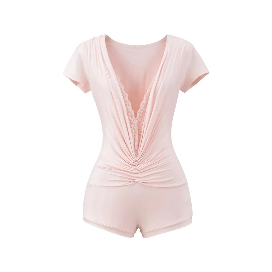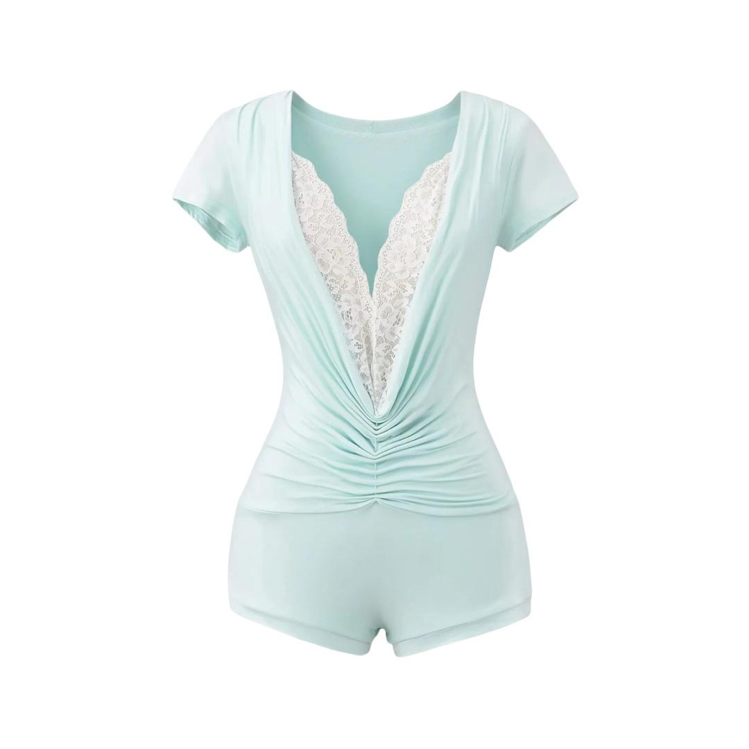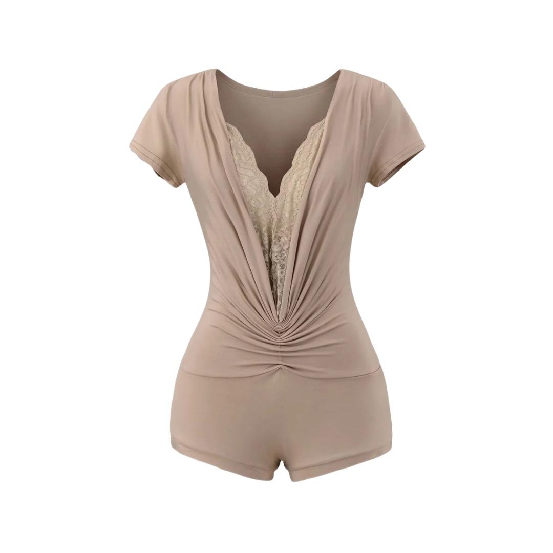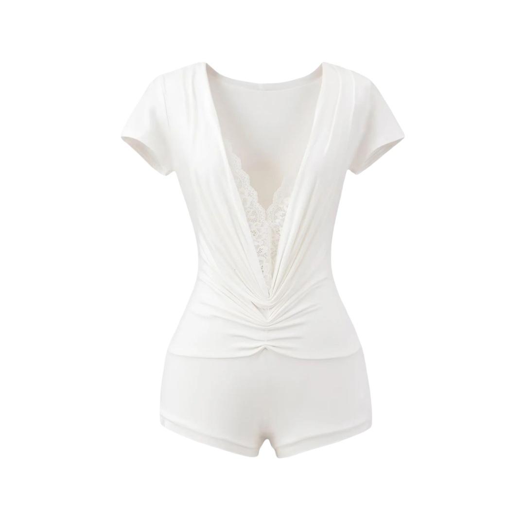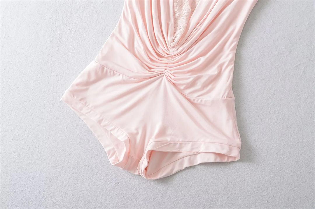 Mono de Manga Corta con Escote en V Profundo Estilo Europeo y Americano con Encaje Empalmado para Mujer Nicho Slim Pecho Plisado Camiseta Top