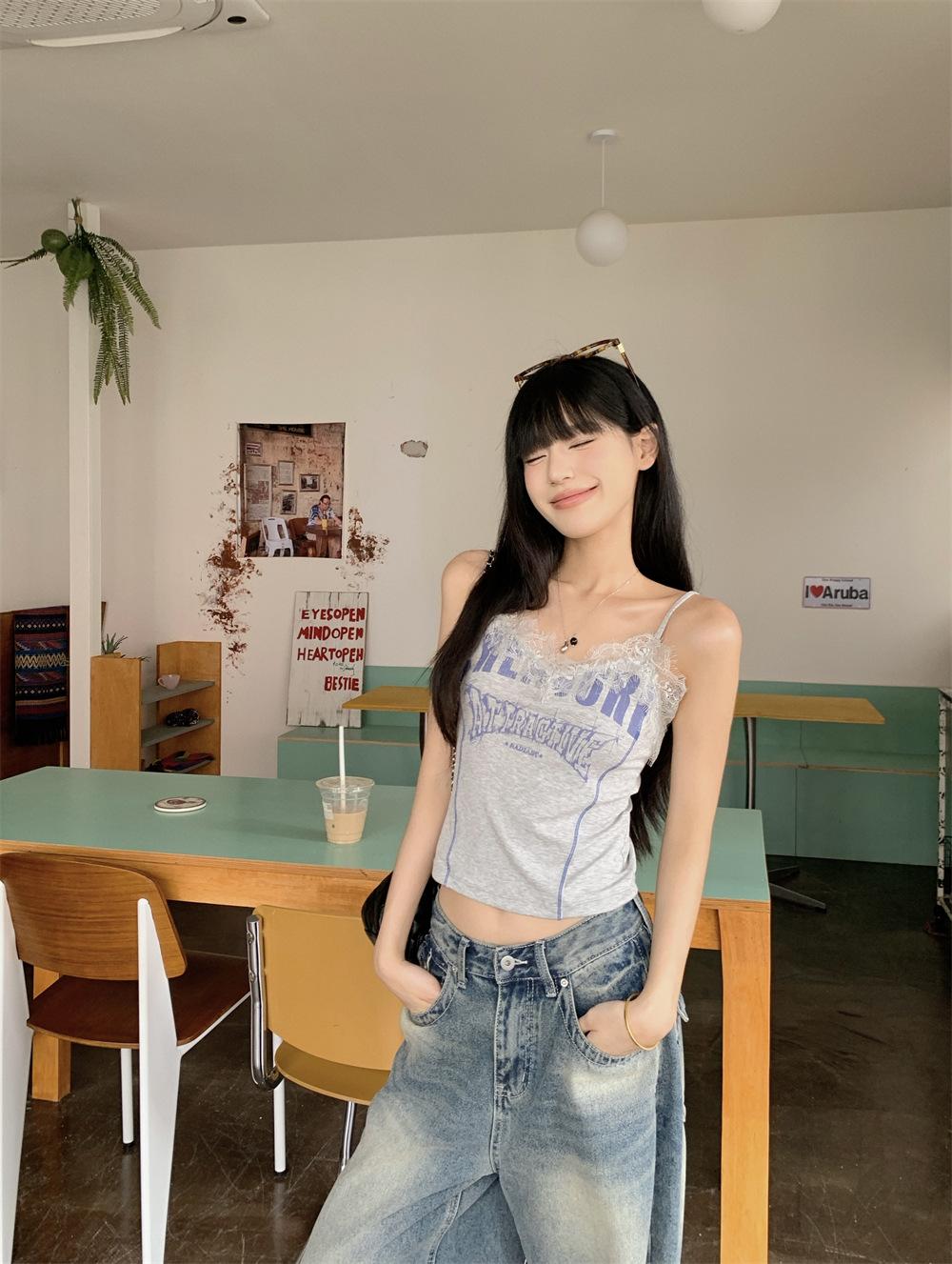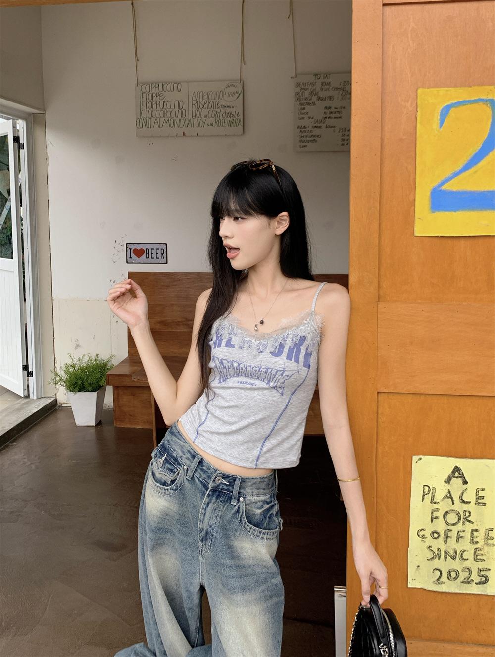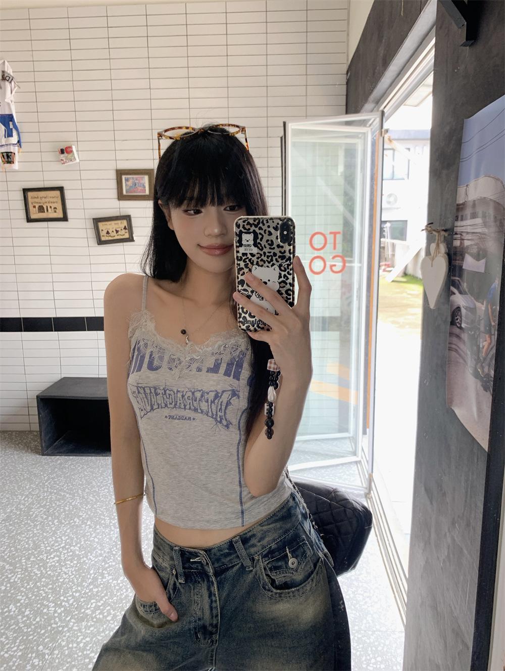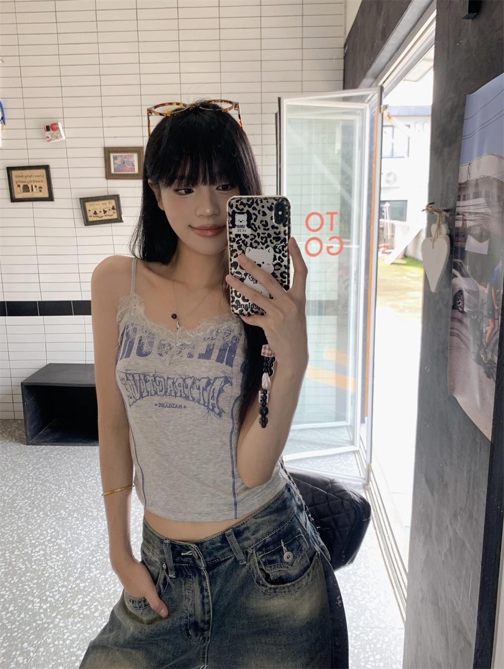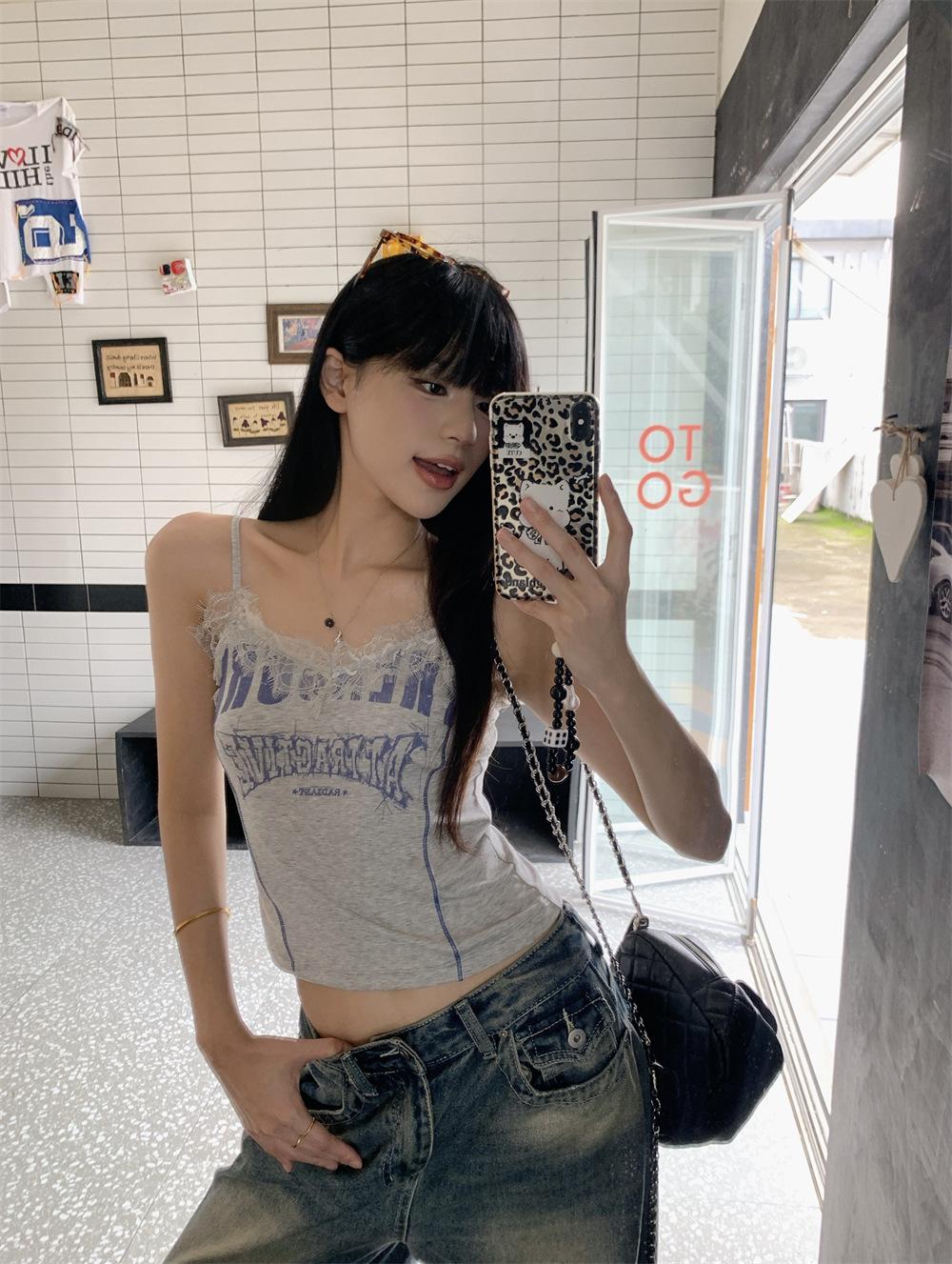 2025 Nuevo Verano Estampado de Contraste Encaje Empalmado Slim Ropa Exterior Moda Versátil Camisola Corta Ropa de Mujer