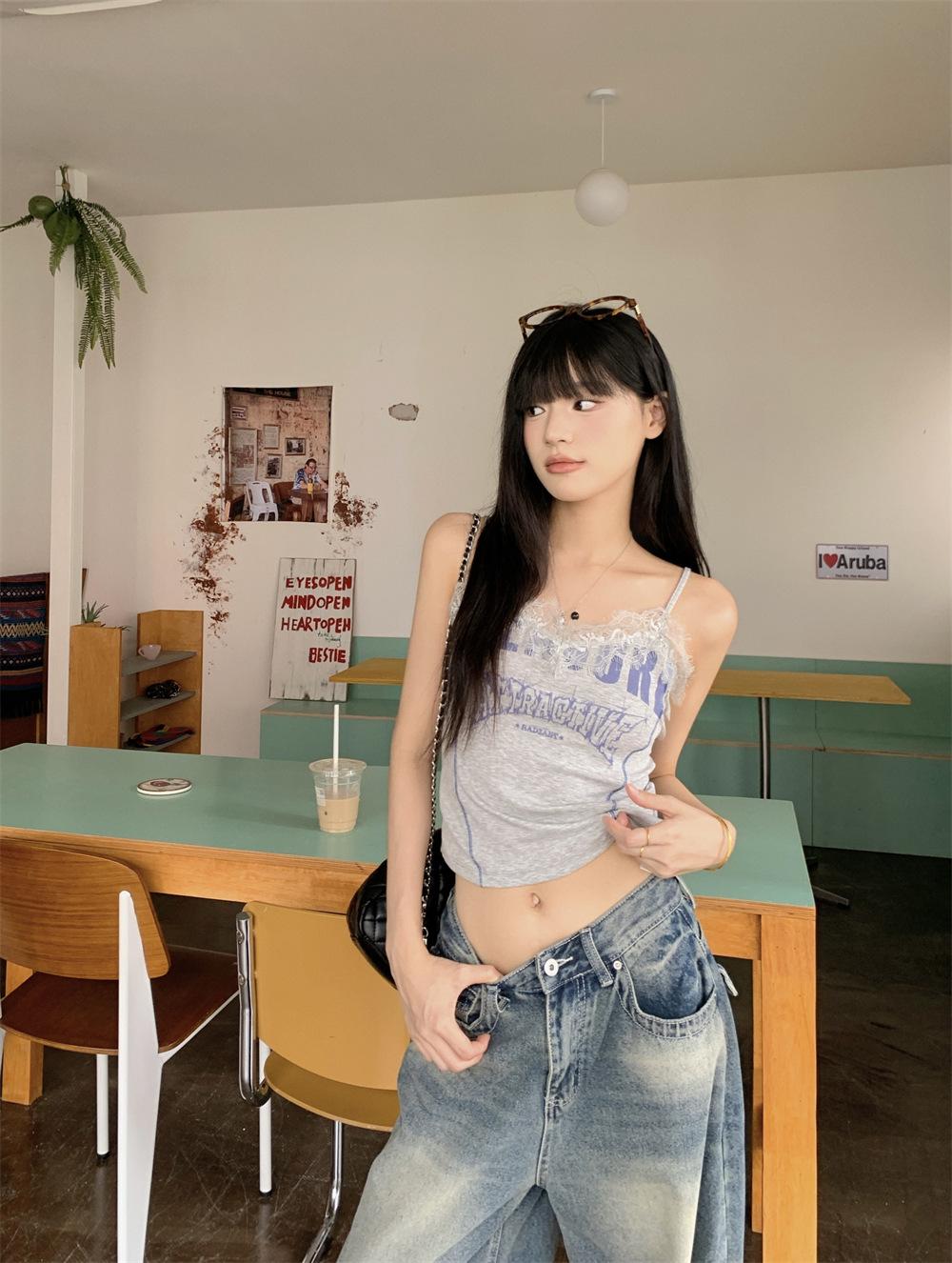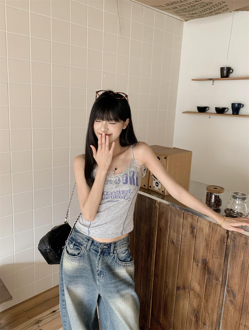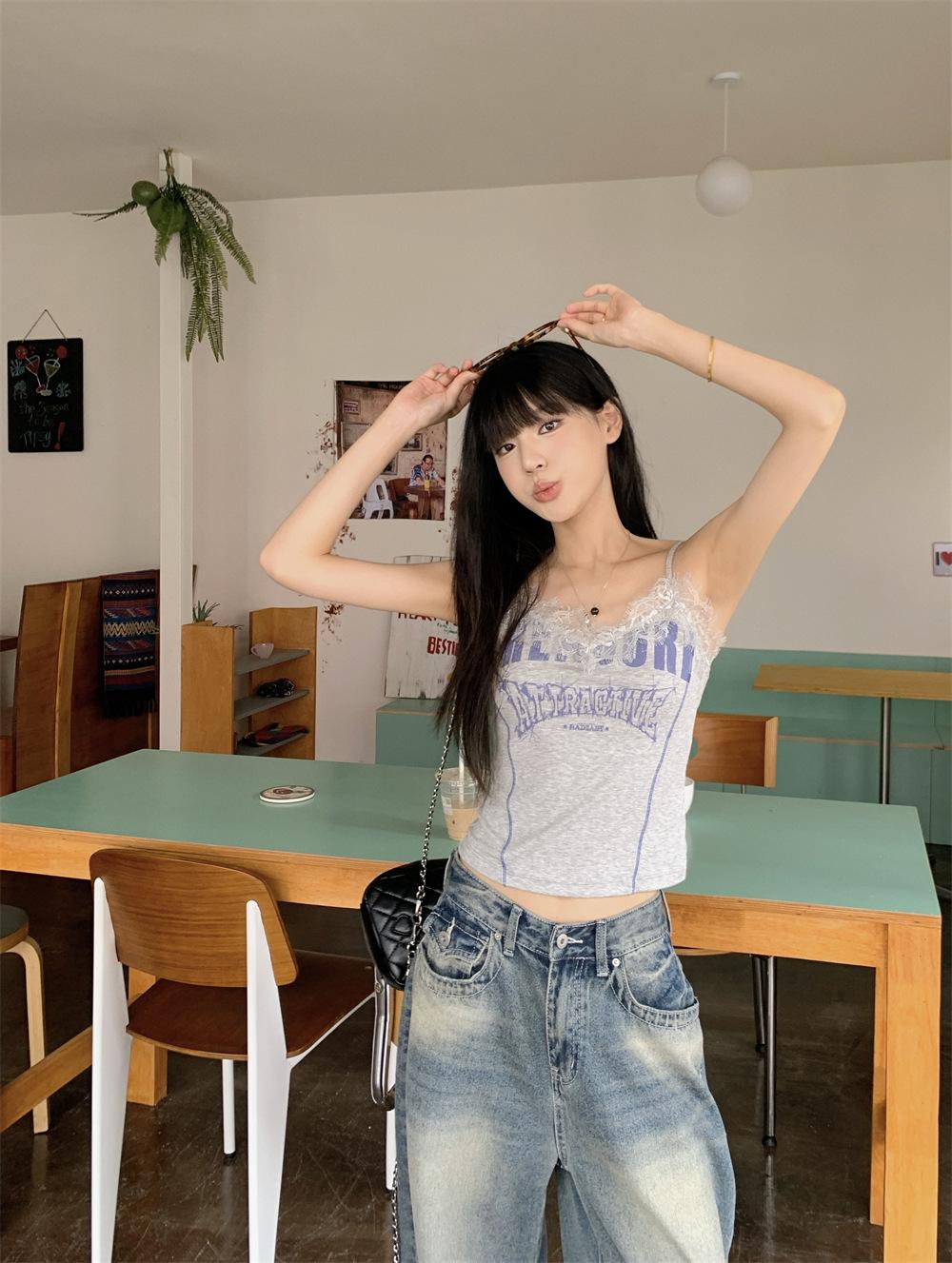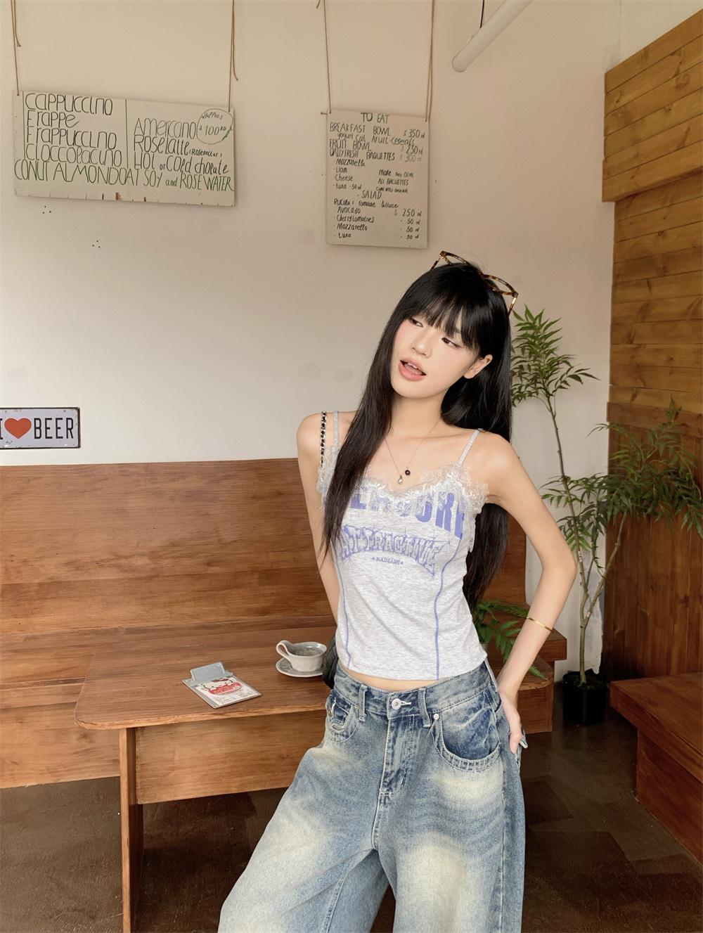 2025 Nuevo Verano Estampado de Contraste Encaje Empalmado Slim Ropa Exterior Moda Versátil Camisola Corta Ropa de Mujer