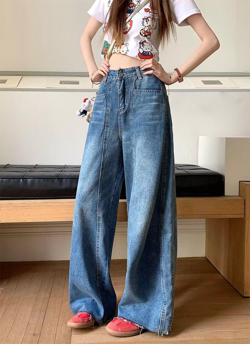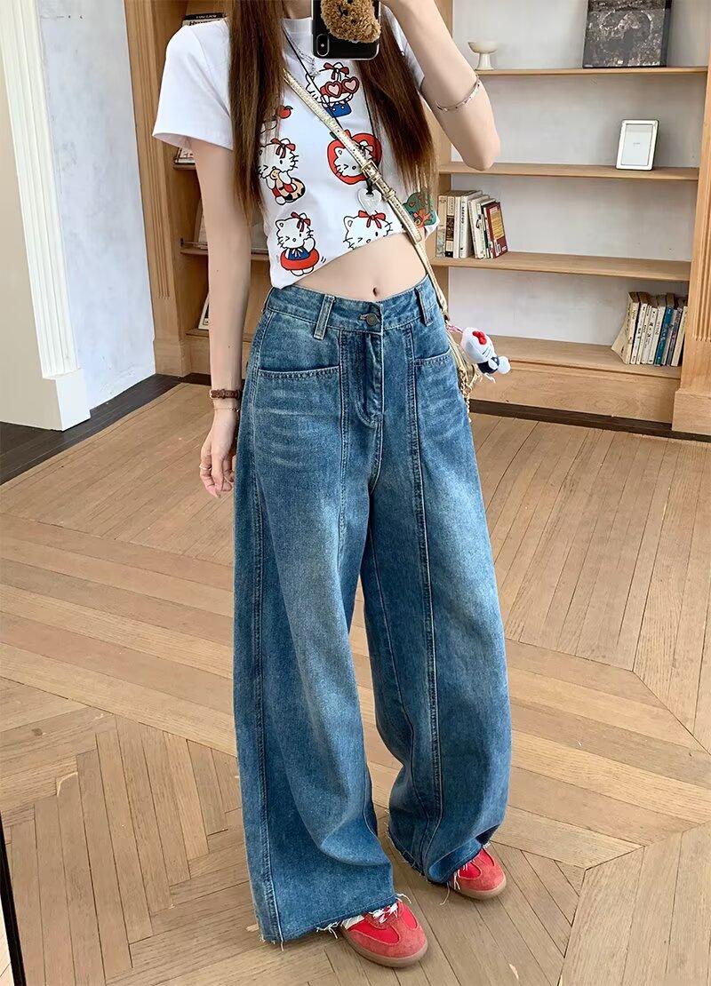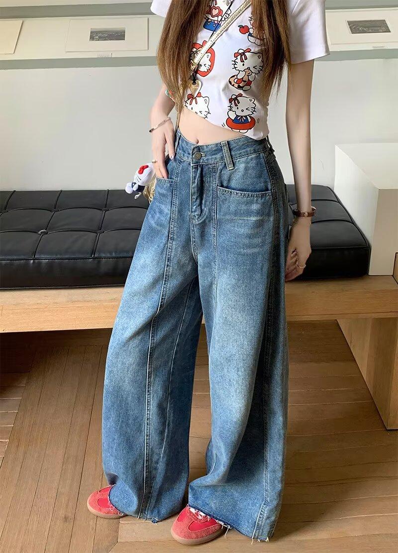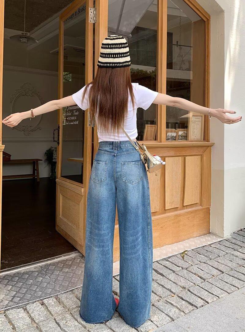 Jeans Retro Azules de Talla Grande para Mujer en Primavera y Verano Cuerpo Gordo mm Forma de Pera Sueltos Cintura Alta Slim Rectos Pierna Ancha