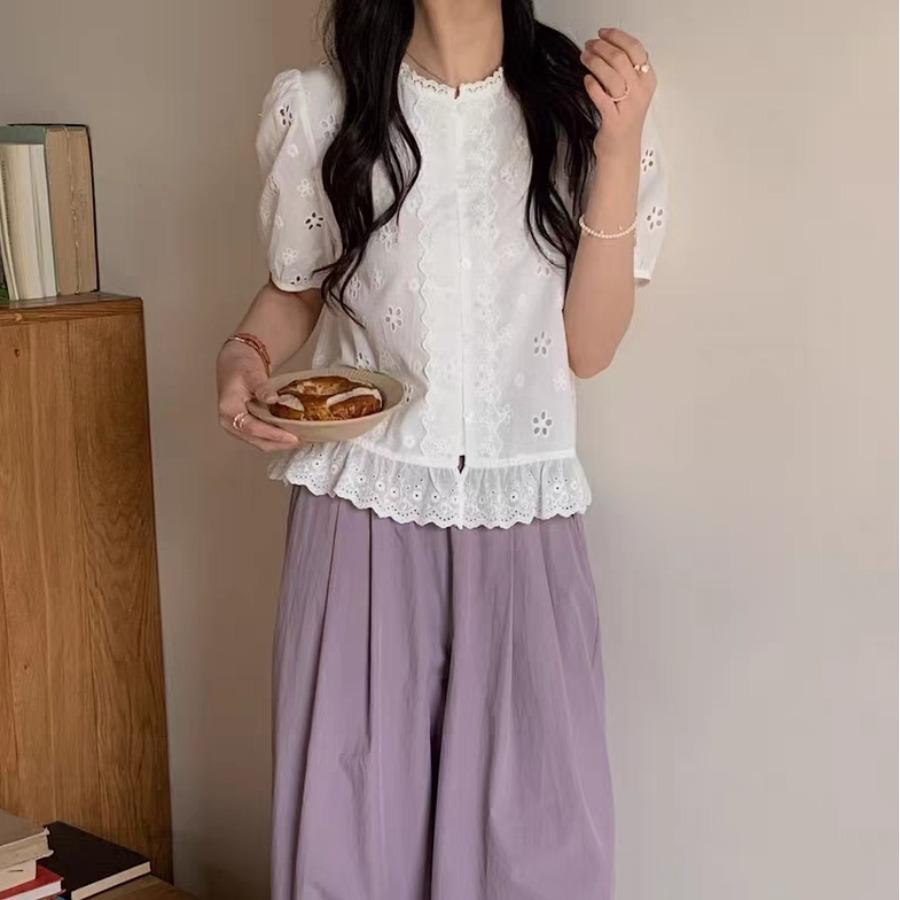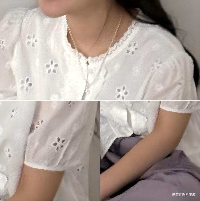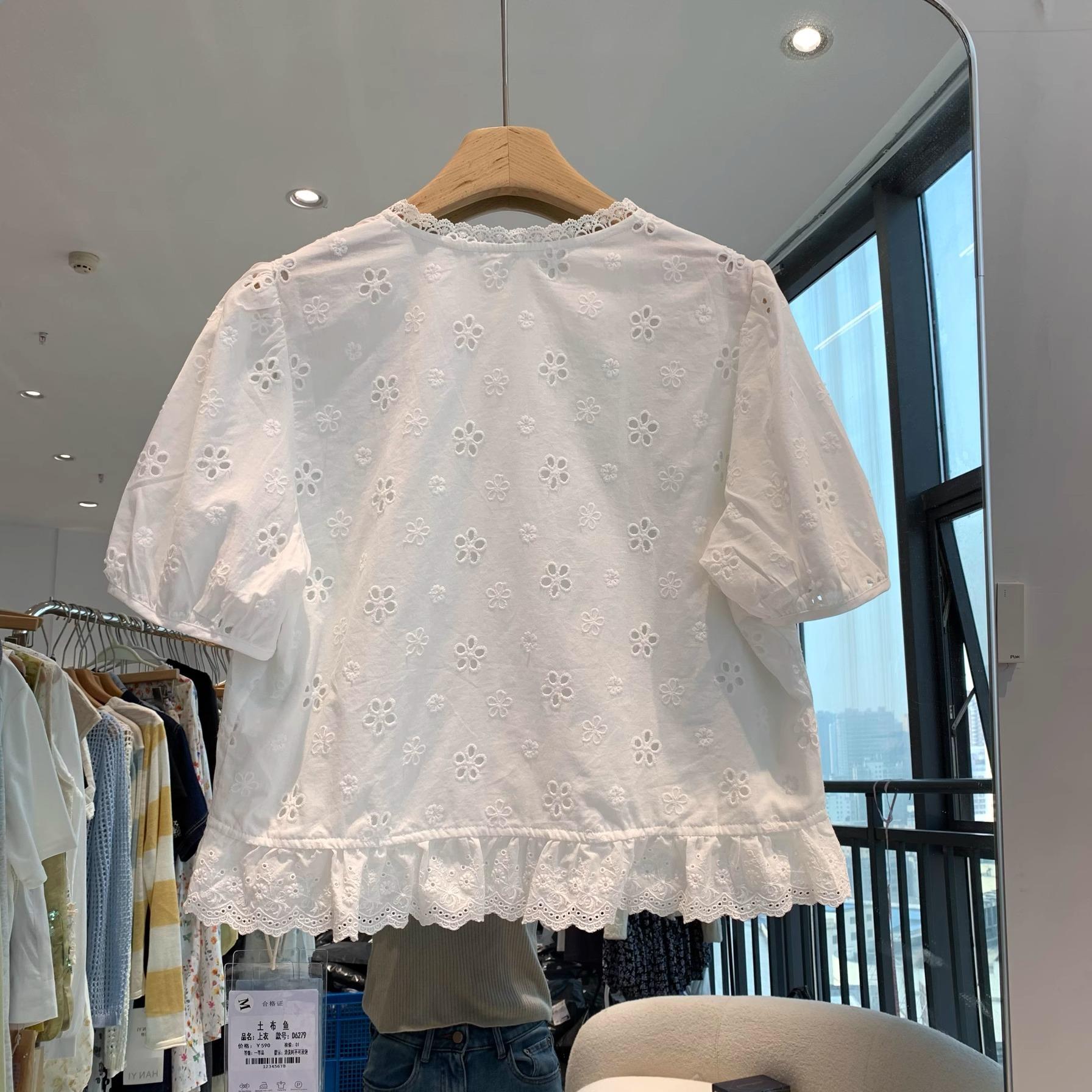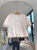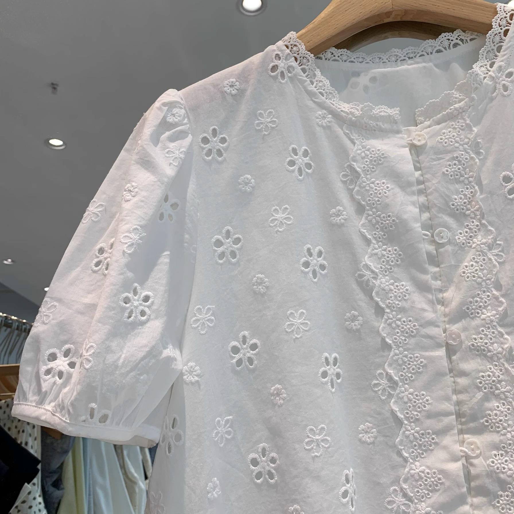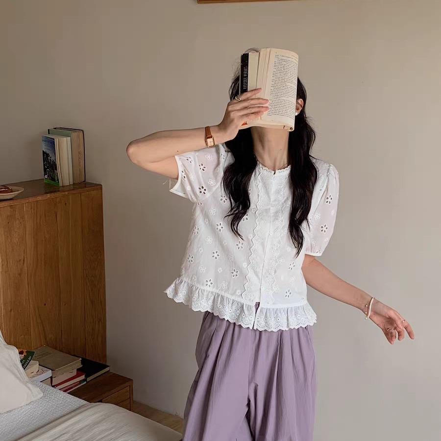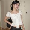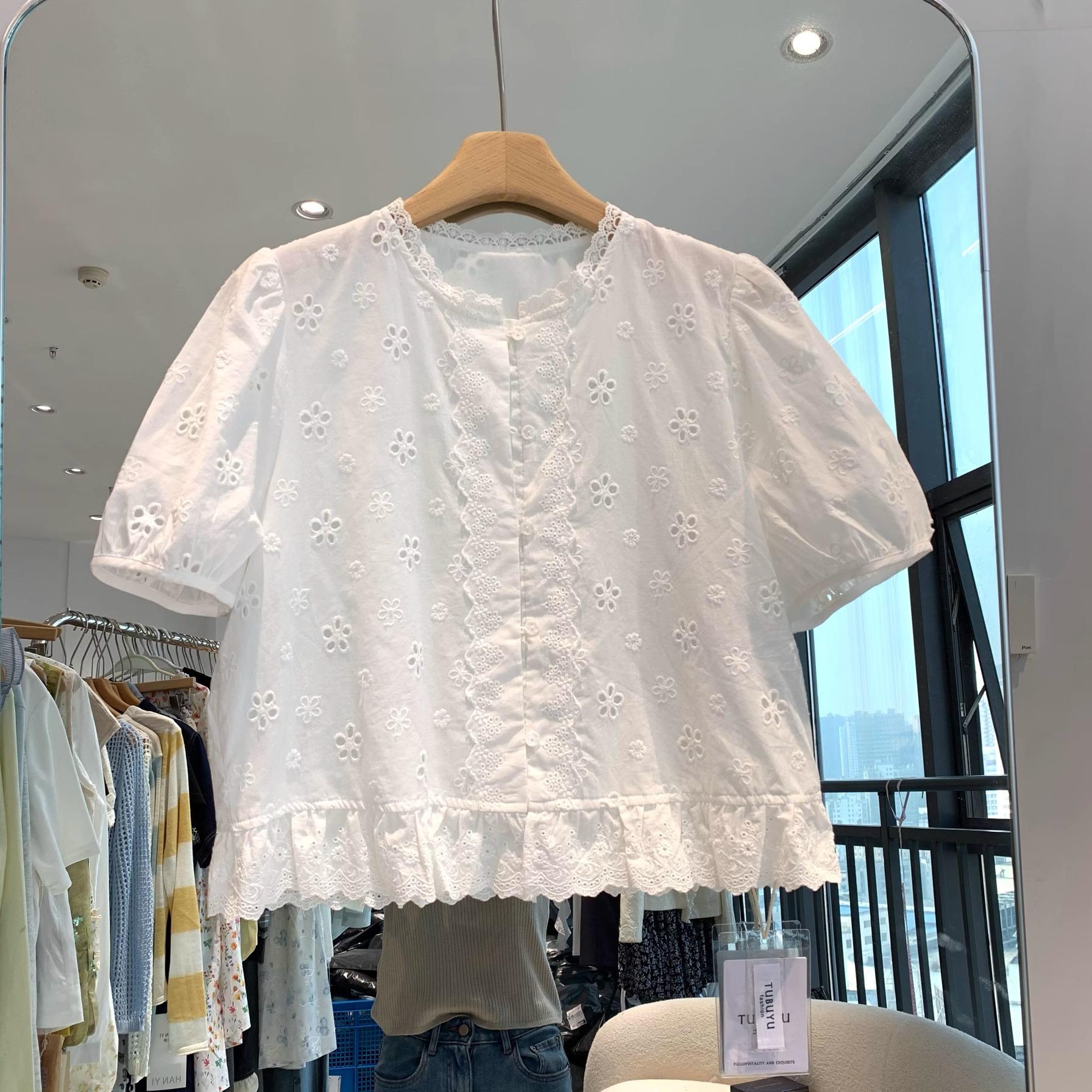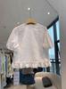 Camisa de Manga Corta con Encaje Crochet Dulce Chic Estilo Coreano para Mujer Verano 2025 Nuevo