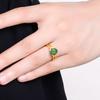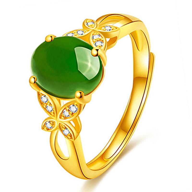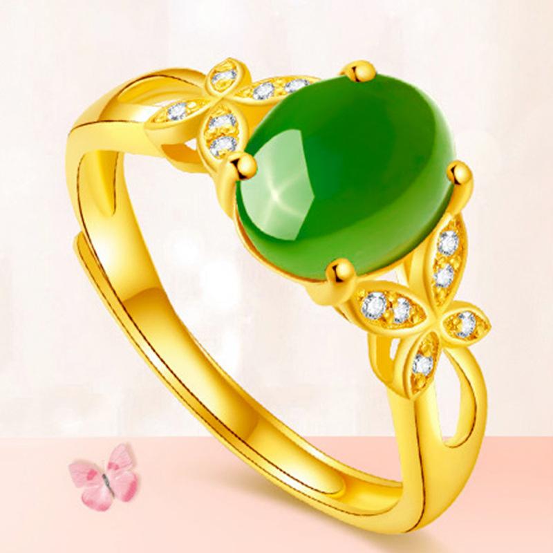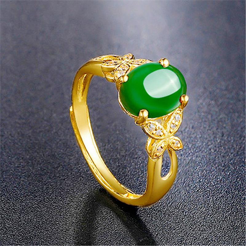 Anillo de esmeralda natural bañado en oro con diseño de mariposa y flor de amor, con jaspe hetiano, ideal para bodas y bailes.