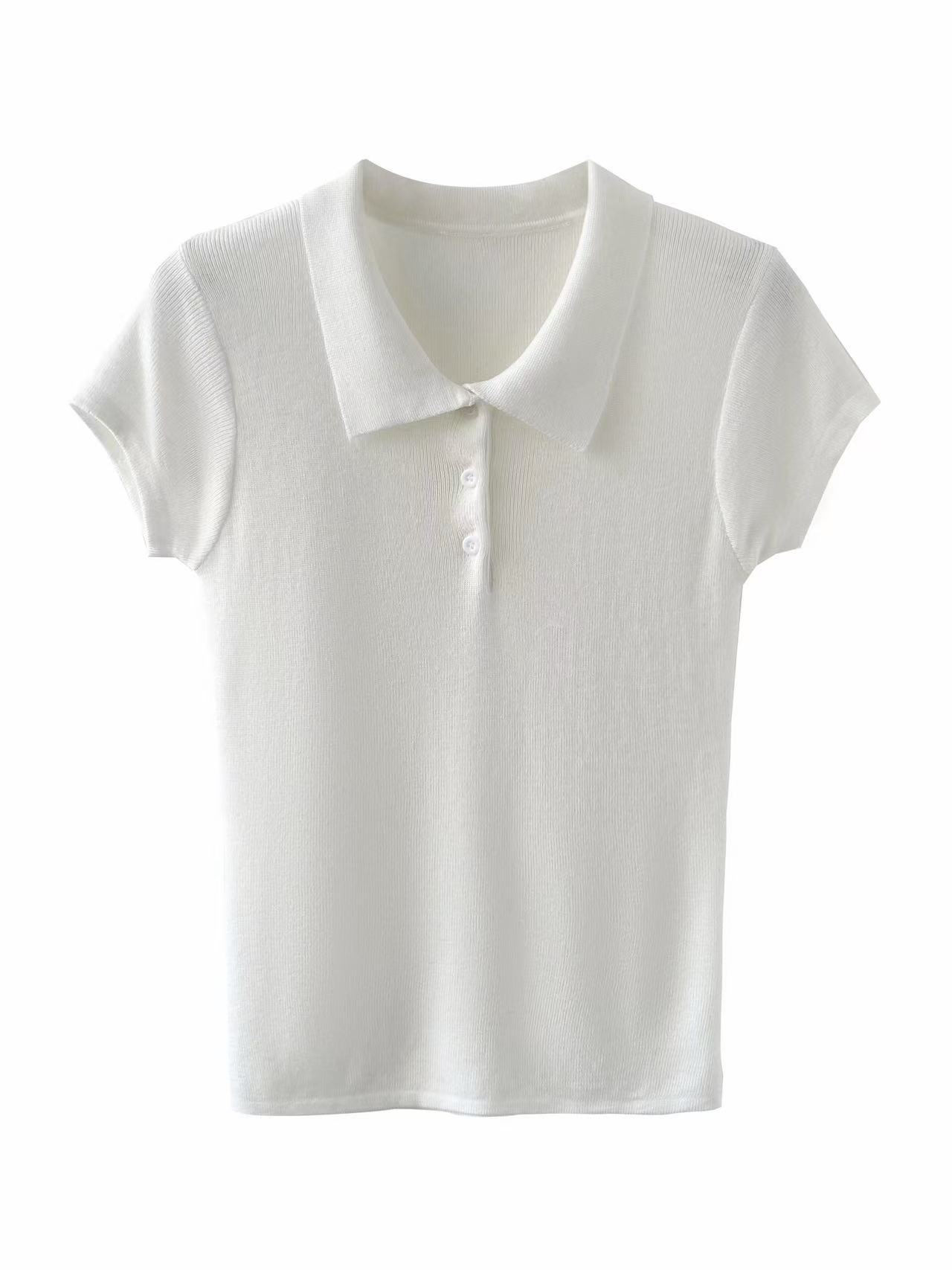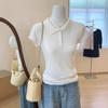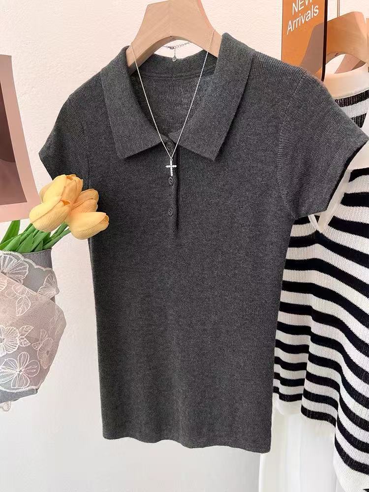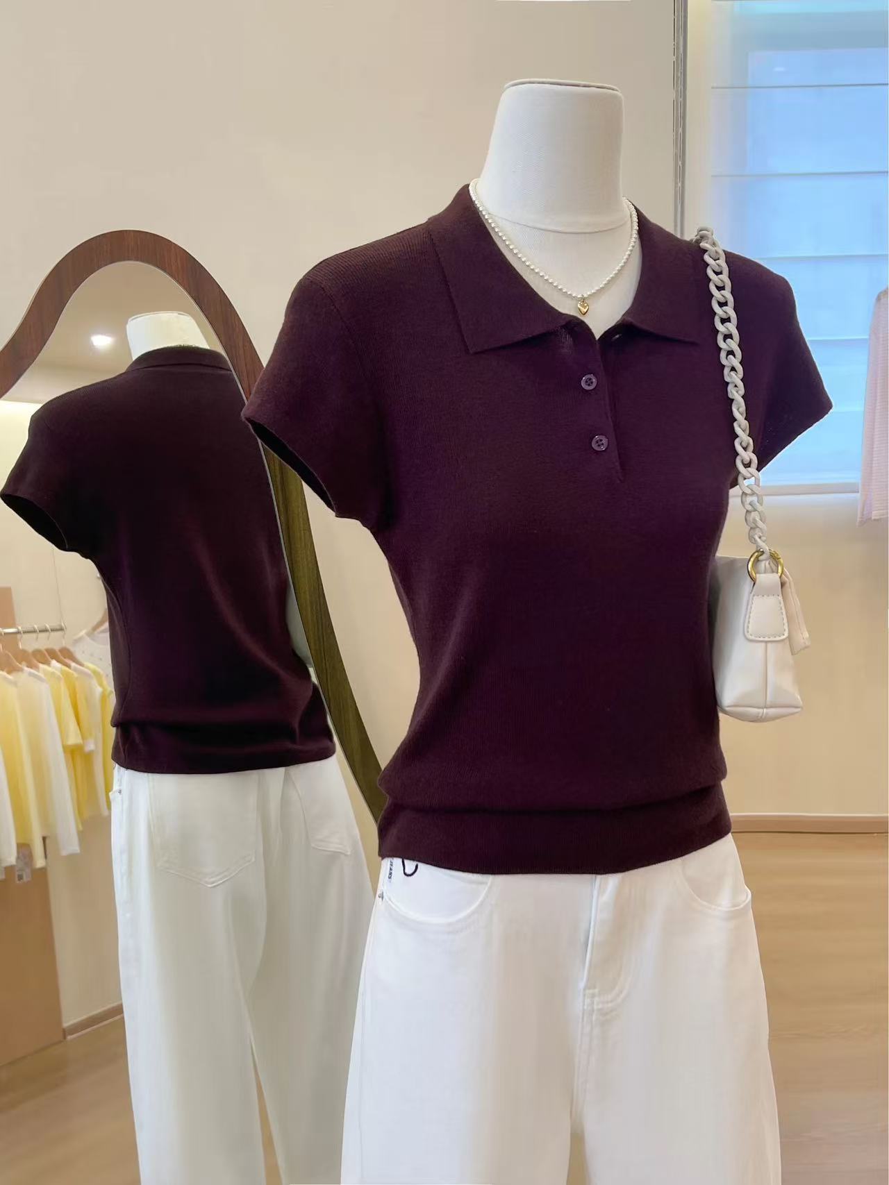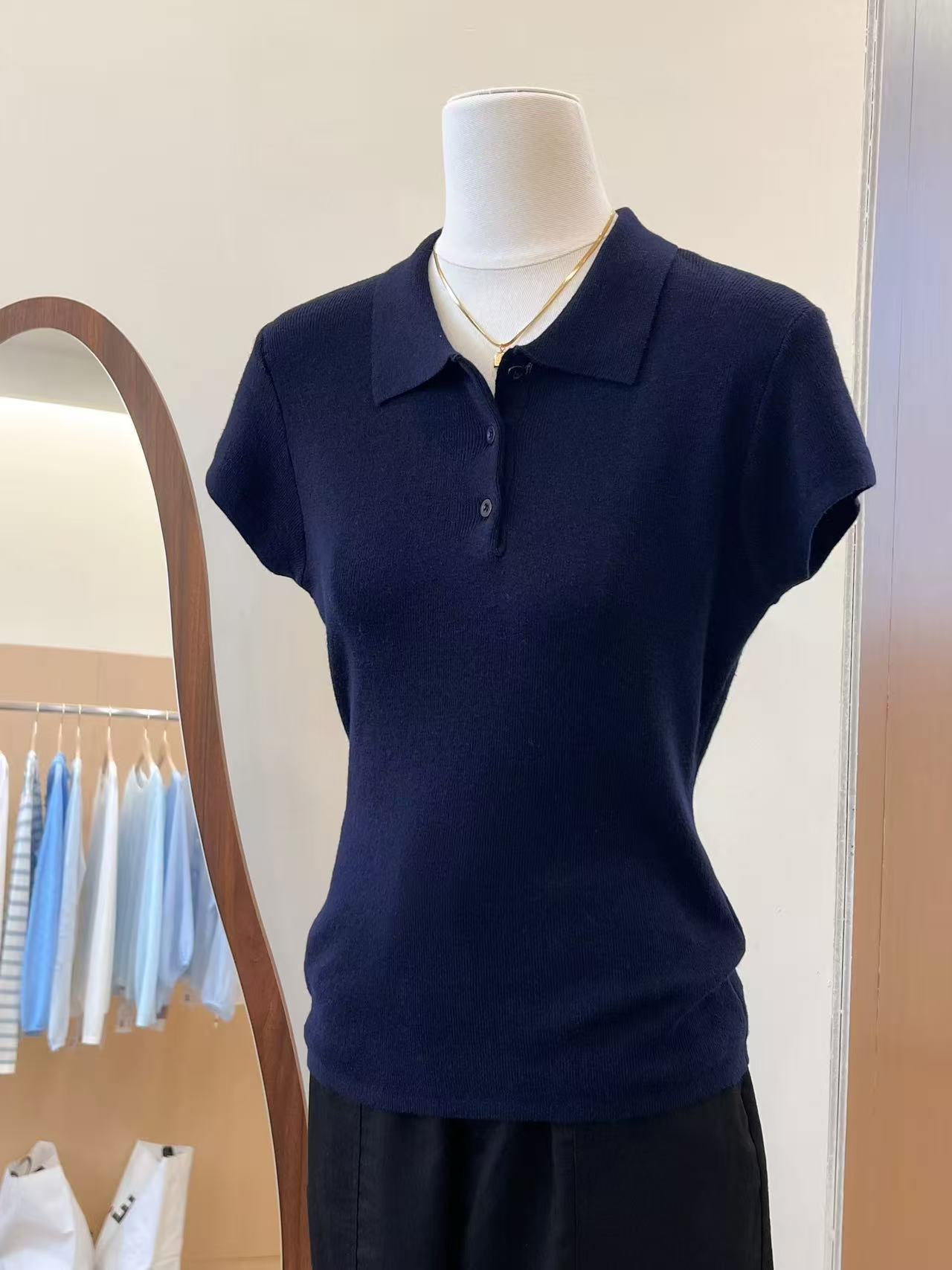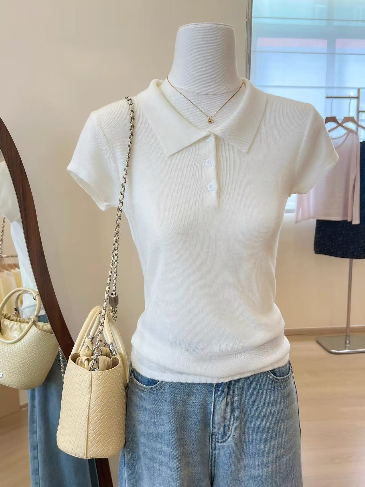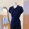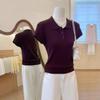 Temperamento francés polo cuello tejido camiseta de manga corta mujer 2025 nuevo verano alta gama delgada y adelgazante top de media manga